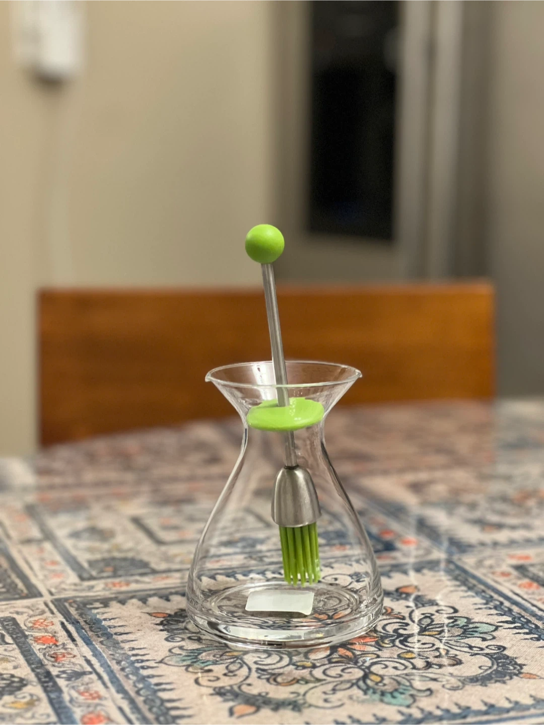 Glass condiment bottle with a green silicone brush attached to the lid. It's perfect for basting or applying sauces and oils! Measurements are not specified, but it's a convenient size for your kitchen.