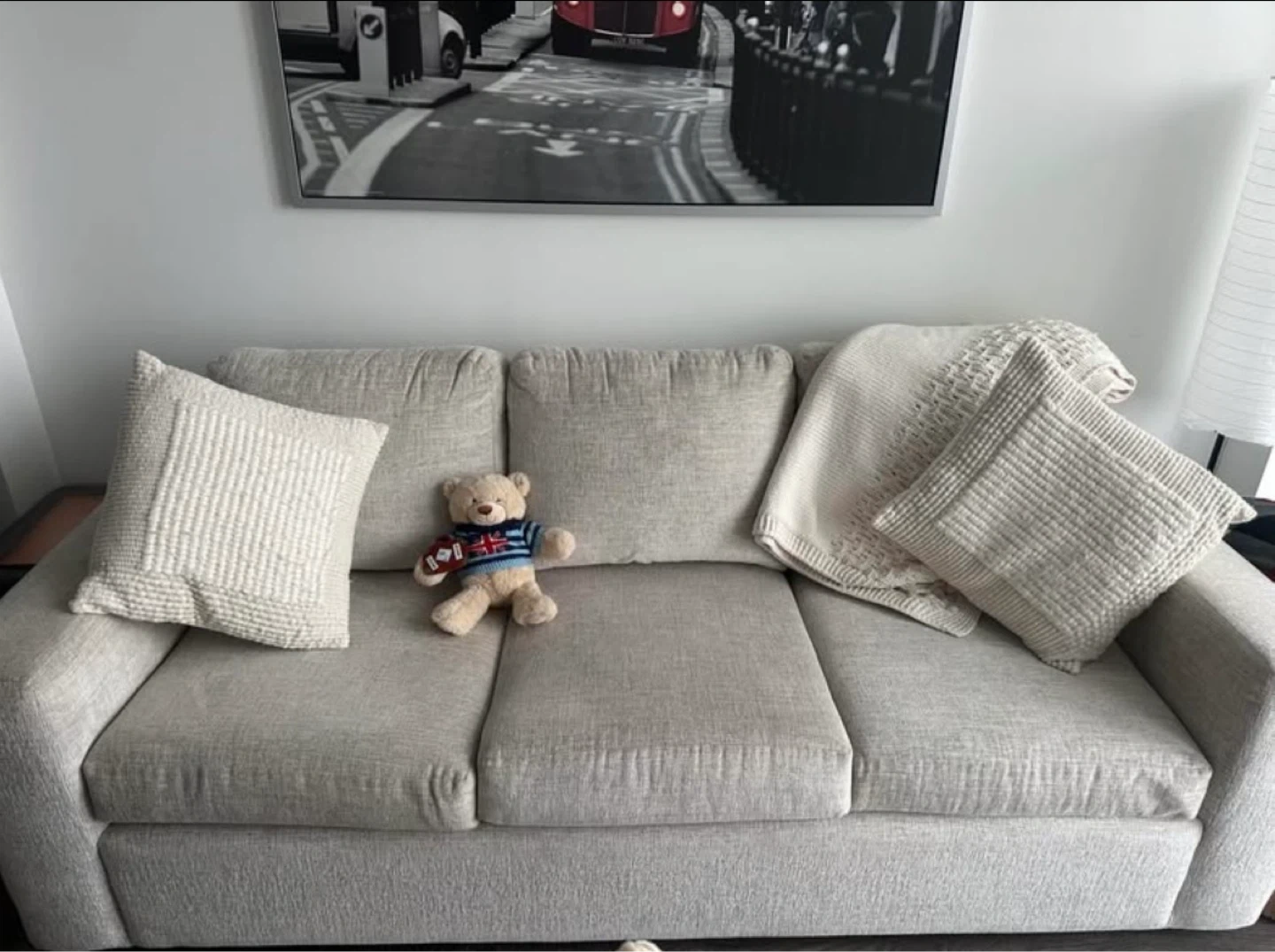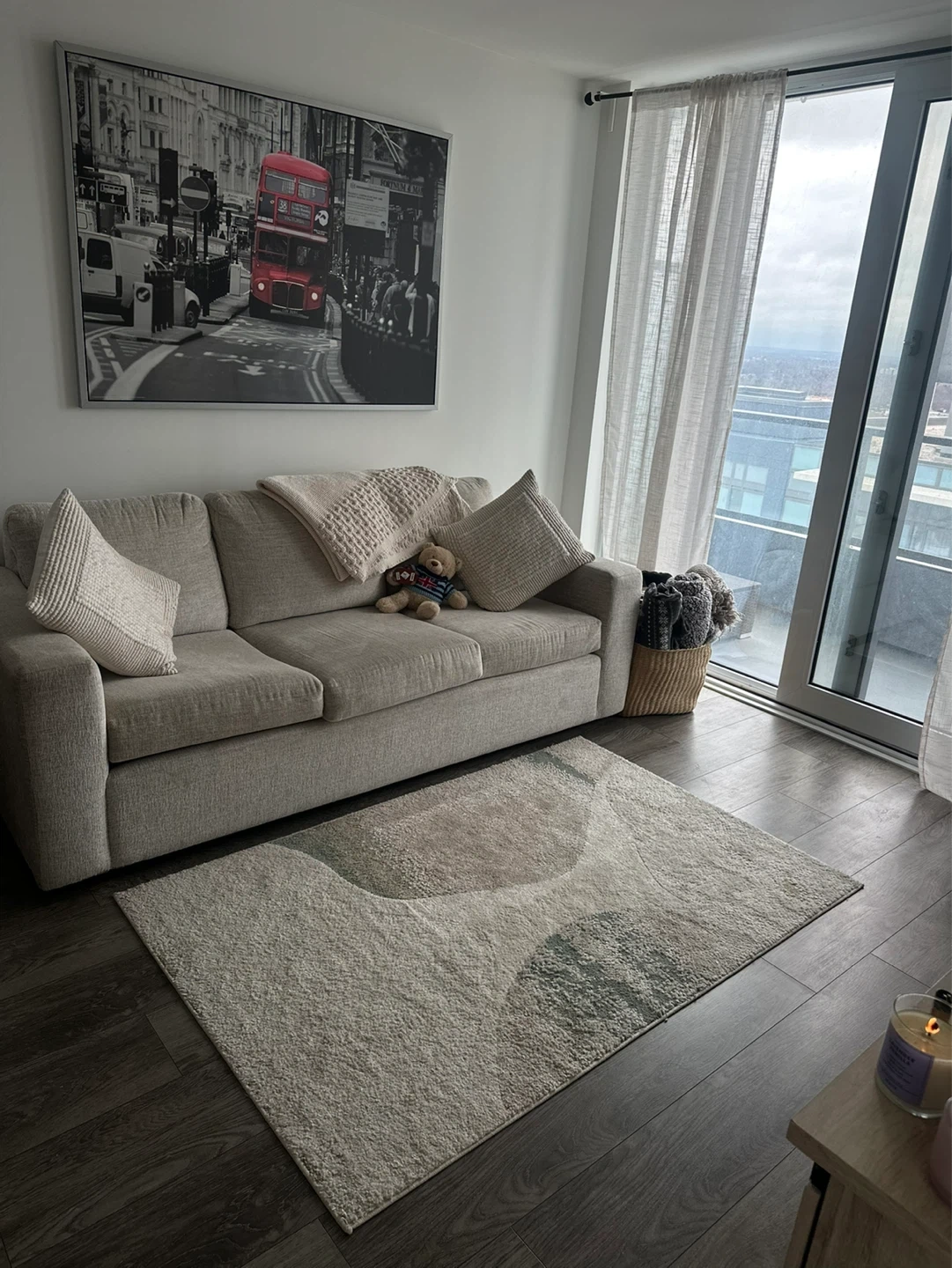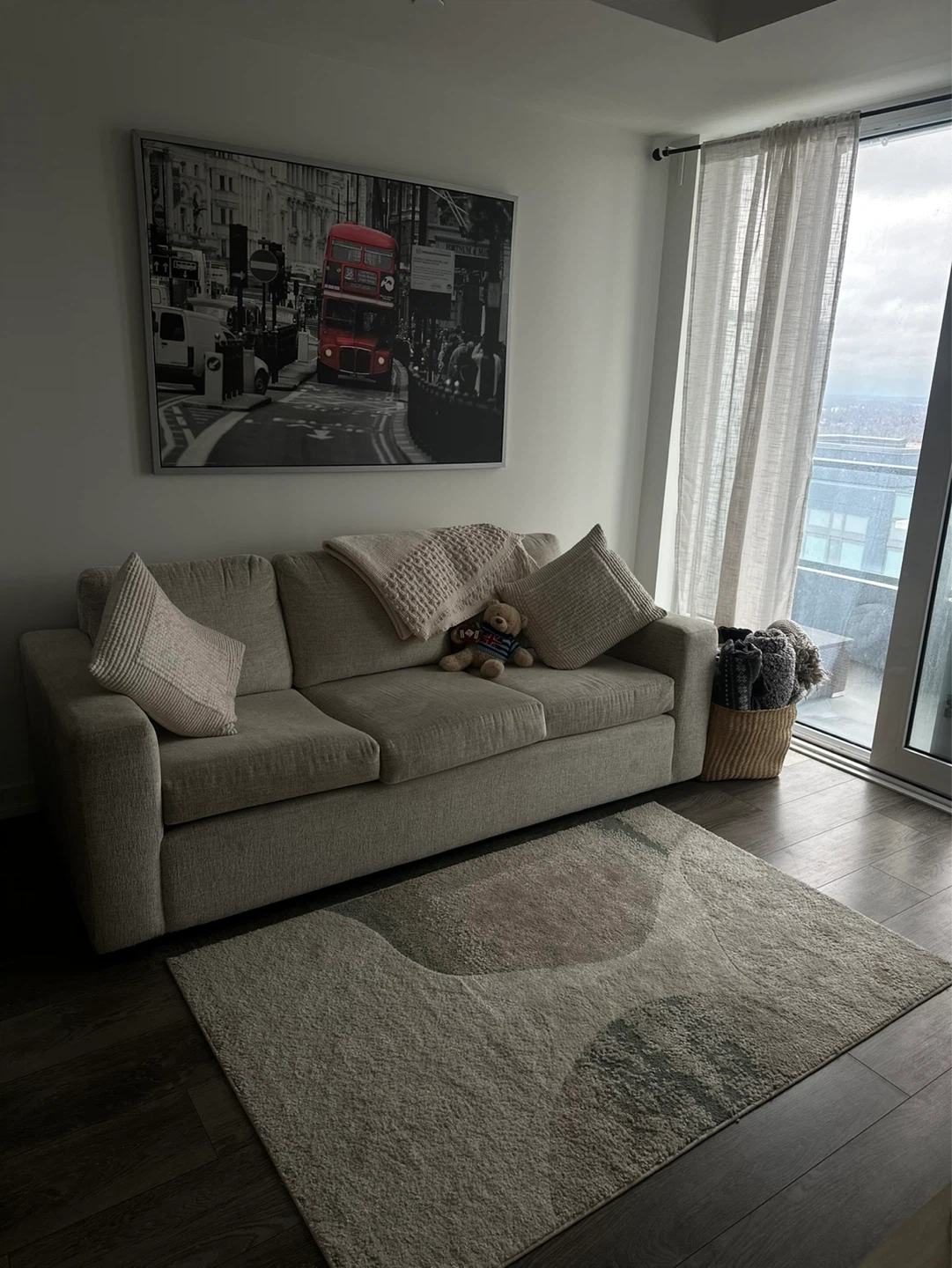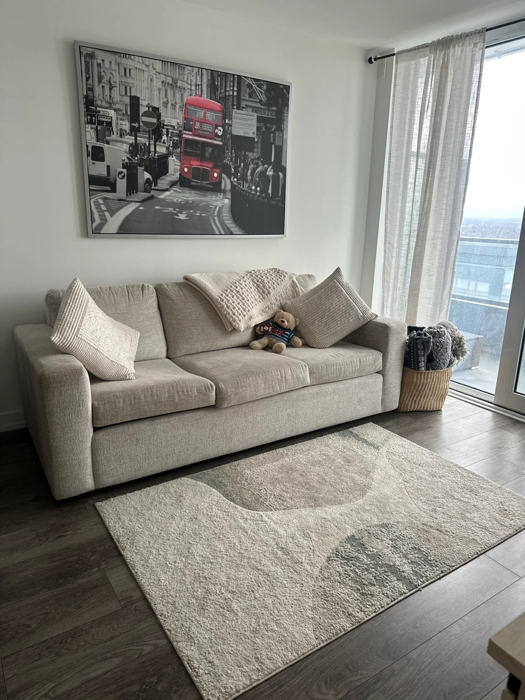 This is a three-seater beige fabric sofa, featuring plush accent pillows and a cozy throw. It's perfect for your living room or den. The neutral colour fits with most decor styles! Also selling the carpet if interested :)