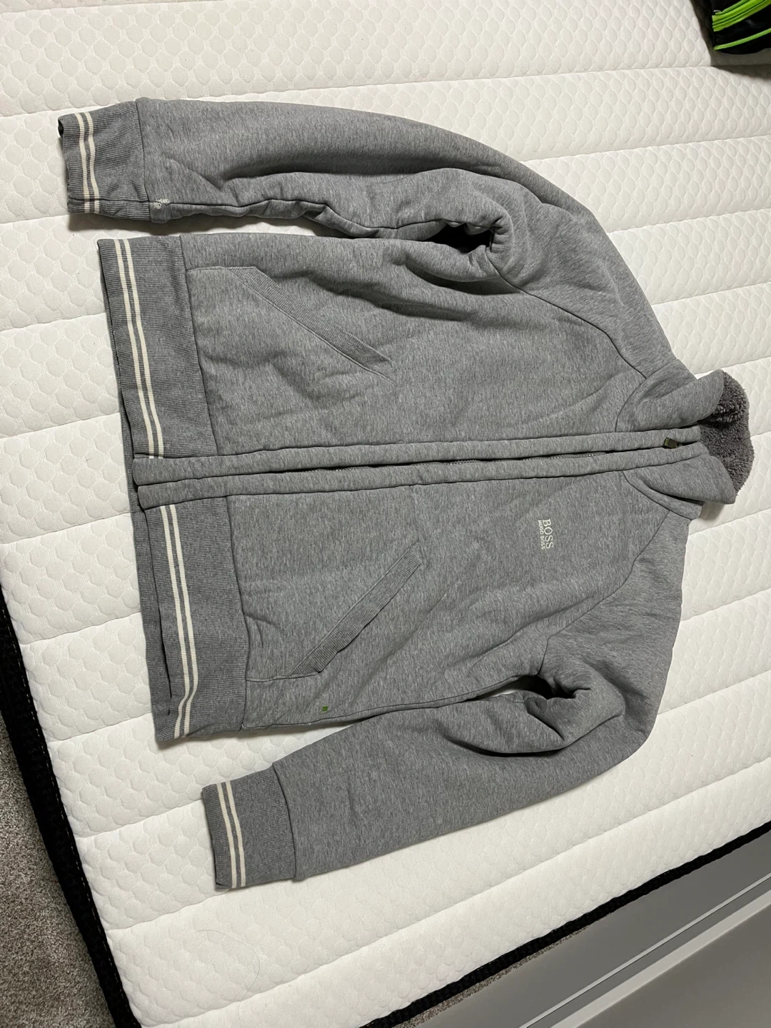 Selling a Hugo Boss zip-up sweater in a nice grey colour. It's in great condition and ready for a new owner! Perfect for layering or wearing on its own.