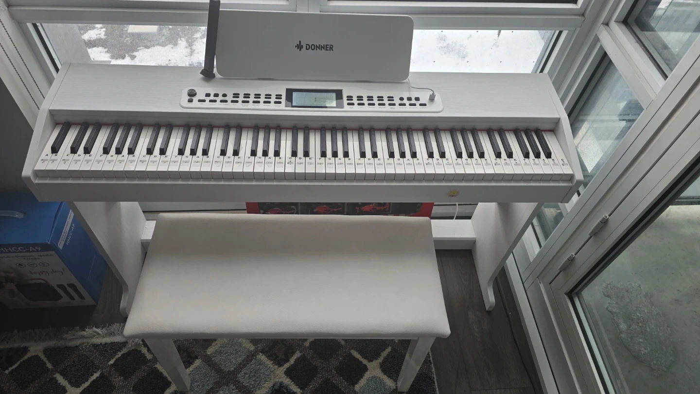 Selling a Donner DDP-95 digital piano in white, complete with a matching bench! This piano is perfect for beginners or experienced players looking for a compact and stylish instrument. It features weighted keys for a realistic feel and a variety of built-in sounds and rhythms. Comes with 3 pedals!