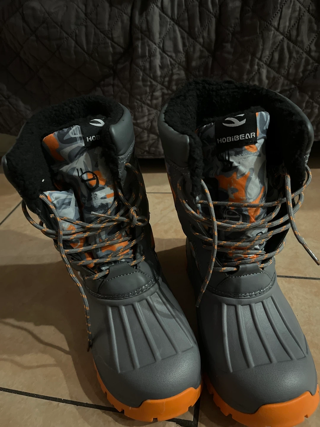 Selling a pair of HOBI BEAR winter snow boots. They are gray with orange accents and have a camouflage pattern on the inside lining. Great for keeping your feet warm and dry during the winter months!