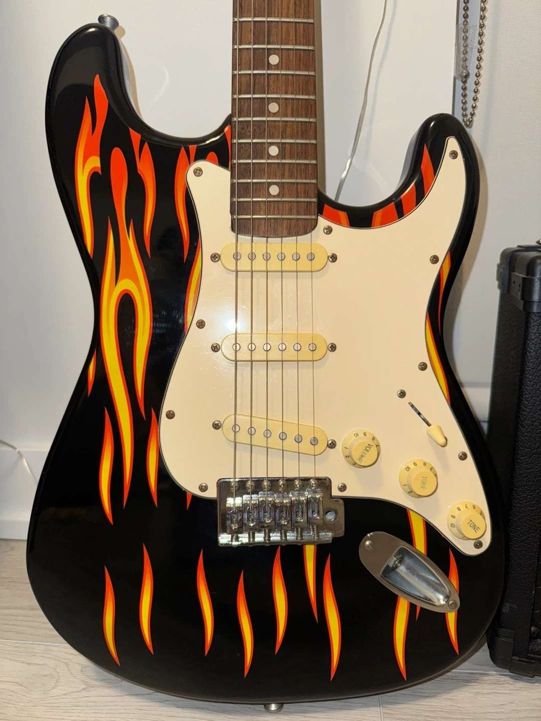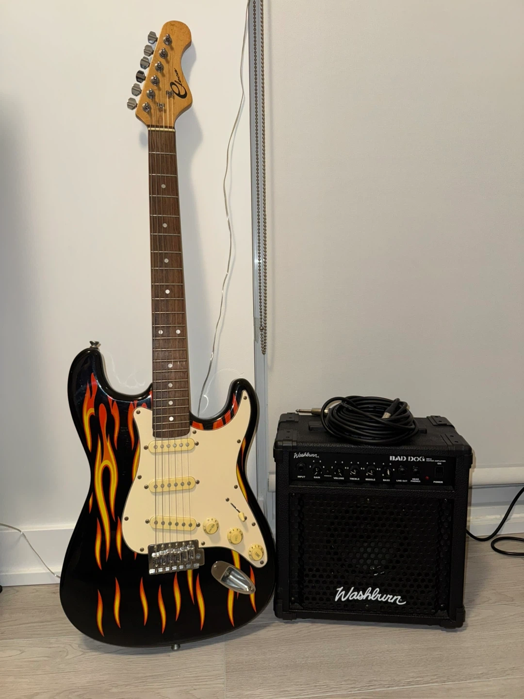 This is a black electric guitar with a flame design. It comes with a Washburn Bad Dog 10W amplifier and a cable. Perfect for aspiring guitarists!