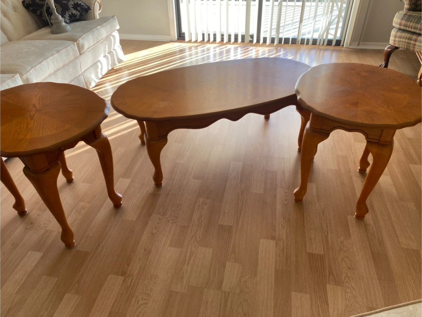 Set includes one oval coffee table and two round end tables. They're made of wood with a warm, natural finish and feature elegant, carved legs. Add a classic touch to your living space!