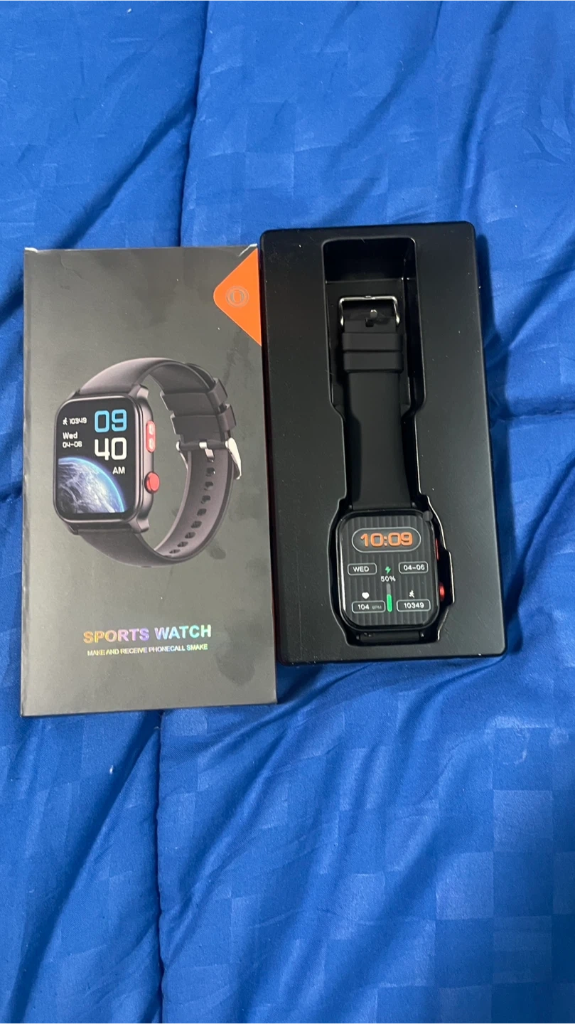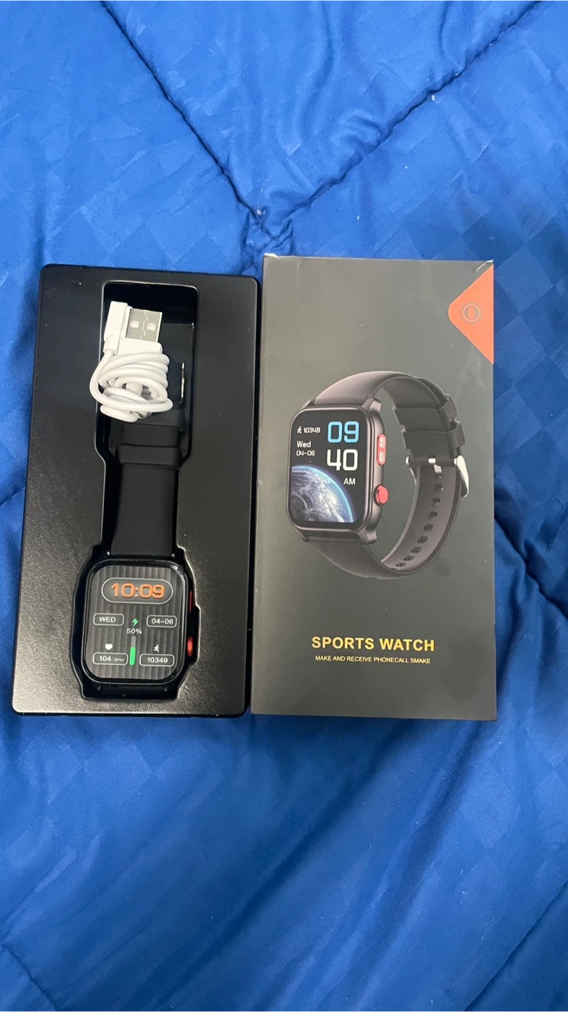This sports watch allows you to make and receive phone calls. It includes the watch, a charging cable, and the original box. The display shows time, date, heart rate, and step count, ect.