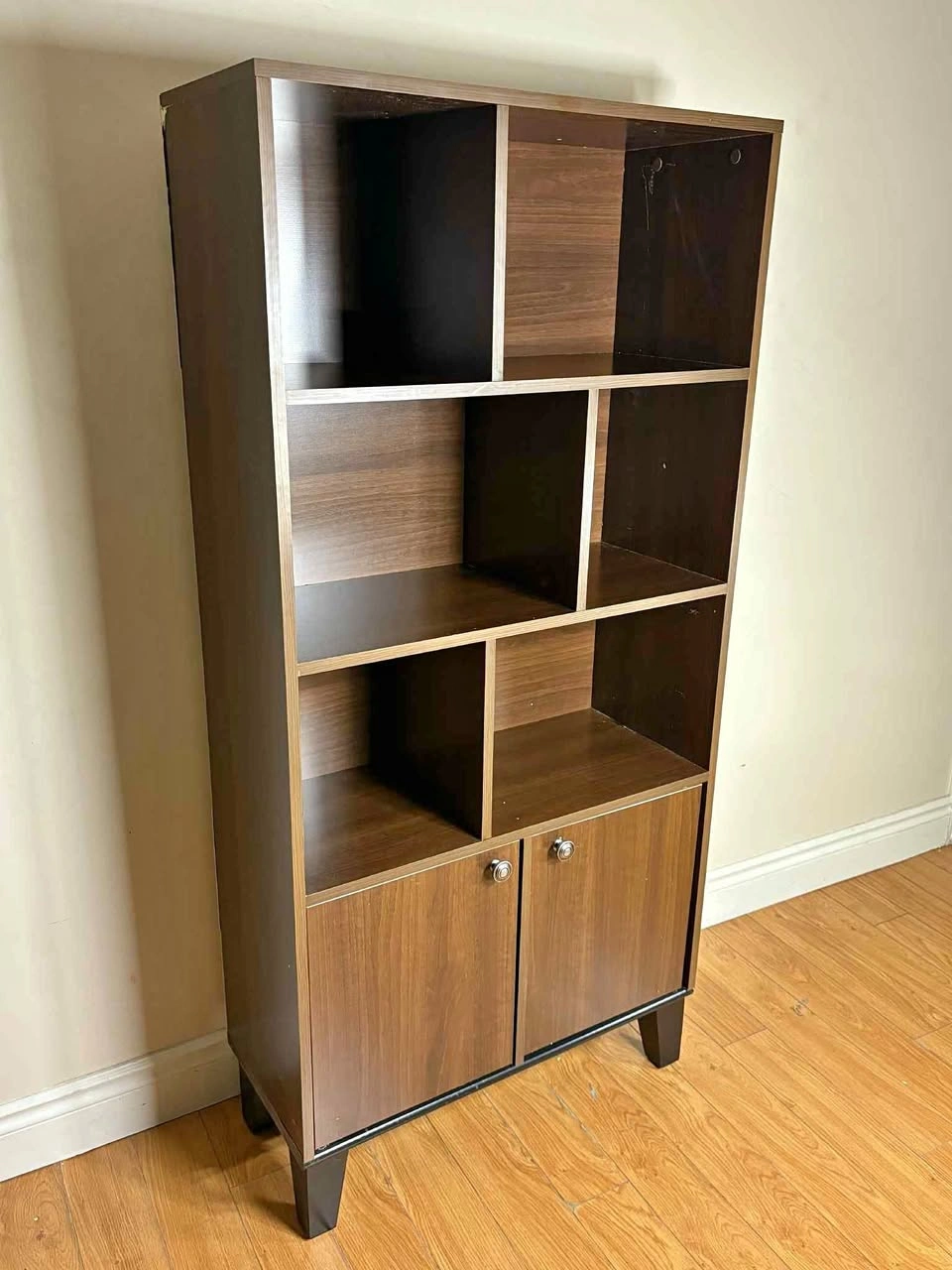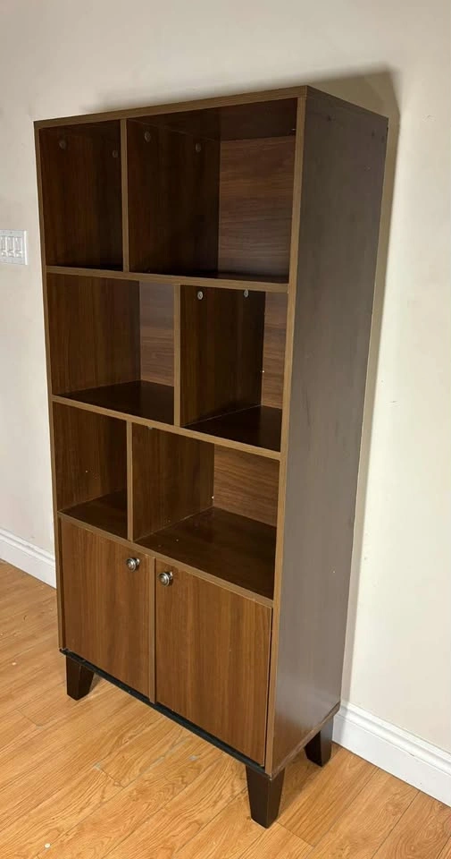 85Sleek and modern cube-style bookshelf with built-in cabinet storage at the bottom β perfect for organizing books, decor, or small essentials. πͺ΅ Dark wood finish π 6 open shelves in a modern geometric layout πͺ 2 lower cabinet doors with metal knobs πͺ Fully assembled and sturdy β ready to use βοΈ Note: Has some minor cosmetic wear on the back corner β purely visual, doesn't affect stability or function. Priced accordingly. Use it in your living room, home office, bedroom, or hallway for a stylish, functional storage upgrade. β Clean and solid condition overall π Contact: Message directly here or call/text 289β788β8085 with any questions β happy to help.