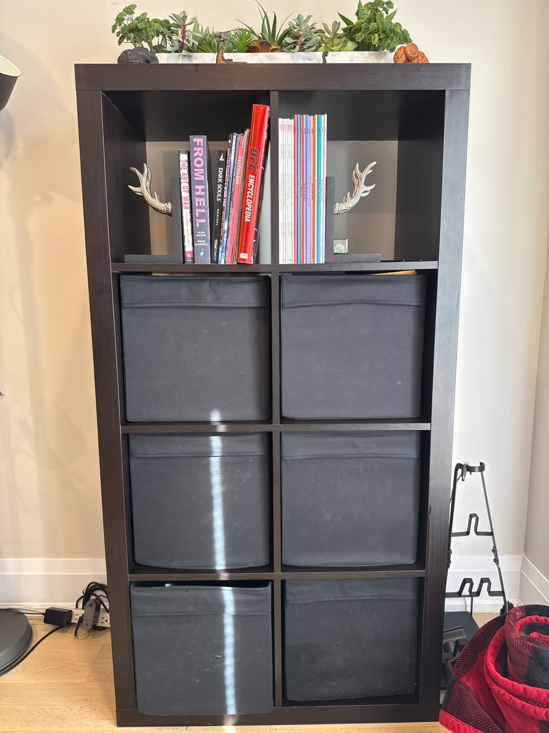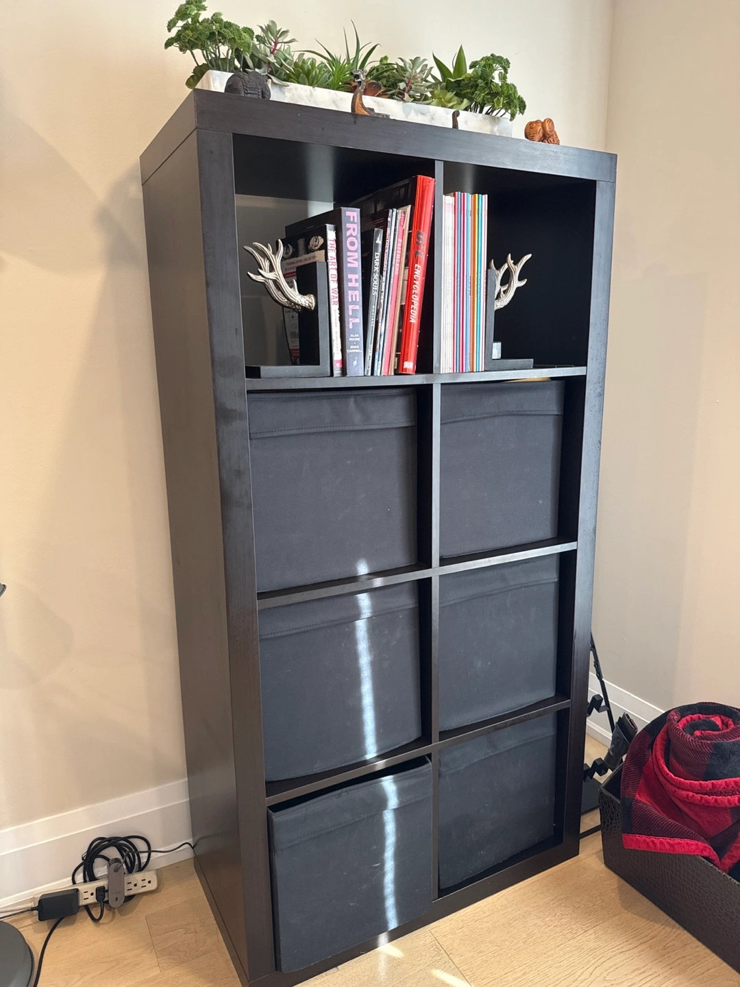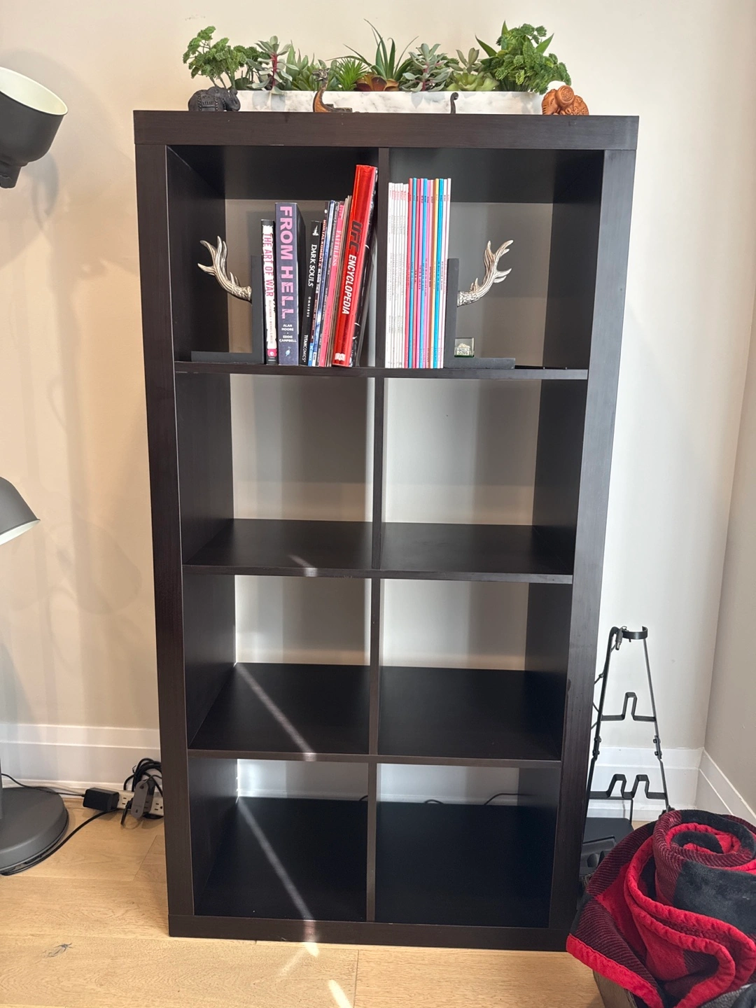 NEED GONE ASAP, black shelf unit, perfect for organizing your space! It has a classic design that fits well in any room. Dark brown wood colour. Comes with all 6 storage cubes. Had for a long time minor scratches and imperfections need out of the house by Wednesday night! PICKUP ONLY