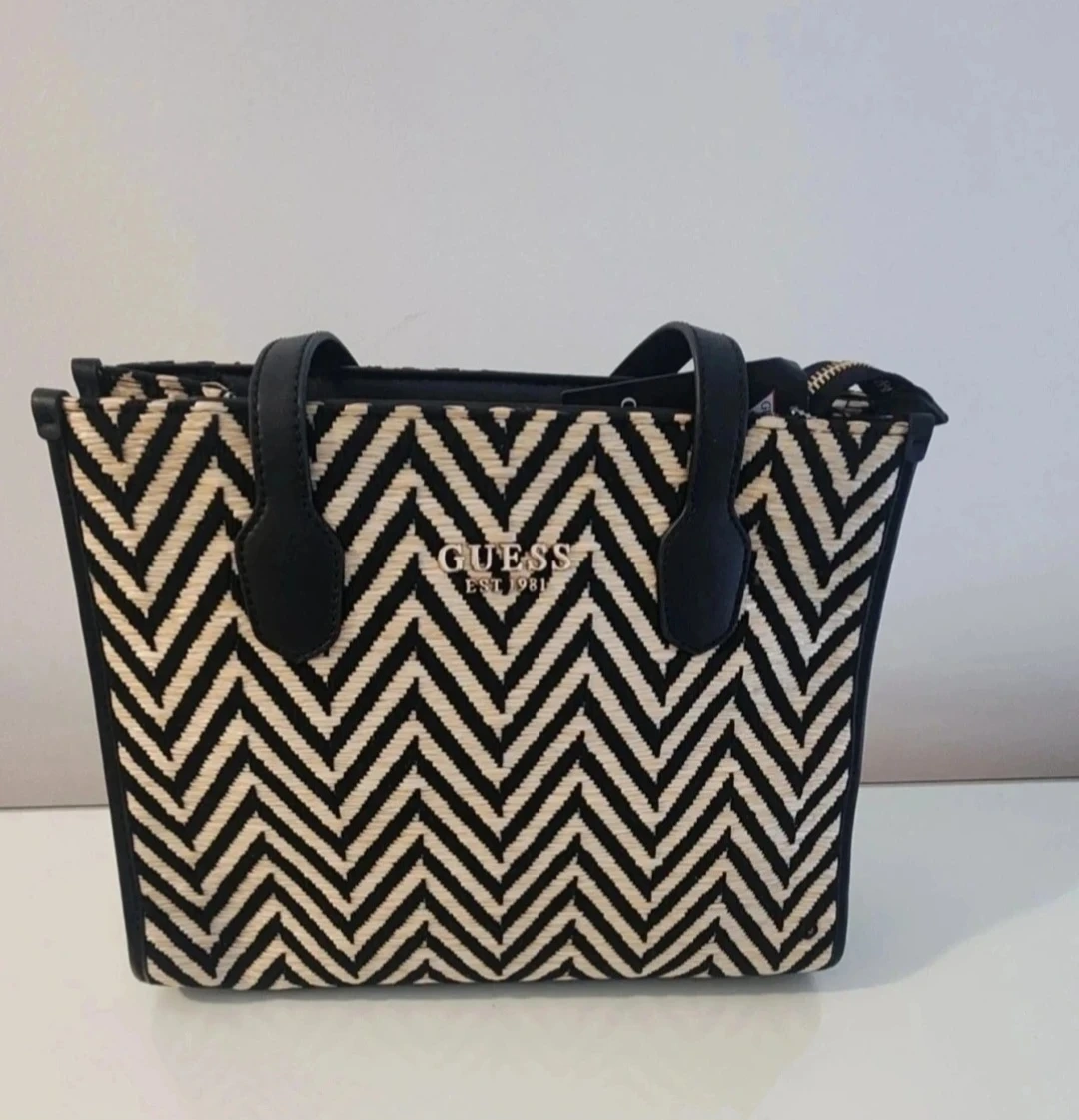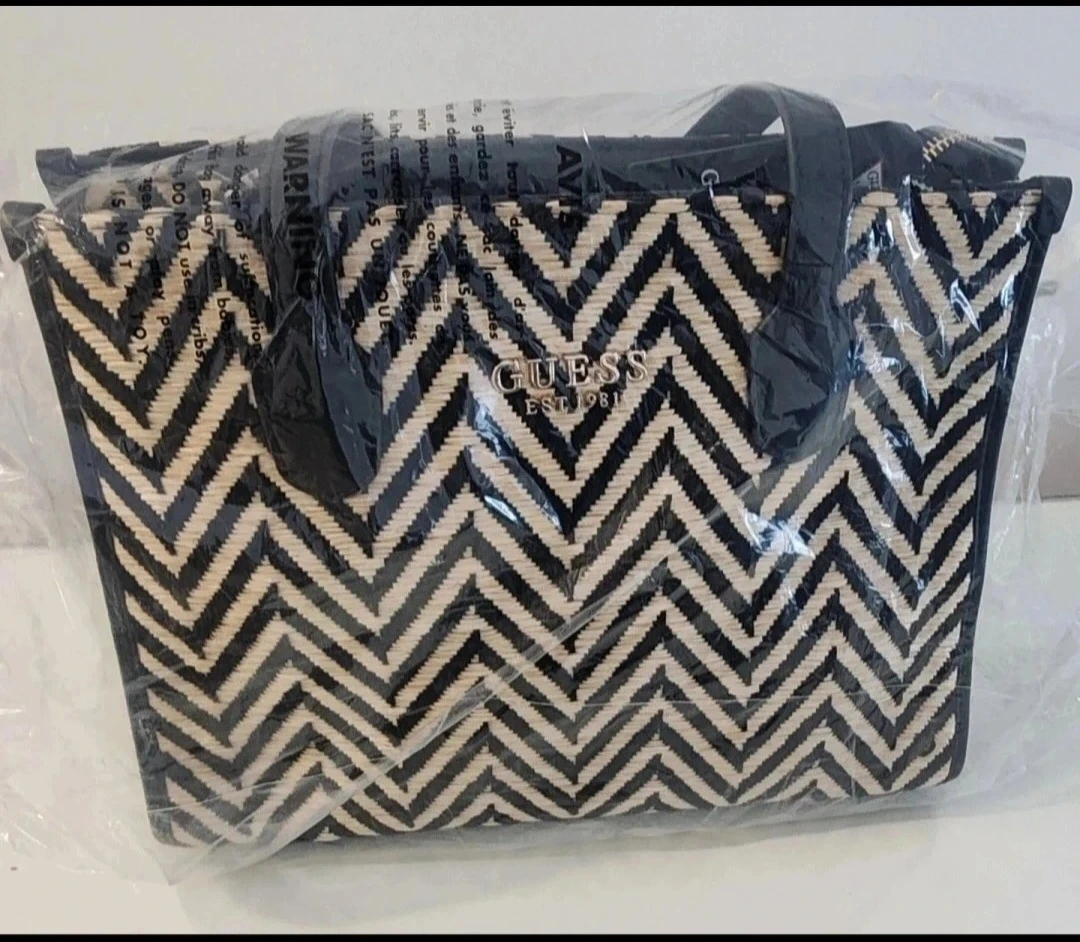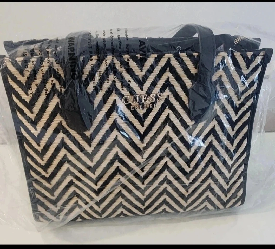 This GUESS tote bag features a black and white chevron pattern with black faux leather accents. It's a medium-sized bag with a zippered closure. Comes with original tags and is still in its plastic packaging.
