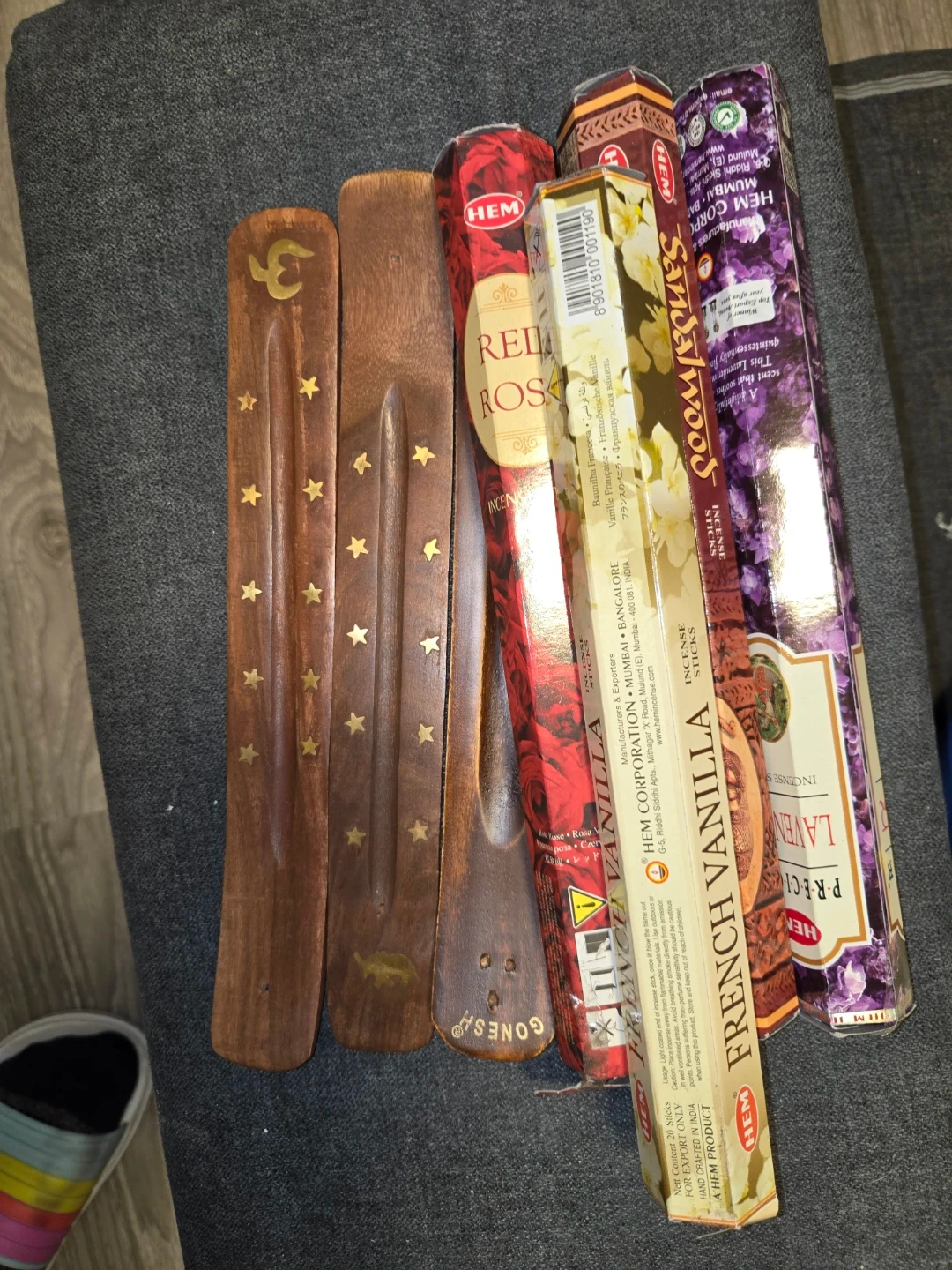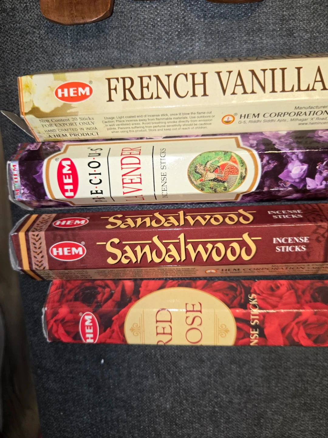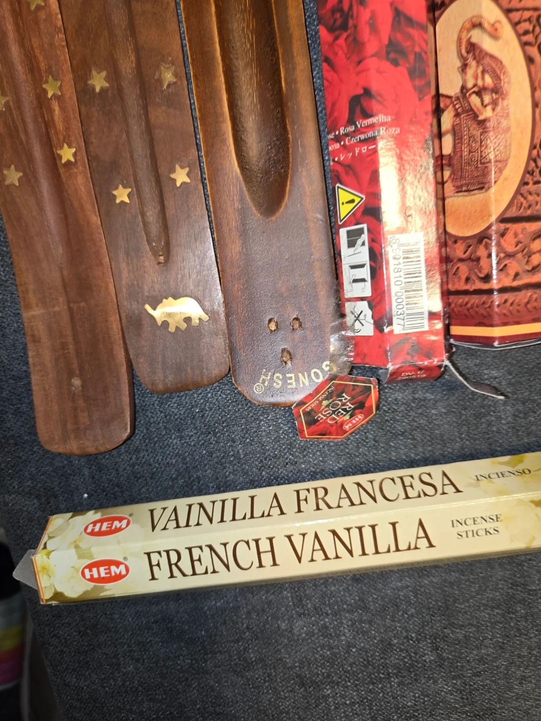 Includes several wooden incense stick holders, some with decorative star and moon designs. Also includes HEM brand incense sticks in French Vanilla, Sandalwood, and Red Rose scents. Incense stick boxes contain 20 sticks each.