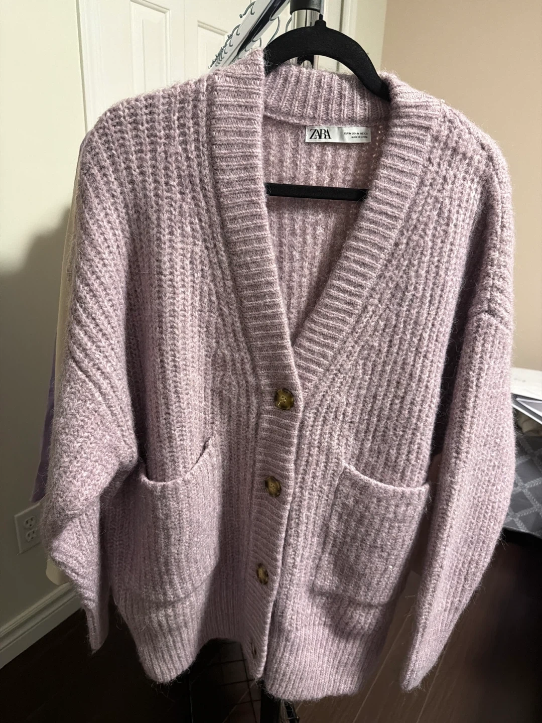 Lavender knit cardigan sweater from ZARA. It's a size medium with button closure and front pockets. Material is a soft, textured knit.