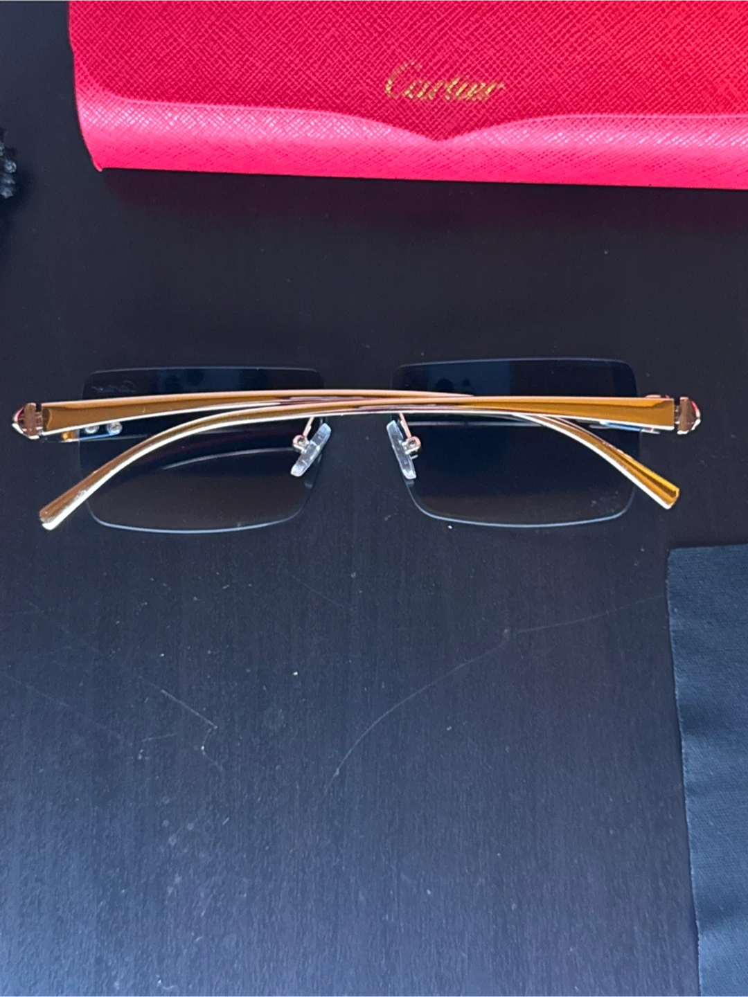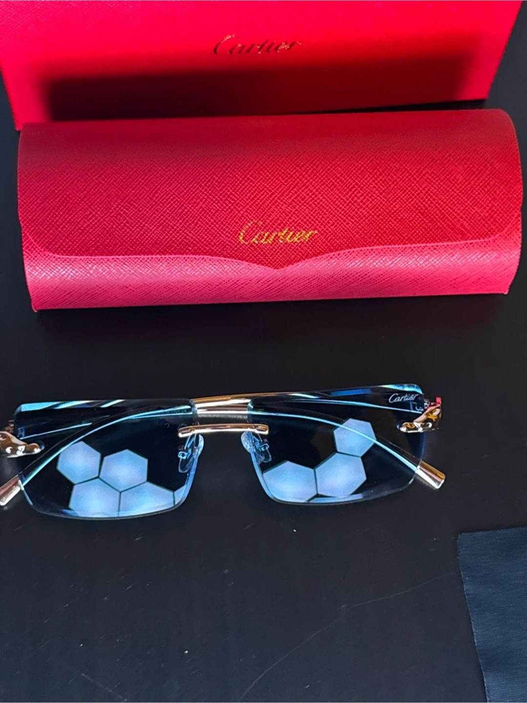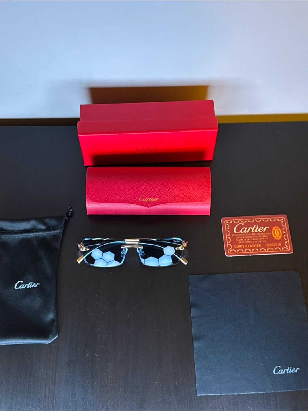 Authentic Cartier rimless eyeglasses. Includes original red box, hard case, cleaning cloth, and pouch. These glasses feature a stylish gold-tone frame and lenses with a unique hexagonal pattern. A statement piece for any collection!