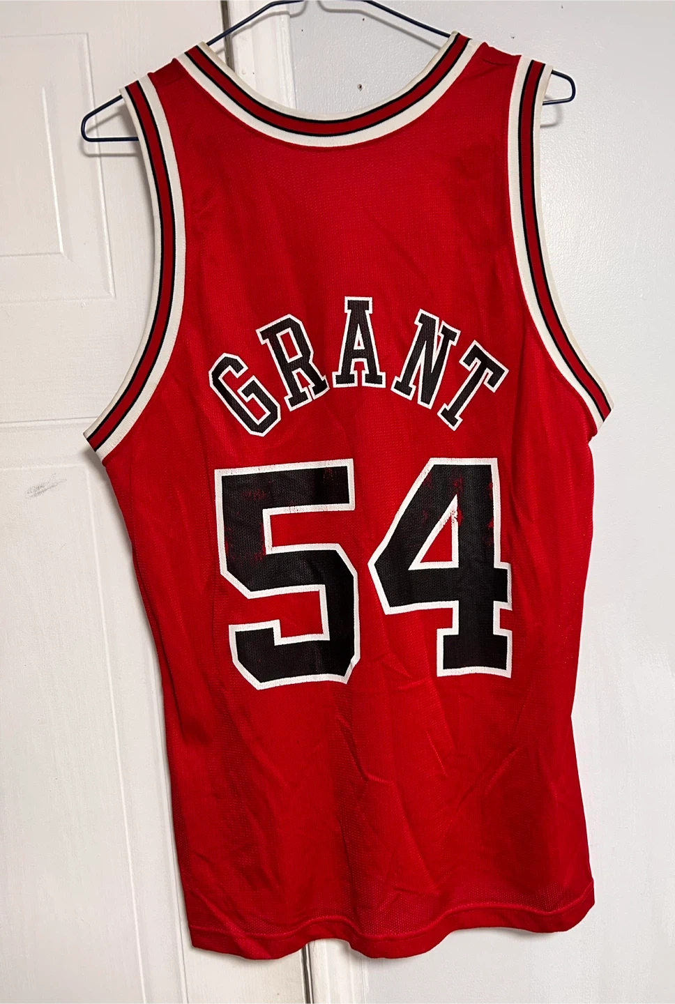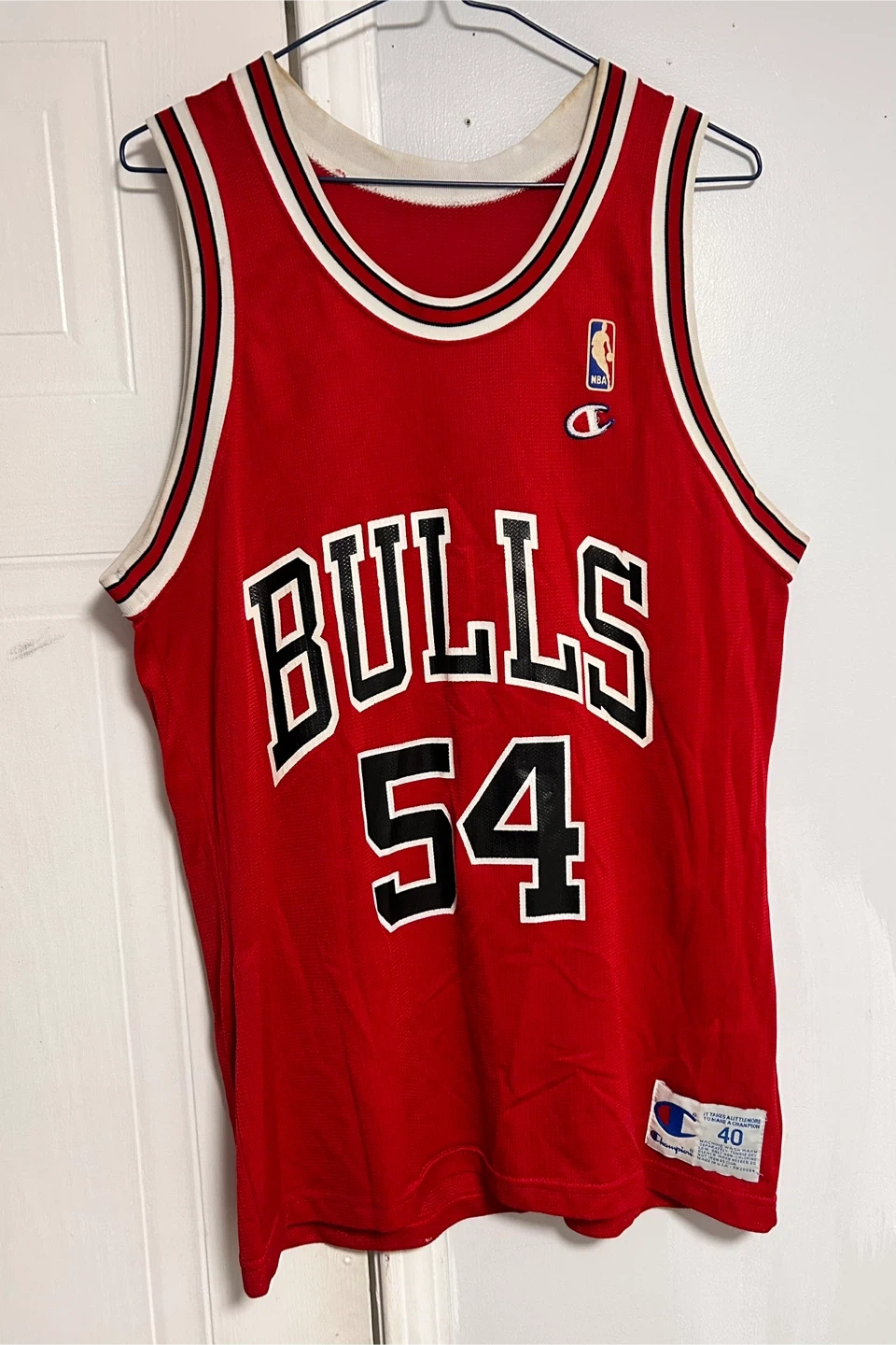 This is a Champion brand Chicago Bulls jersey featuring Horace Grant # 54. It's a size 40 and made in the U.S.A. Great for any basketball fan! Some Faded part on the back # 4