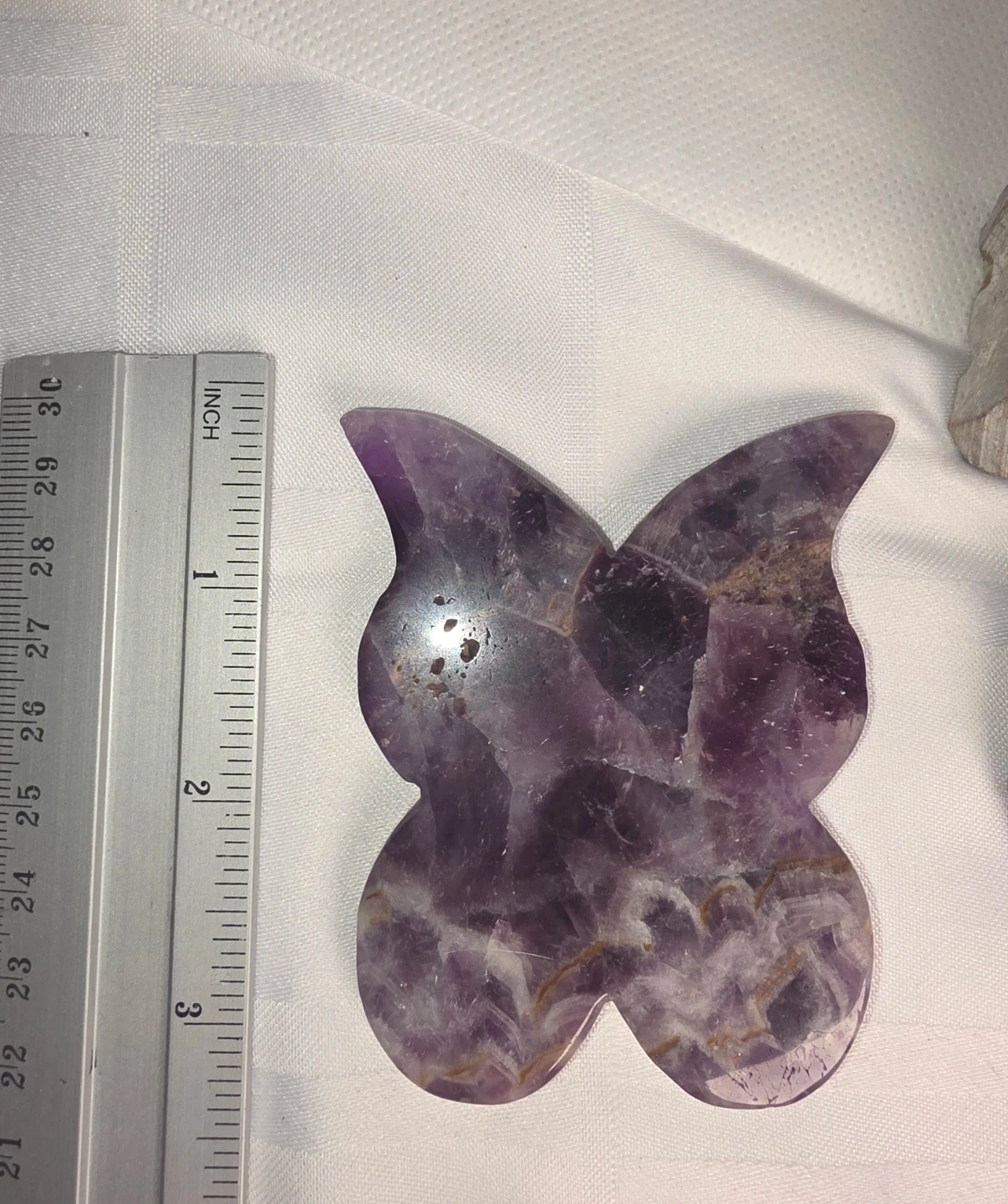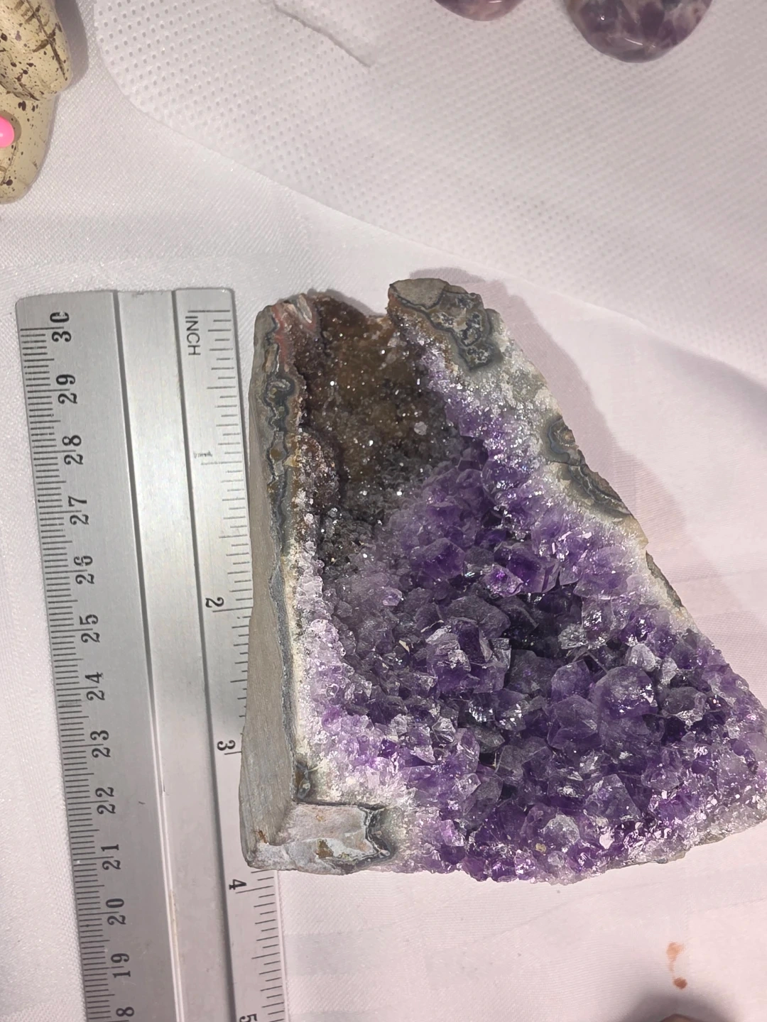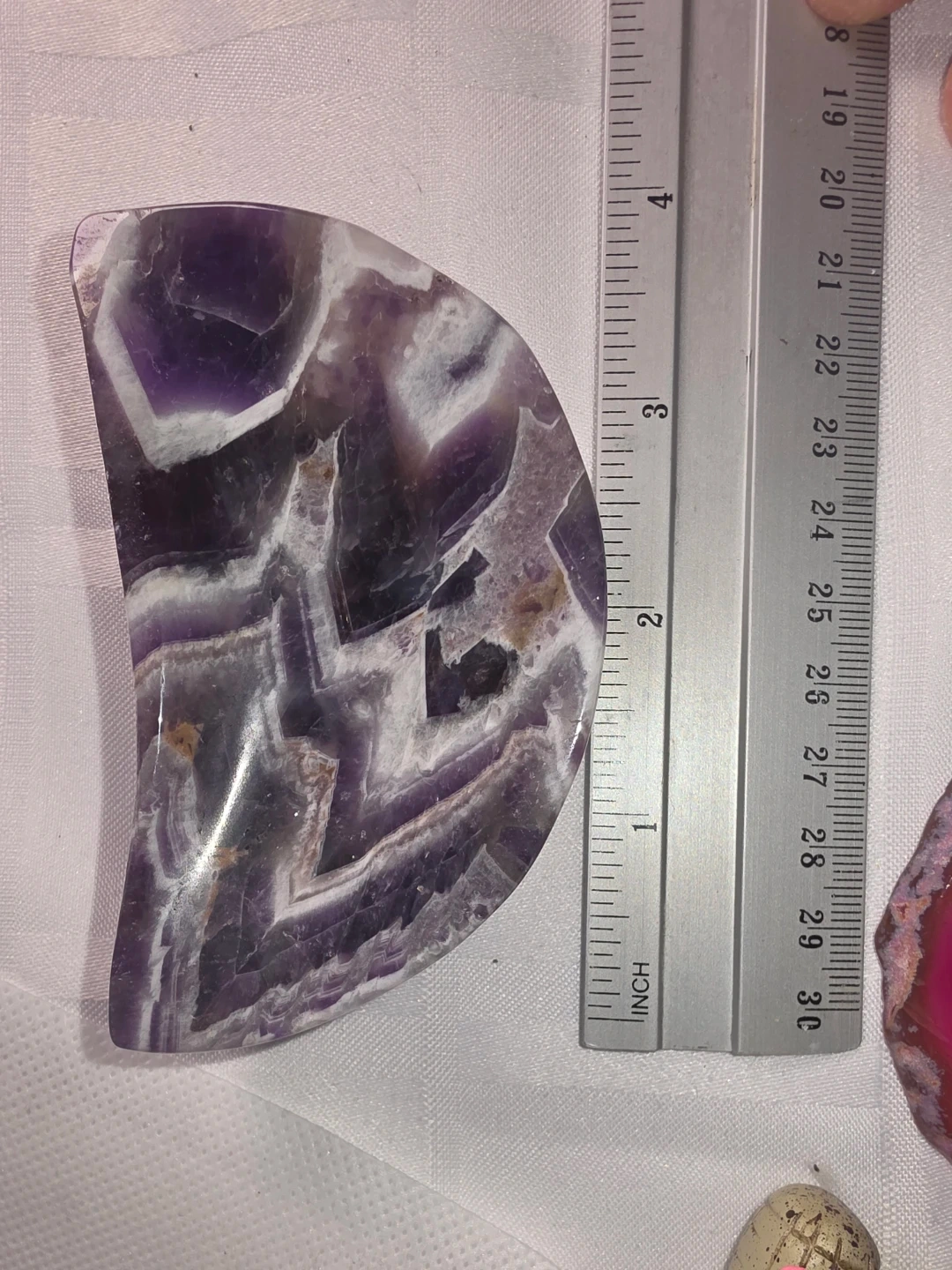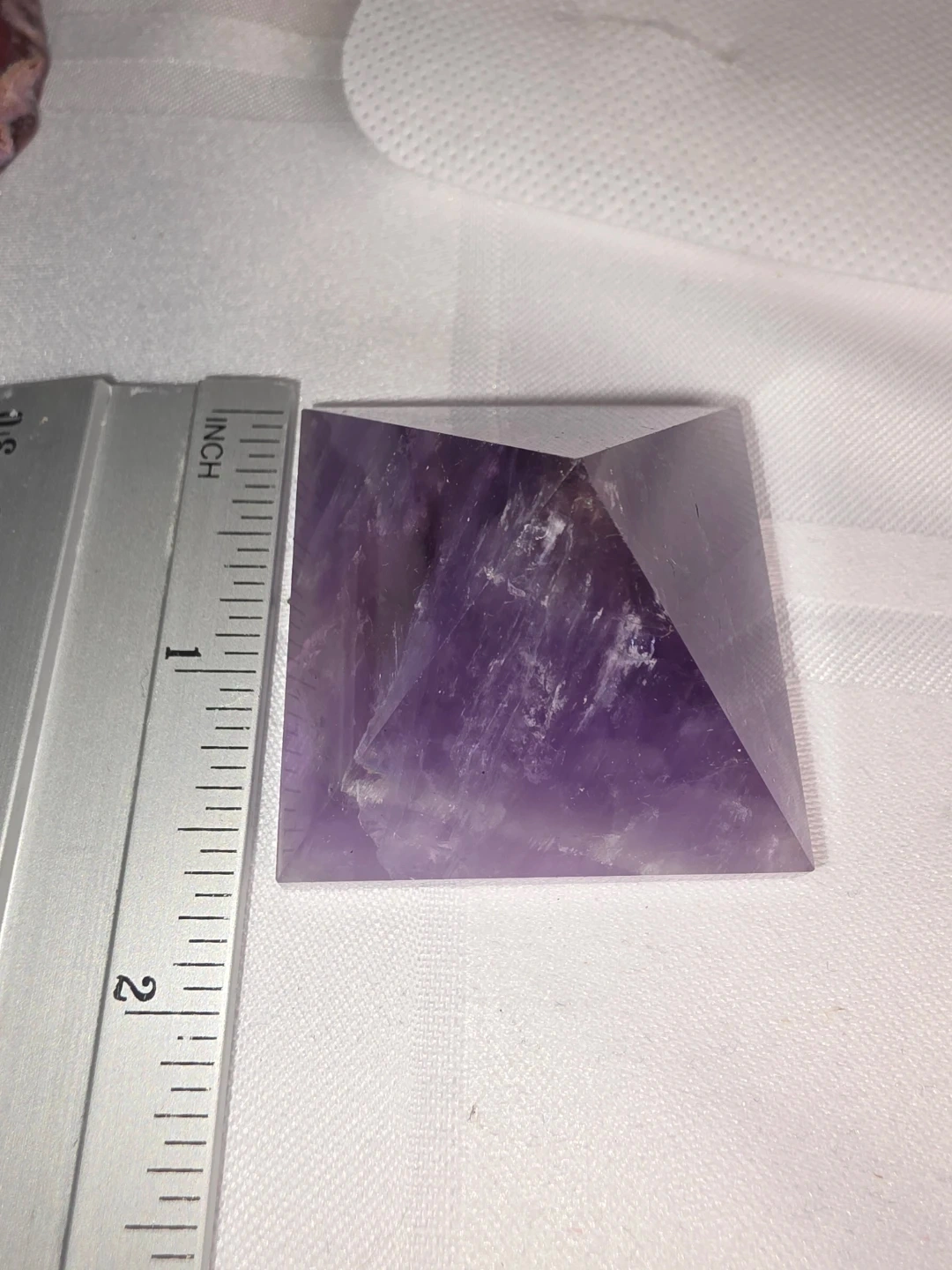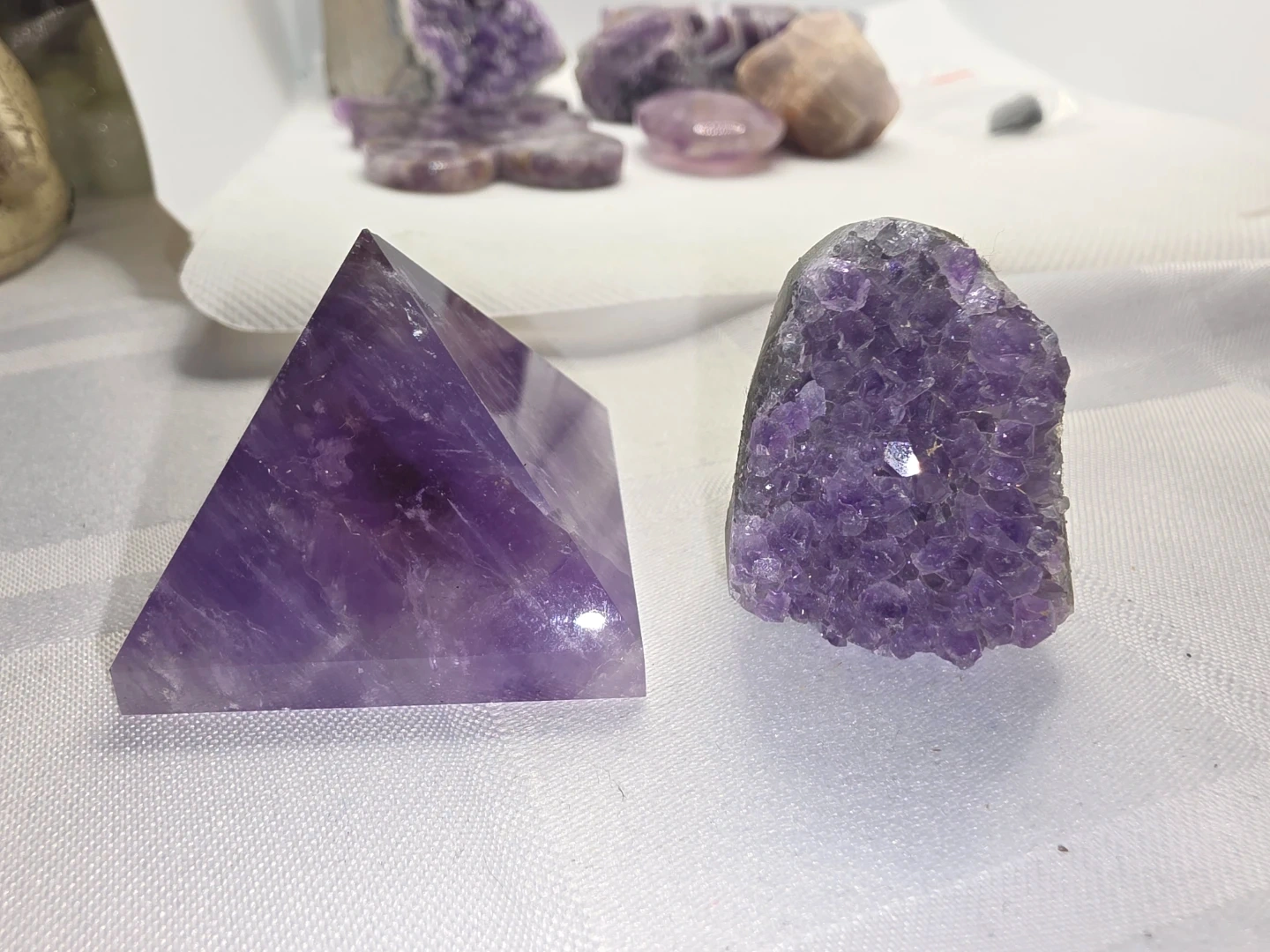 Collection of amethyst crystals, including a pyramid, geode, and carved shapes. Sizes vary, with a large piece measuring approximately 4 inches across. Amethyst is a purple variety of quartz. These pieces add a natural touch to any space.