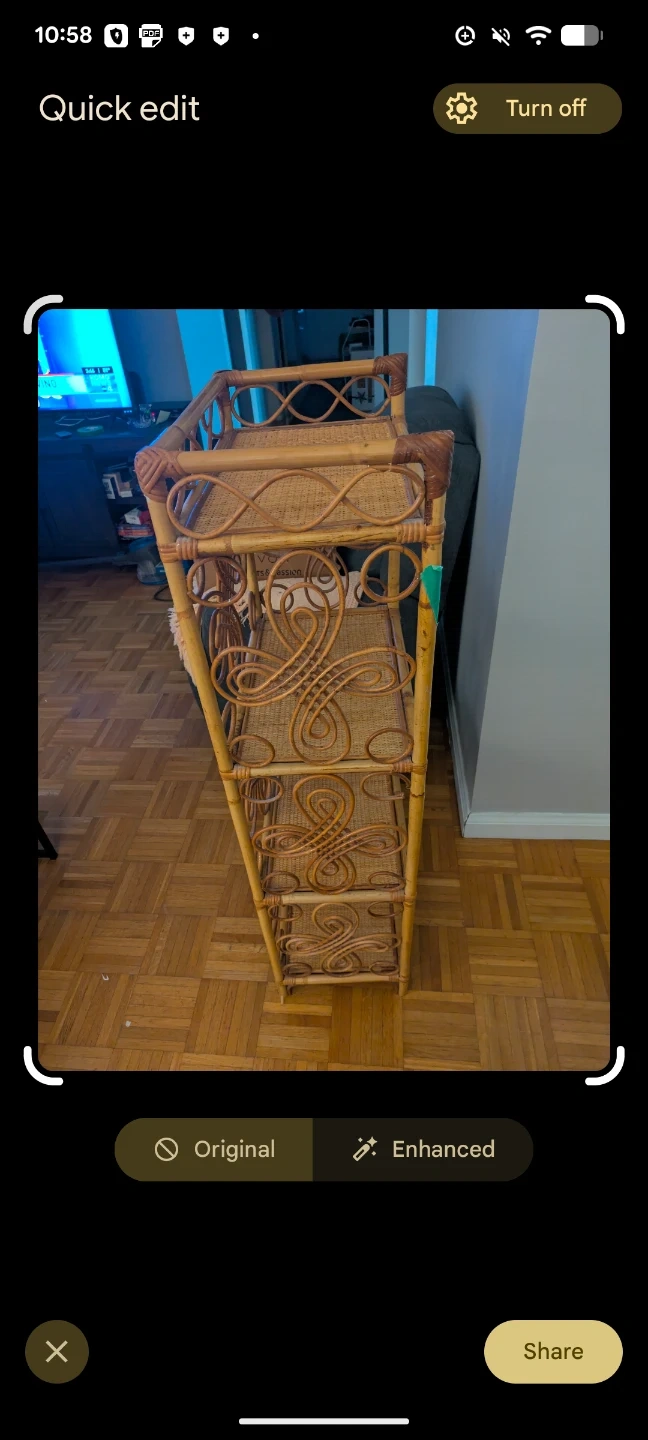 This tall shelf unit is made from bamboo with intricate scrollwork details. It's perfect for displaying plants or decorative items. The material is woven bamboo.