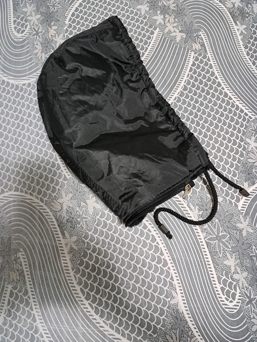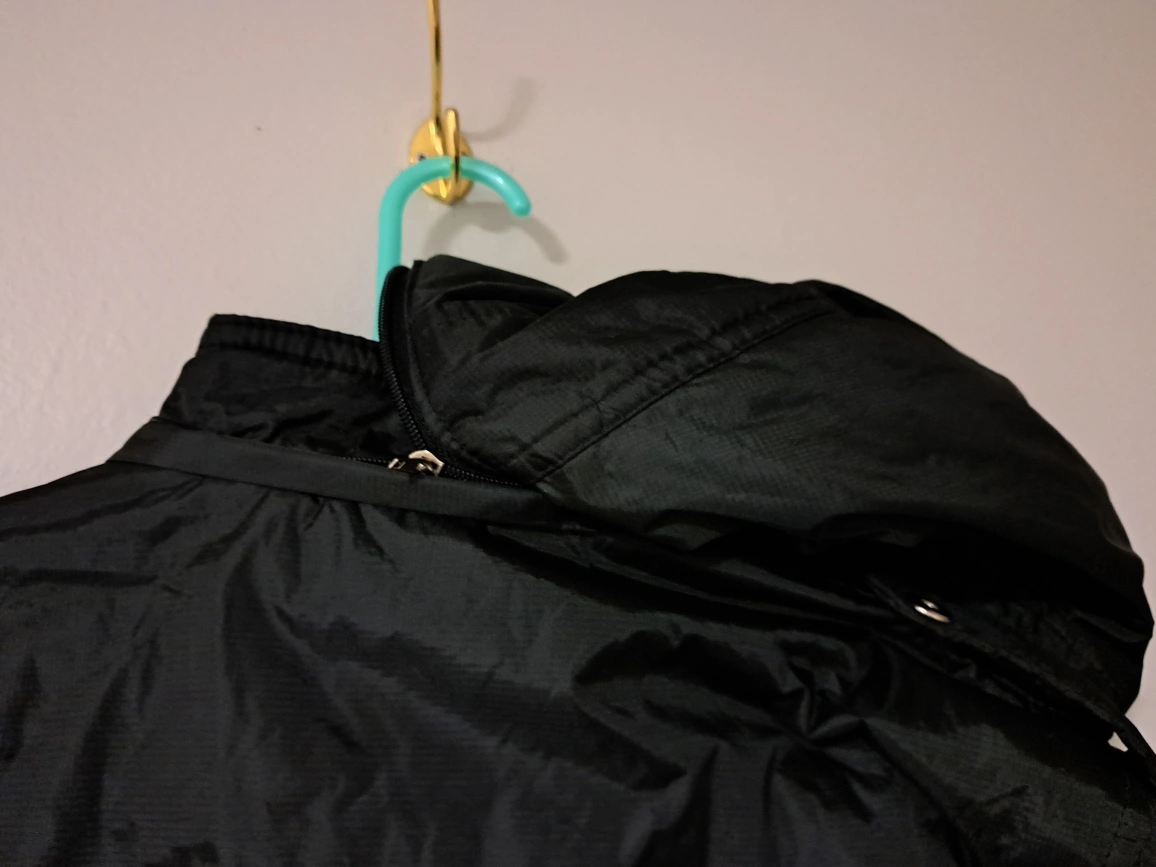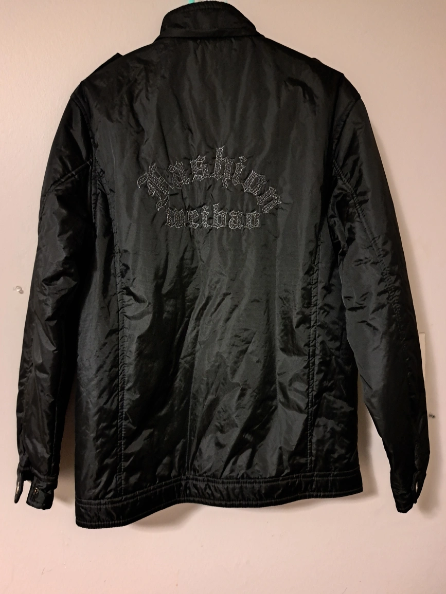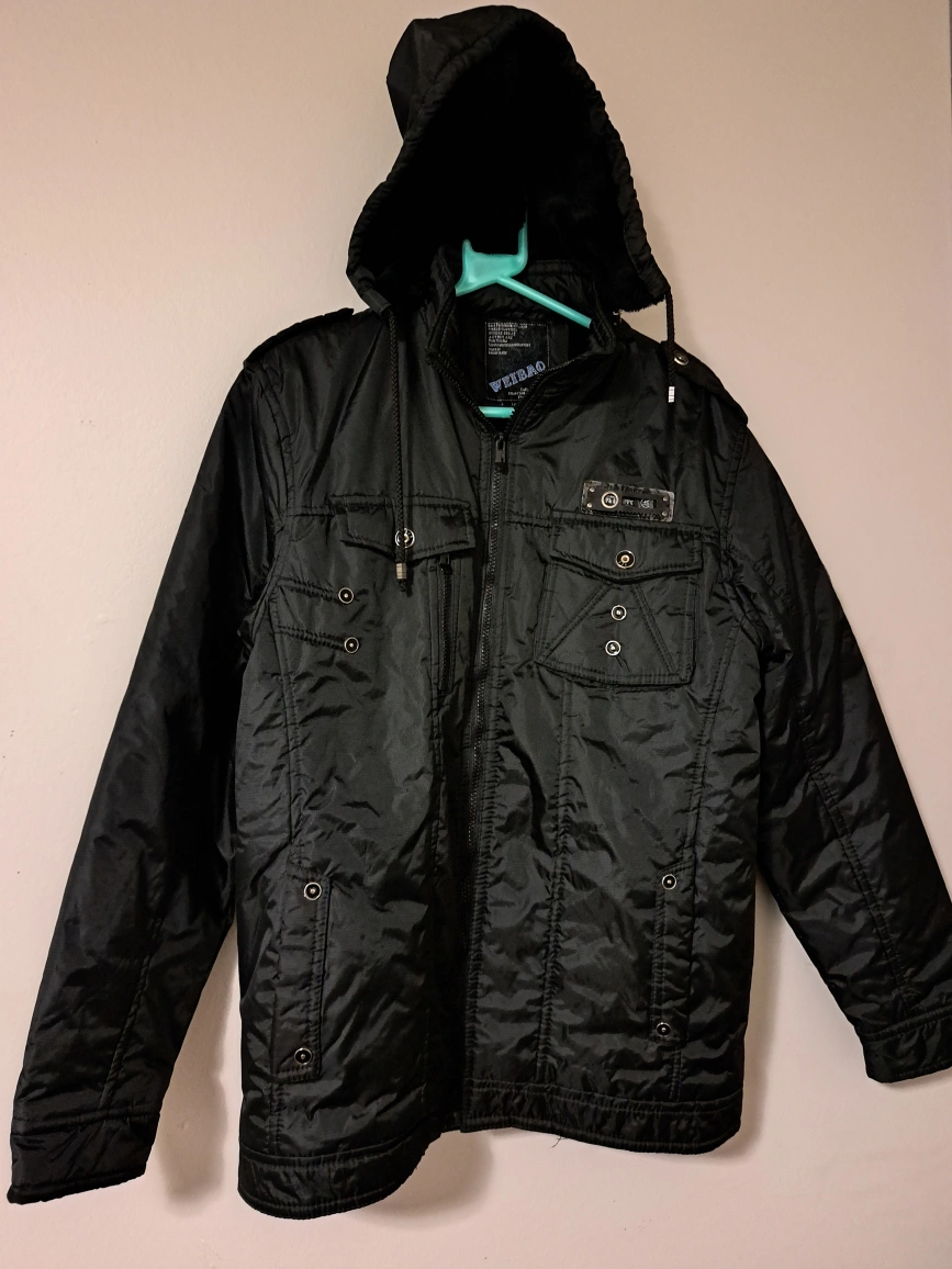 Black winter jacket with a hood. Features a zipper closure and multiple pockets. Lined with fleece.