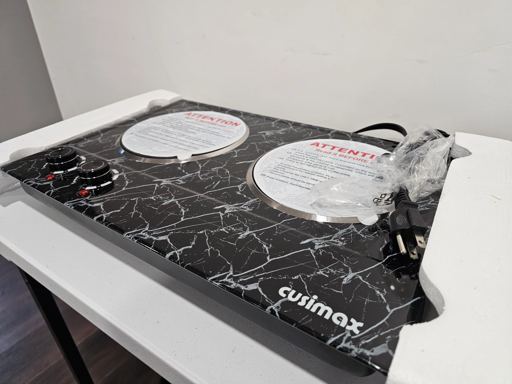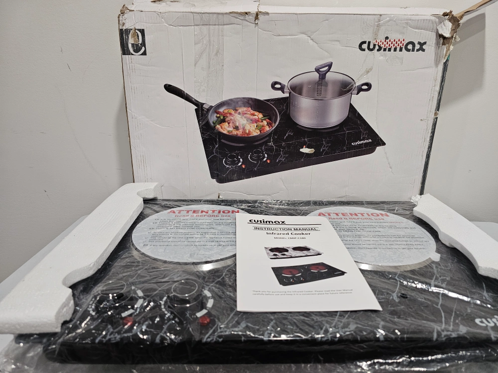 Double burner infrared cooker. Black marble design. Includes pot and pan. New in original packaging. Instruction manual included.