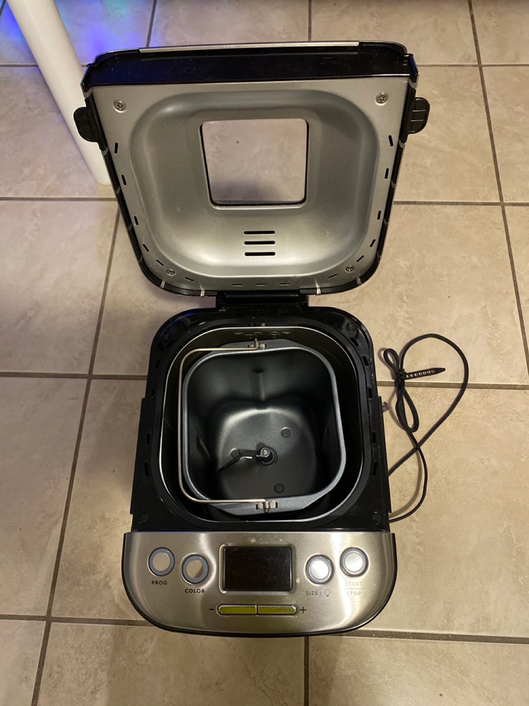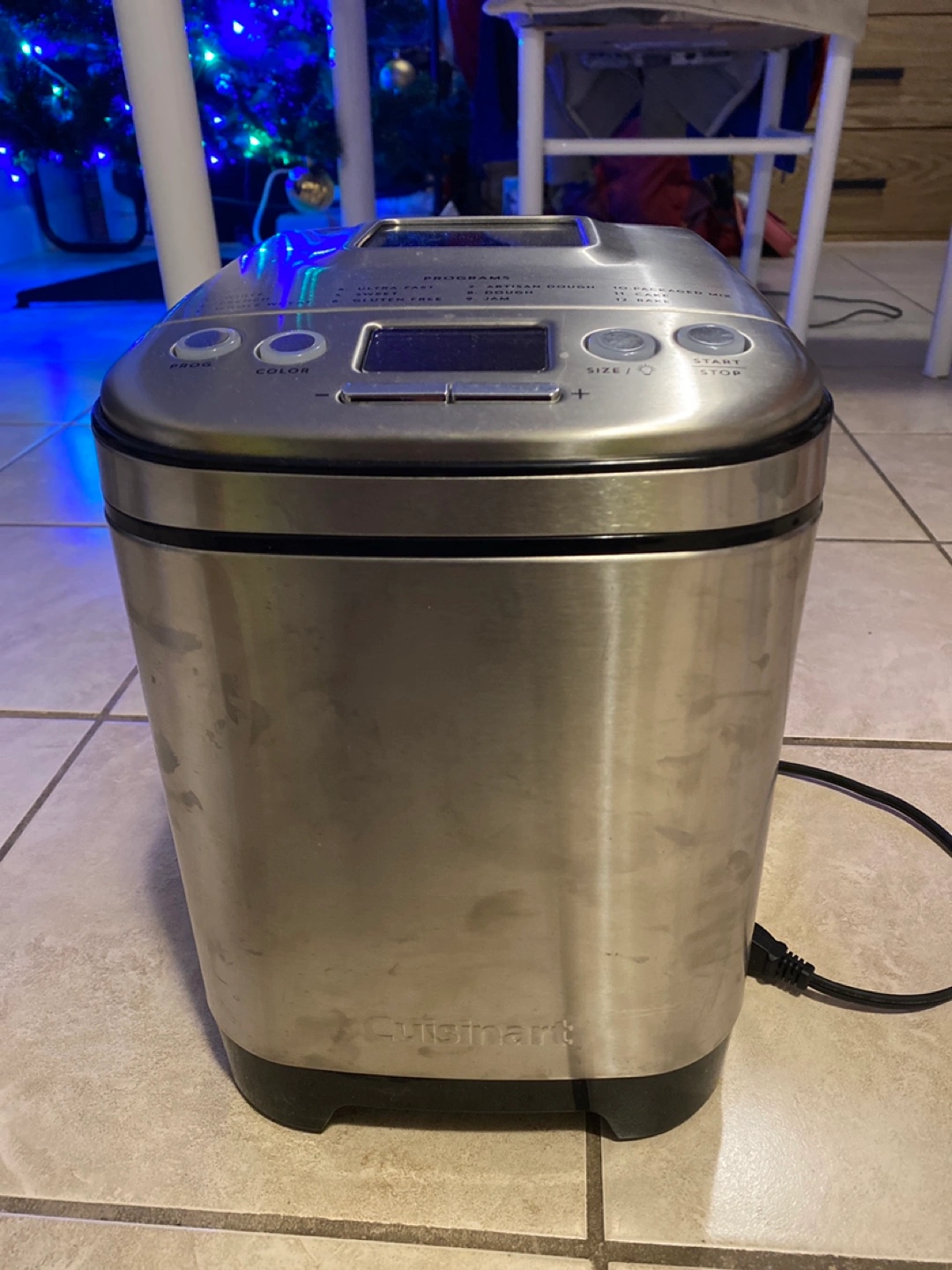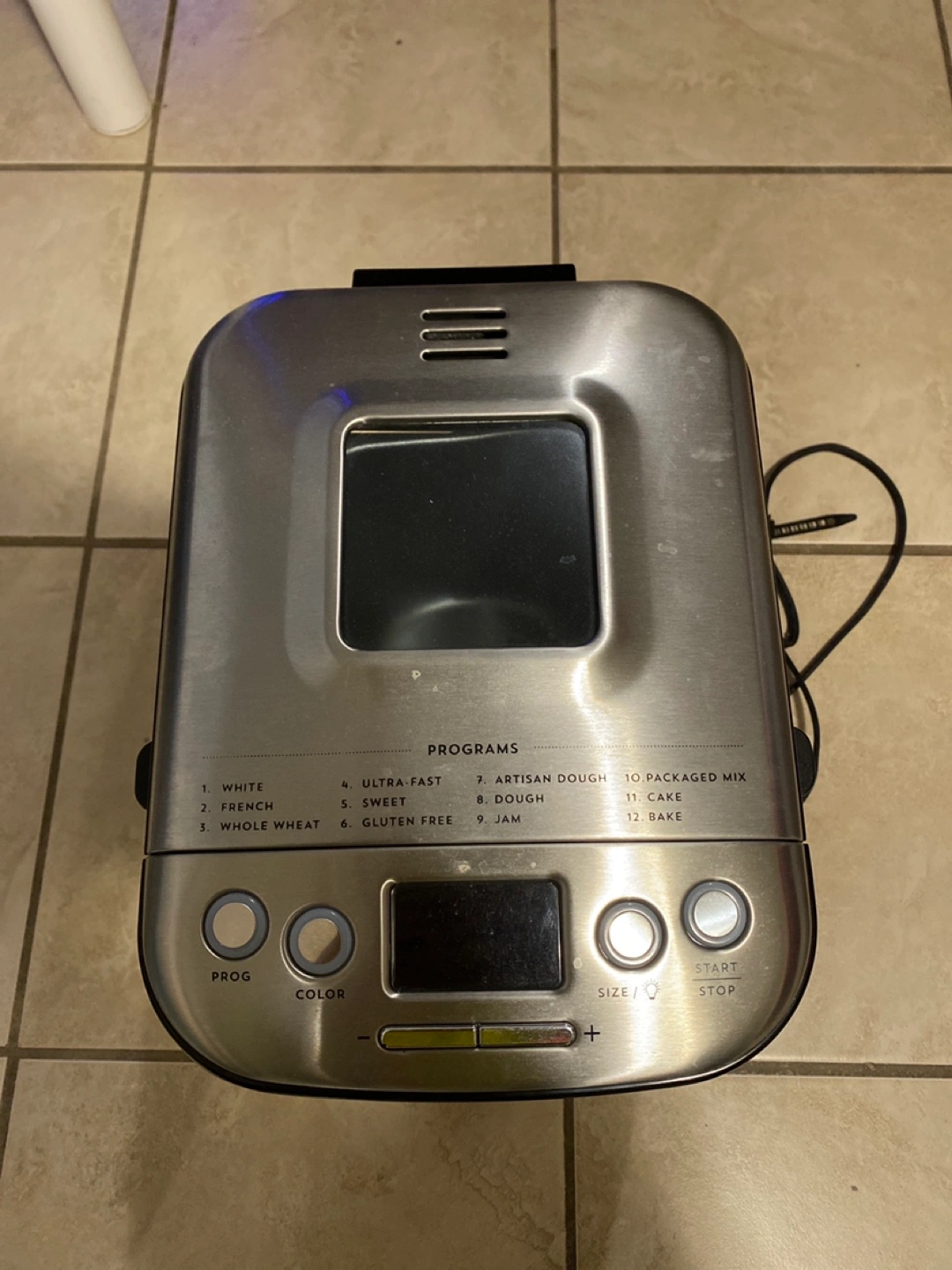 Bread maker with multiple programs, including white, French, whole wheat, ultra-fast, sweet, gluten-free, artisan dough, dough, jam and bake. The pedal has some scratches but the machine works well.