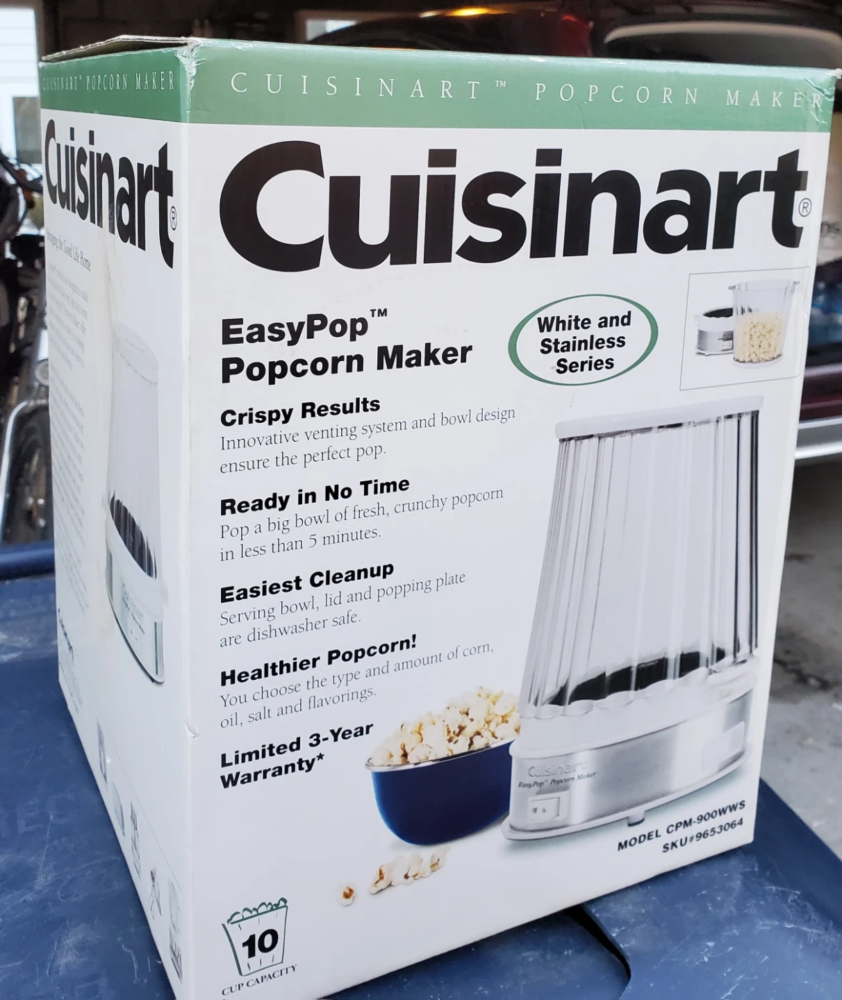 10Selling a Cuisinart EasyPop Popcorn Maker in white and stainless steel! It features an innovative venting system and bowl design to ensure the perfect pop. You can have a big bowl of fresh, crunchy popcorn in less than 5 minutes. The serving bowl, lid, and popping plate are dishwasher safe for easy cleanup. Enjoy healthier popcorn by choosing the type and amount of corn, oil, salt, and flavourings you prefer. Still in box.