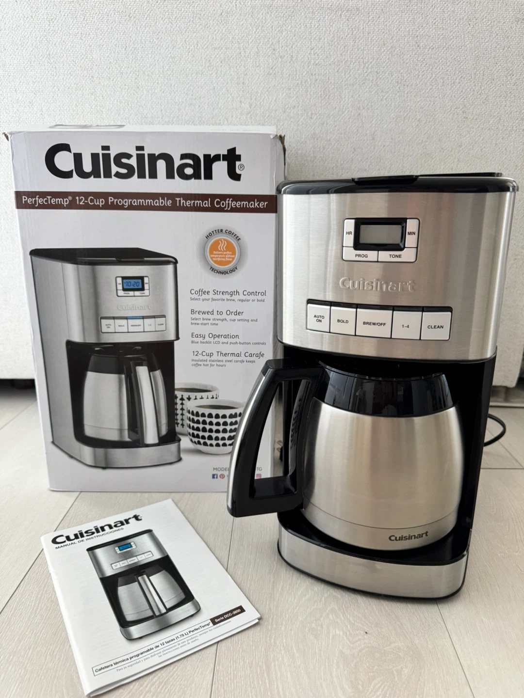 Selling a Cuisinart PerfecTemp 12-Cup Programmable Thermal Coffeemaker! It features coffee strength control to select your favourite brew, whether regular or bold. It also has an easy operation with a blue backlit LCD and push-button controls. The 12-cup thermal carafe is insulated stainless steel, keeping your coffee hot for hours! Includes the manual and the box