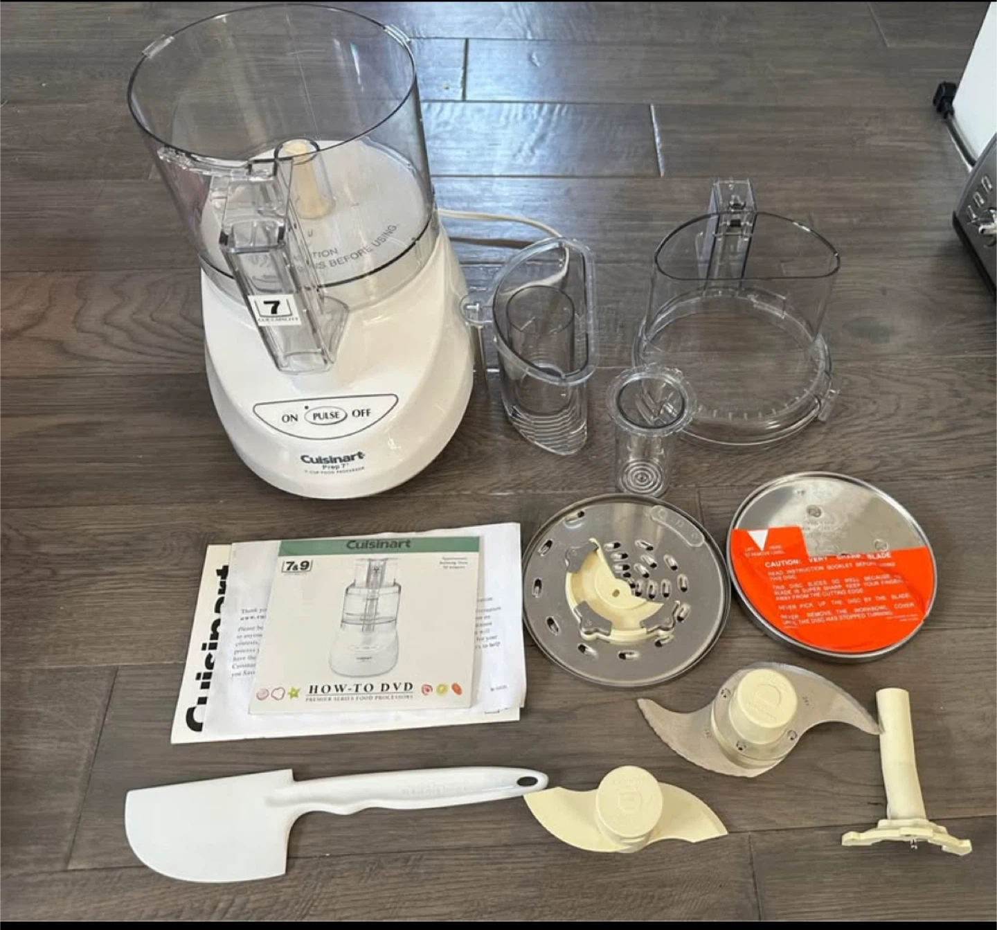 Cuisinart Prep 7 food processor - new, without box. Comes with all the attachments you see in the picture, including the slicing and shredding discs and the chopping blade. Perfect for all your food prep needs! New, never used, but was stored in the cupboard. $65