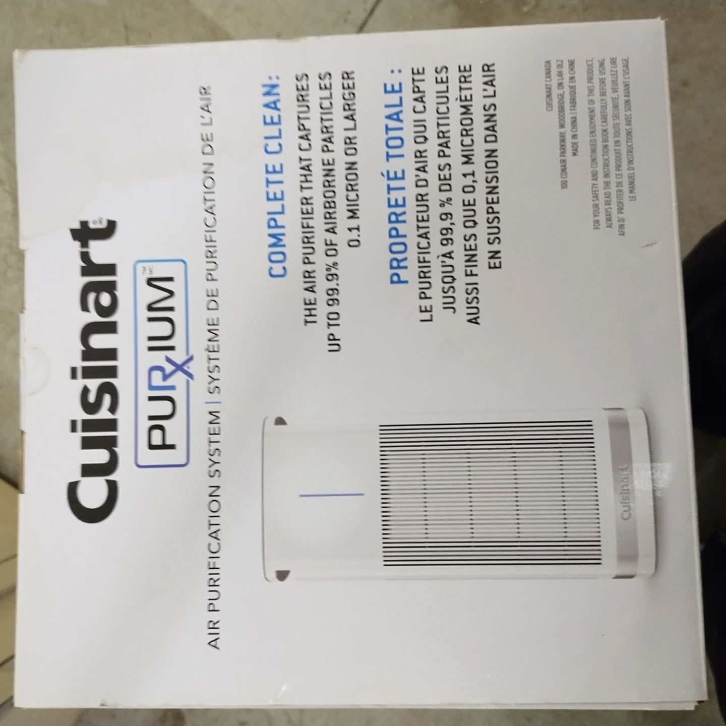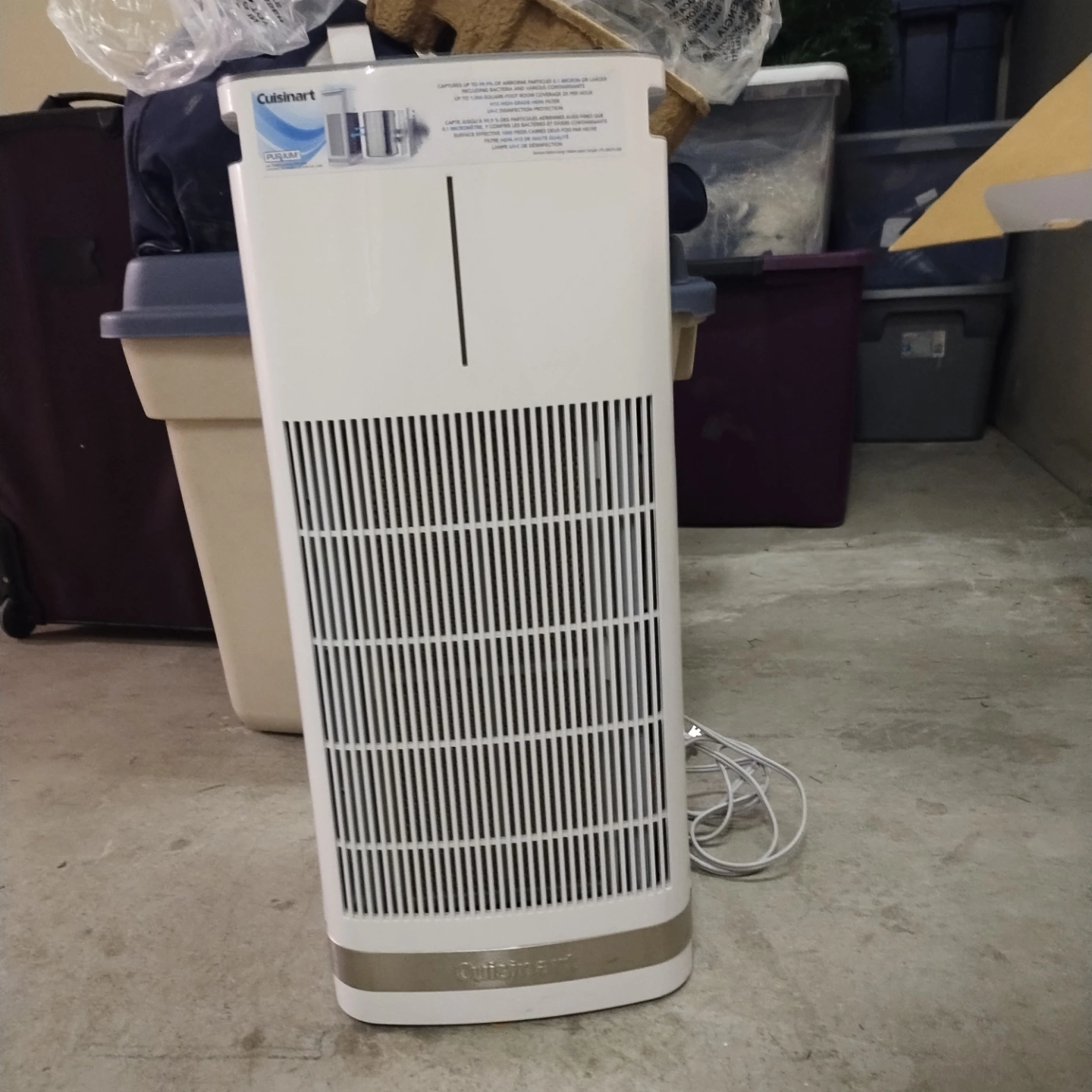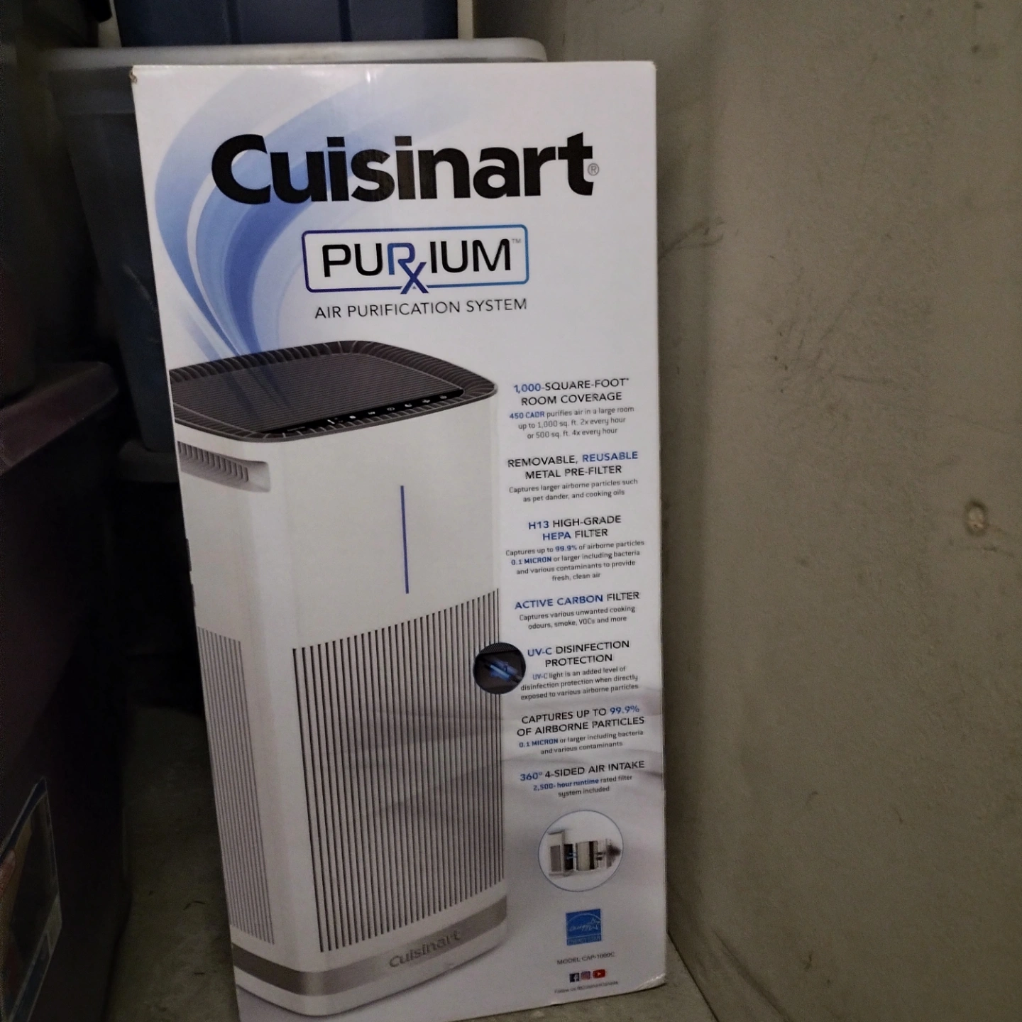 Air purifier, white and silver. 1000 square foot coverage. HEPA filter. Active carbon filter. UV-C disinfection. Captures up to 99% of airborne particles. 360-degree air intake.