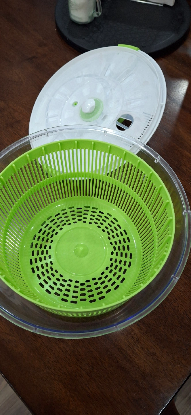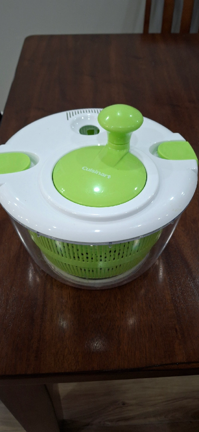 I'm selling a Cuisinart salad spinner in great condition! It's a handy kitchen gadget for washing and drying your greens. The spinner is white with green accents and features the Cuisinart logo. It's easy to use and makes salad prep a breeze!
