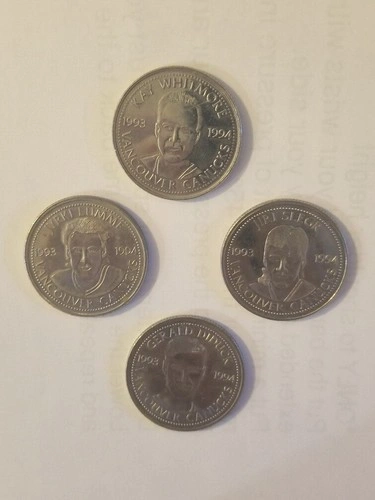Vintage Canuck Foundation Vancouver Canucks Limited Edition Team Coin Collection from 1993-94. Includes coins for Jiri Slegr, Kay Whitmore (one small scratch), Jyrki Lumme, and Gerald Diduck. These 4 coins are sold together as a bundle. Let me know if you're interested!