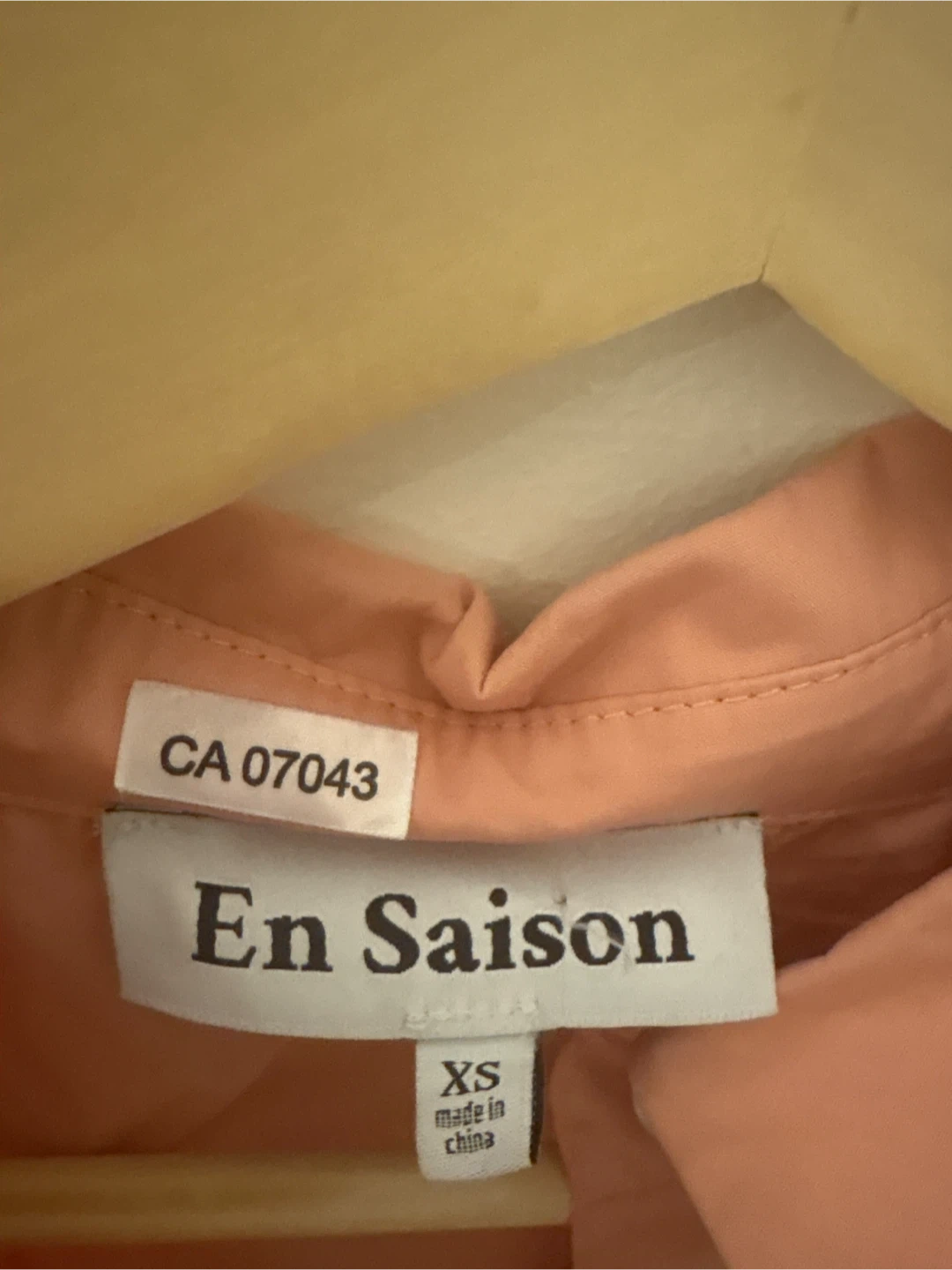 This En Saison dress is coral coloured and a size XS. It's a sleeveless, tiered dress with a button-up front and pockets. The material is lightweight and comfortable.