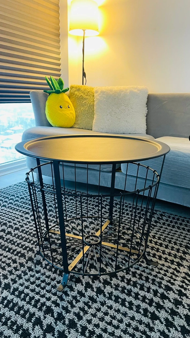 Selling a black IKEA Gualov storage table! It's in great condition and perfect as a side table or coffee table. This lightweight and portable table is a great addition to any living space.