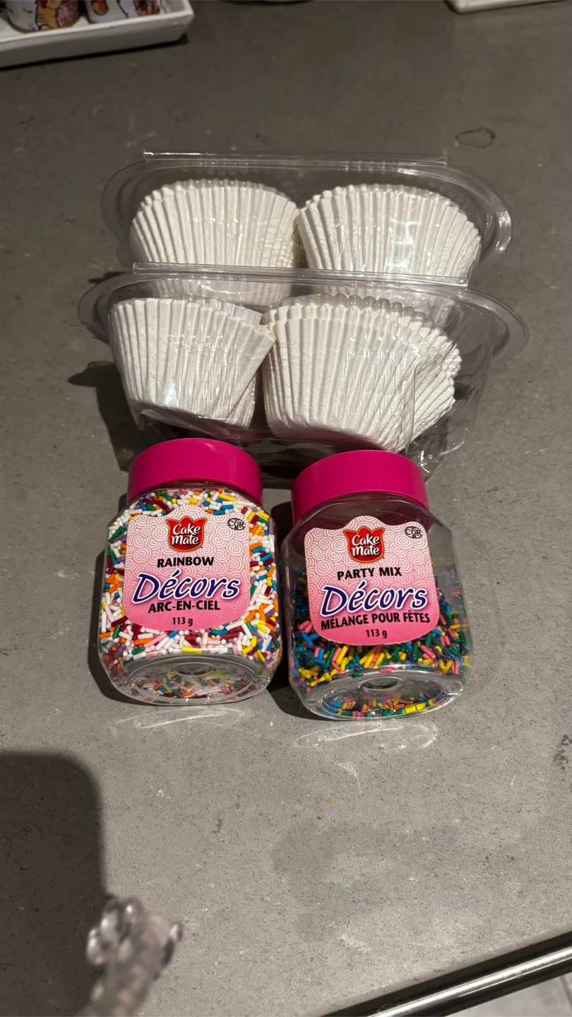 one sealed sprinkles one used sprinkles two opened pack of white cupcake liners