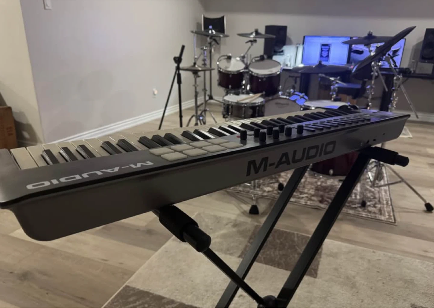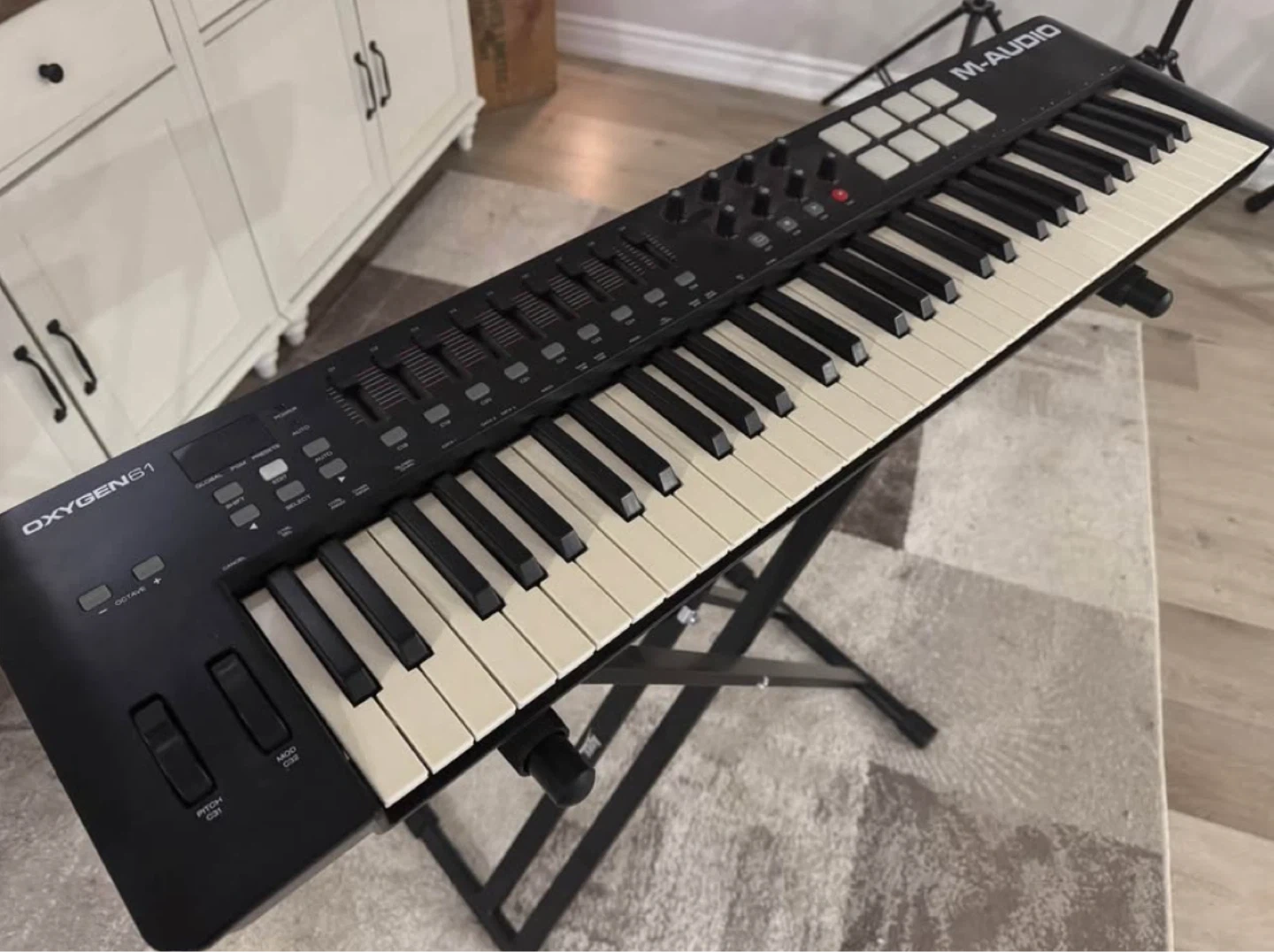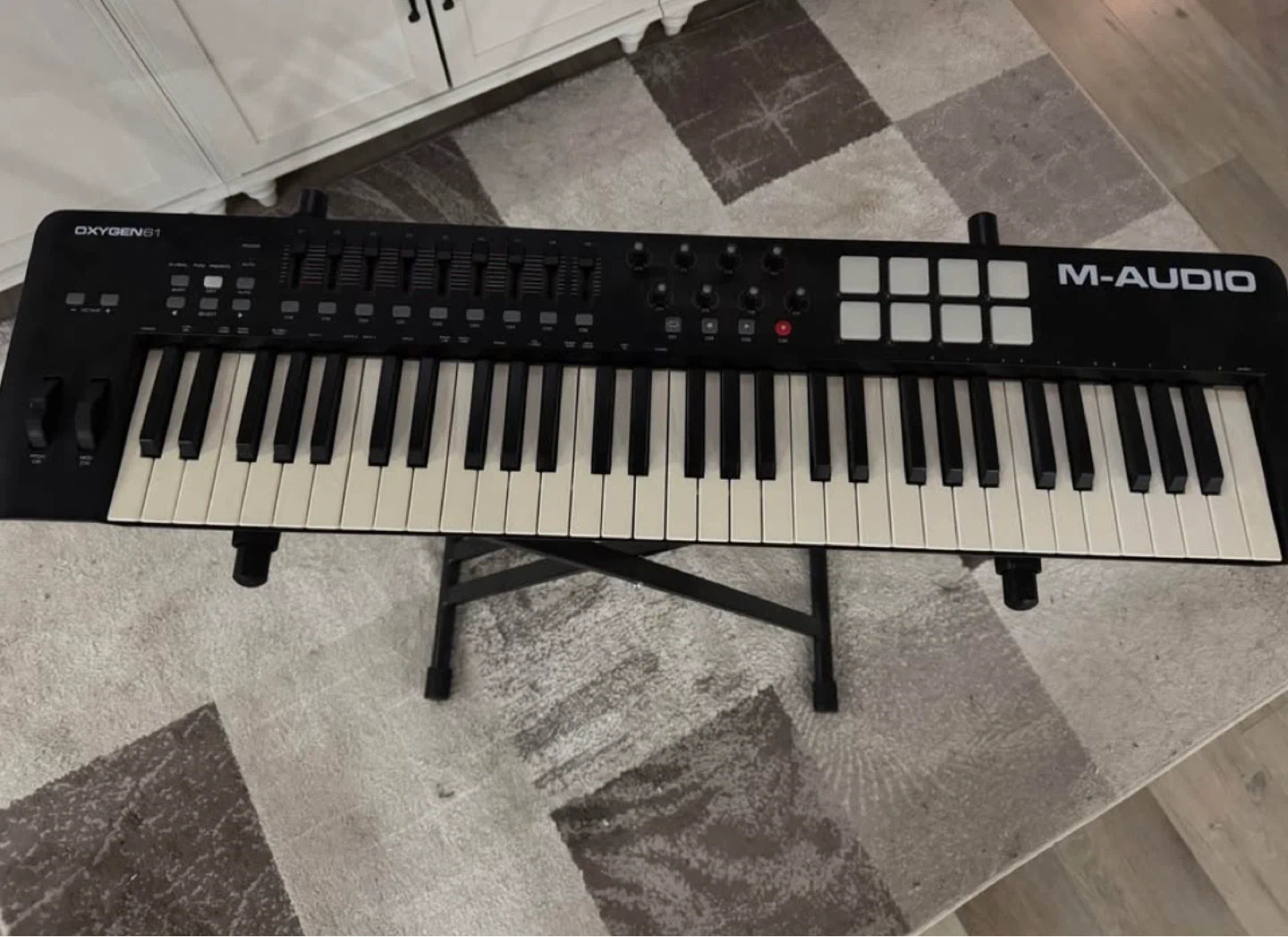 The M-Audio Oxygen 61 is a 61-key USB MIDI controller designed for music production, featuring velocity-sensitive keys, 8 trigger pads, 8 knobs, and 9 faders. It includes smart controls, an arpeggiator, and auto-mapping for major DAWs. This keyboard version offers a more premium, semi-weighted keybed with aftertouch. It’s brand new, only eight months old. Will provide link to download drivers.