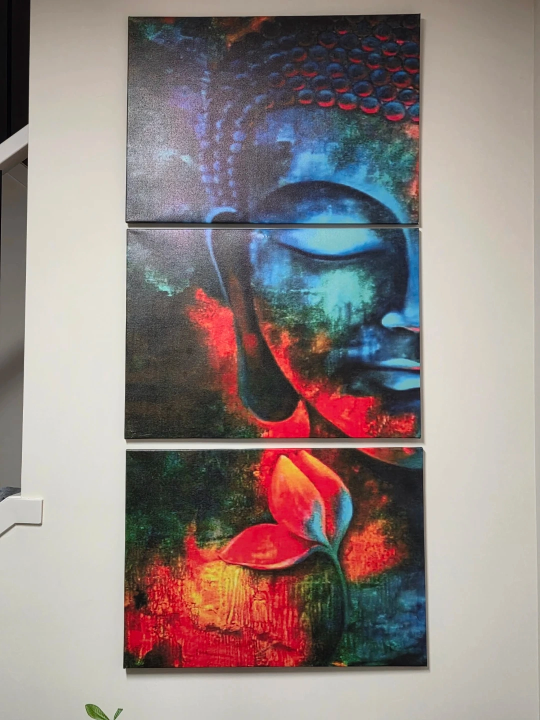 Selling a vibrant Buddha canvas wall art set! It comes with three panels that create a striking image when hung together. The artwork features a mix of blues, reds, and greens, making it a colourful addition to any room