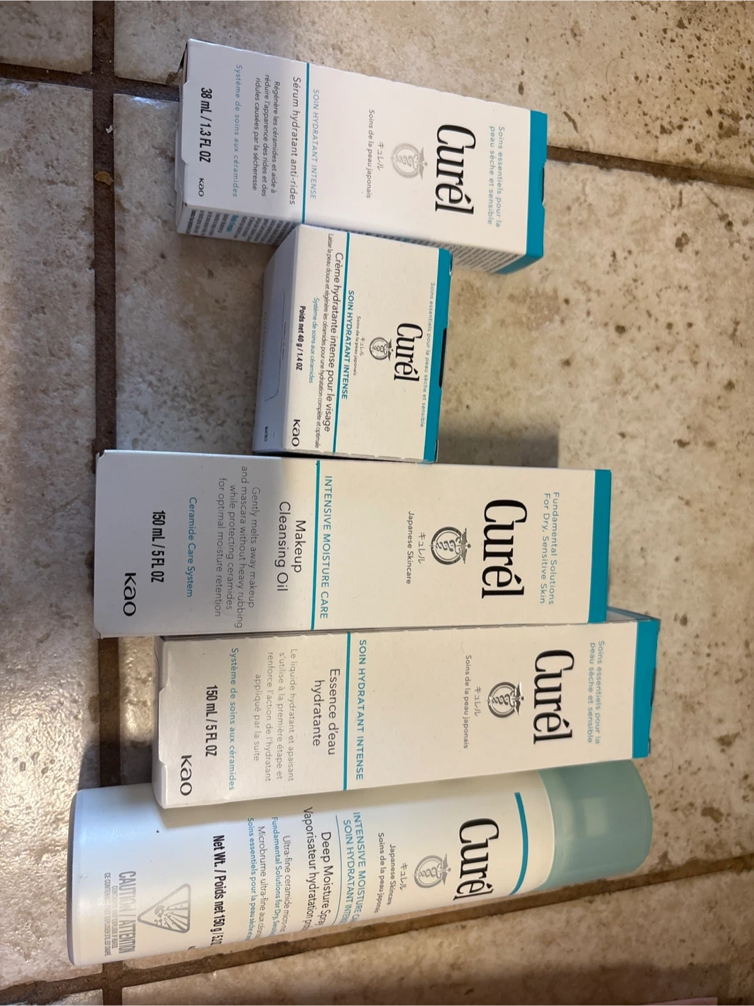 Selling a set of Curél skincare products! Includes: - Sérum hydratant anti-rides (38 mL) - Crème hydratante intense pour le visage (40 g) - Makeup Cleansing Oil (150 mL) - Essence d'eau hydratante (150 mL) - Deep Moisture Spray (150 g) These products are designed for dry, sensitive skin and contain ceramides to help with hydration