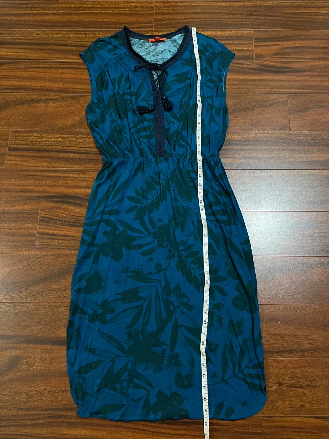 Beautiful Joe Fresh midi dress in teal blue with dark green tropical leaf design. Sleeveless with keyhole neckline, tassel tie, and embroidery detail. Elasticized waist for a flattering fit. Lightweight 100% rayon fabric makes it ideal for warm weather.