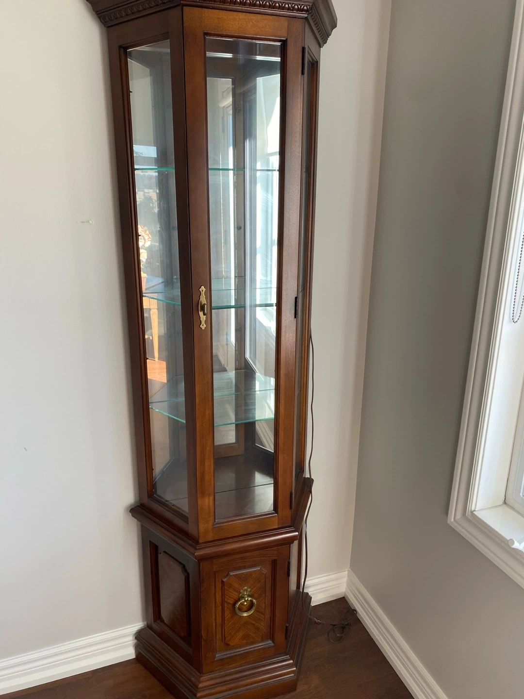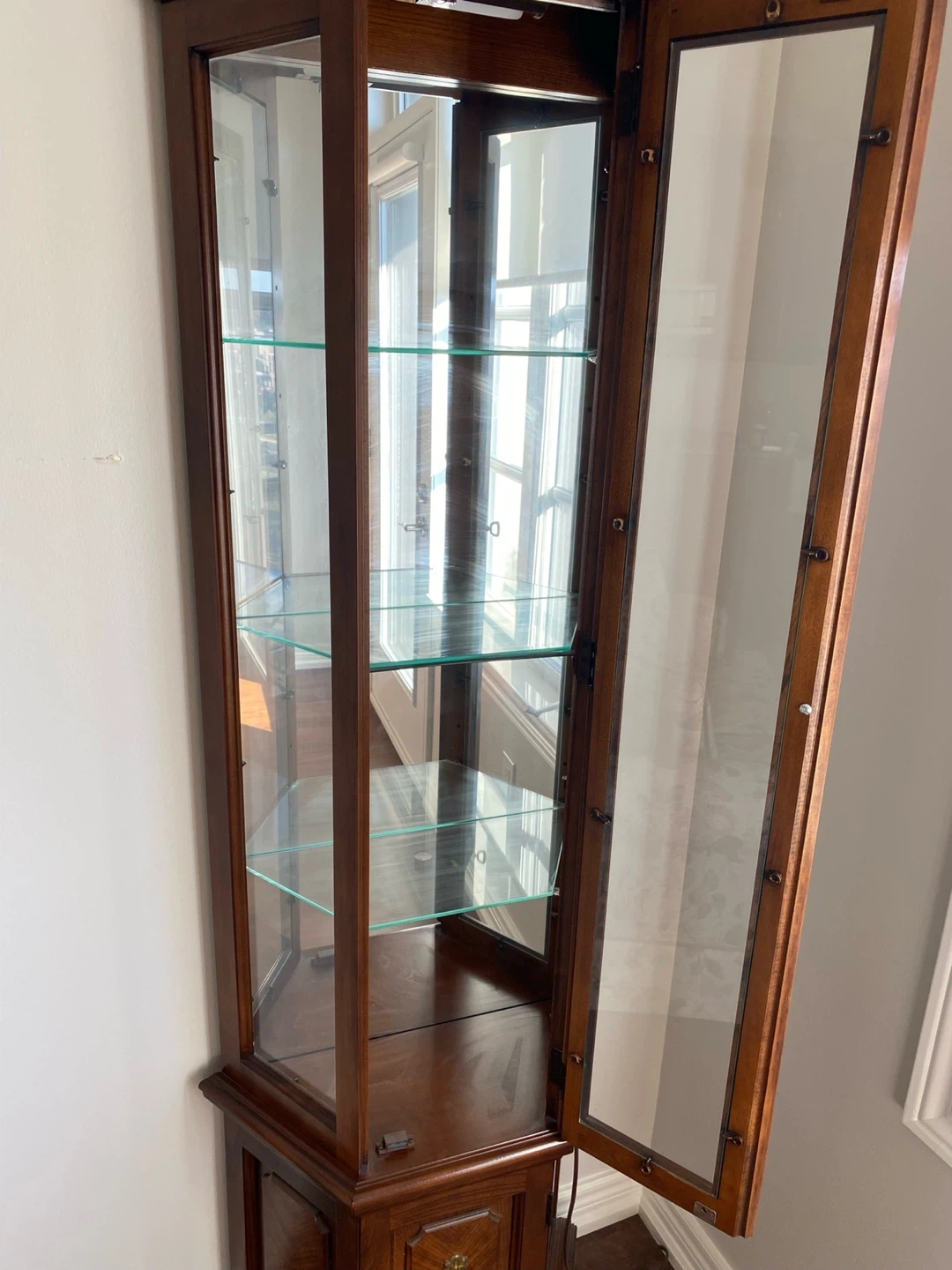 72 inches height 10 inches deep 20 inches wide at back Lights haven’t been used in years but i assume they work with new bulbs. Still beautiful without the lights.