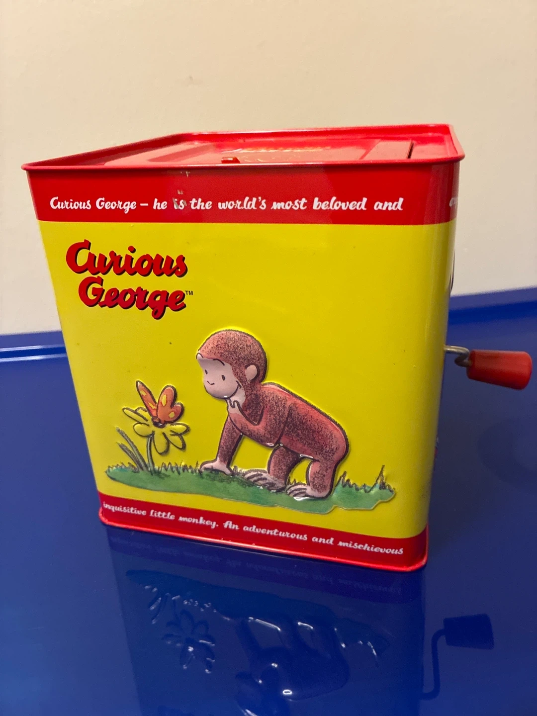 Selling a Curious George Jack-in-the-Box toy! It features Curious George on the side and a plush George that pops up when you crank the handle. A fun and nostalgic toy for kids!