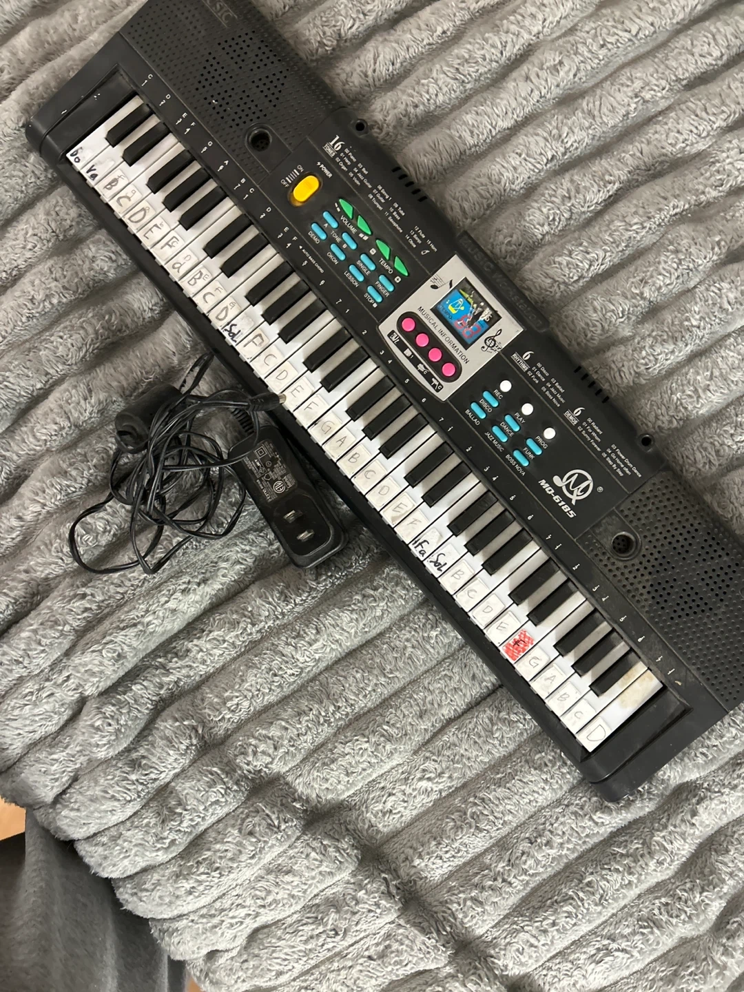 This electronic keyboard features 16 tones and multiple rhythms for musical exploration. Comes with an AC adapter. Great for kids to play!