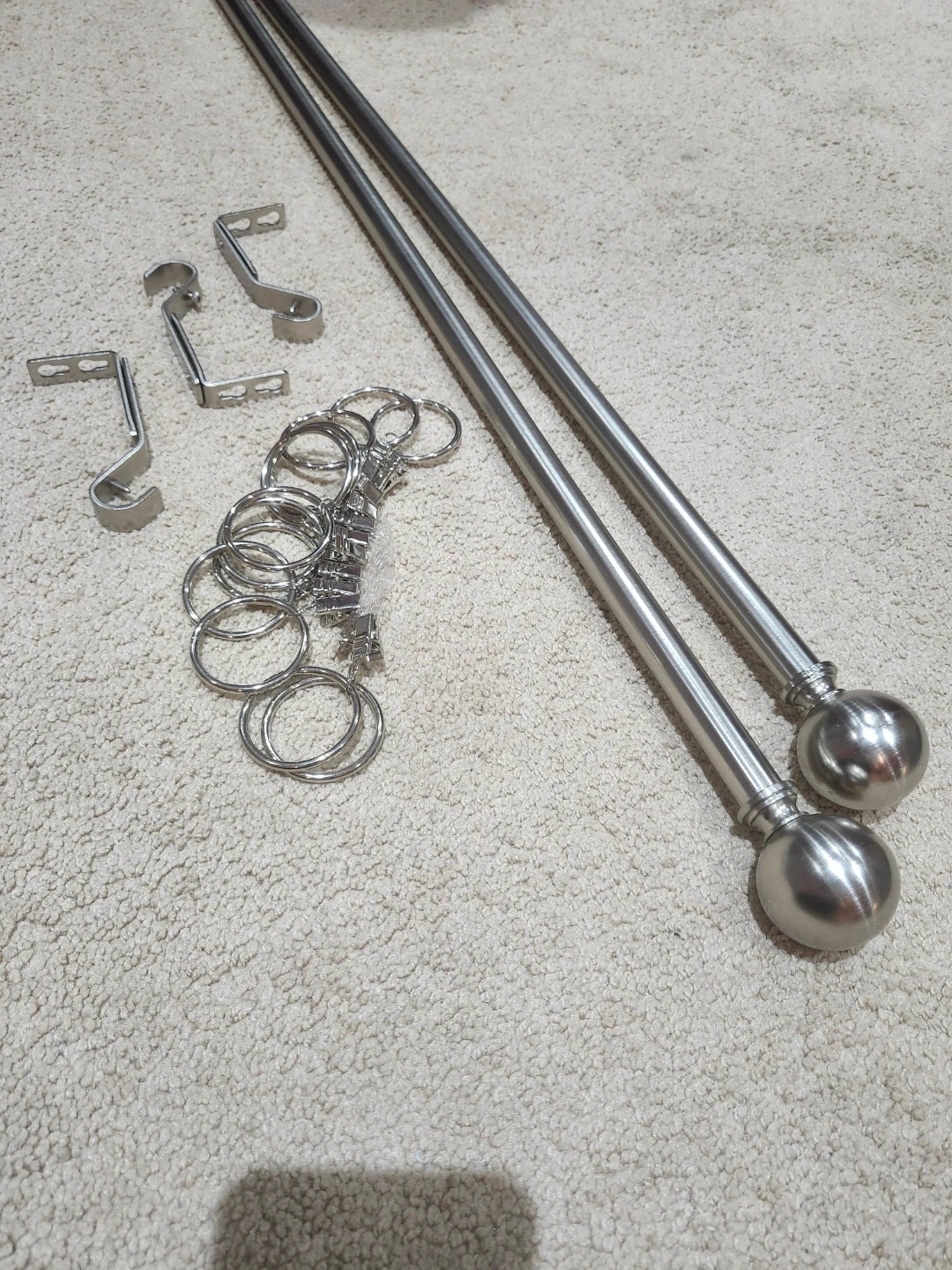 73Selling a curtain rod with all the necessary hardware. It includes the rod itself, mounting brackets, and curtain rings.
