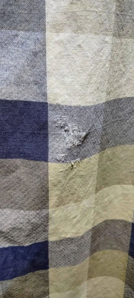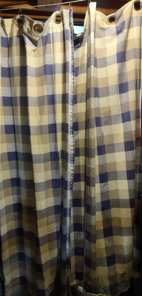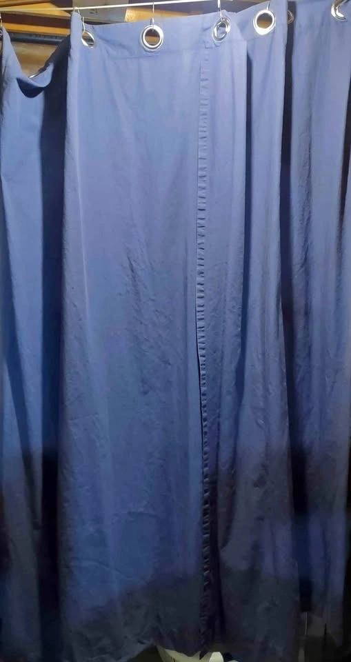 15Each set of 2 panels is $10 or $15 for both sets. The colours are coordinated. Each set is 100% cotton and has been washed. Navy panels are 80" x 40" - 2 panels. Some fading on the back side that faces out. 6 metal grommets on top. Navy and pale yellow panels are 78" x 43" - 2 panels. Minor shredding in one part of one panel as pictured. About 1.5" square. 6 metal grommets on top. Smoke free, bug free, dog friendly home.