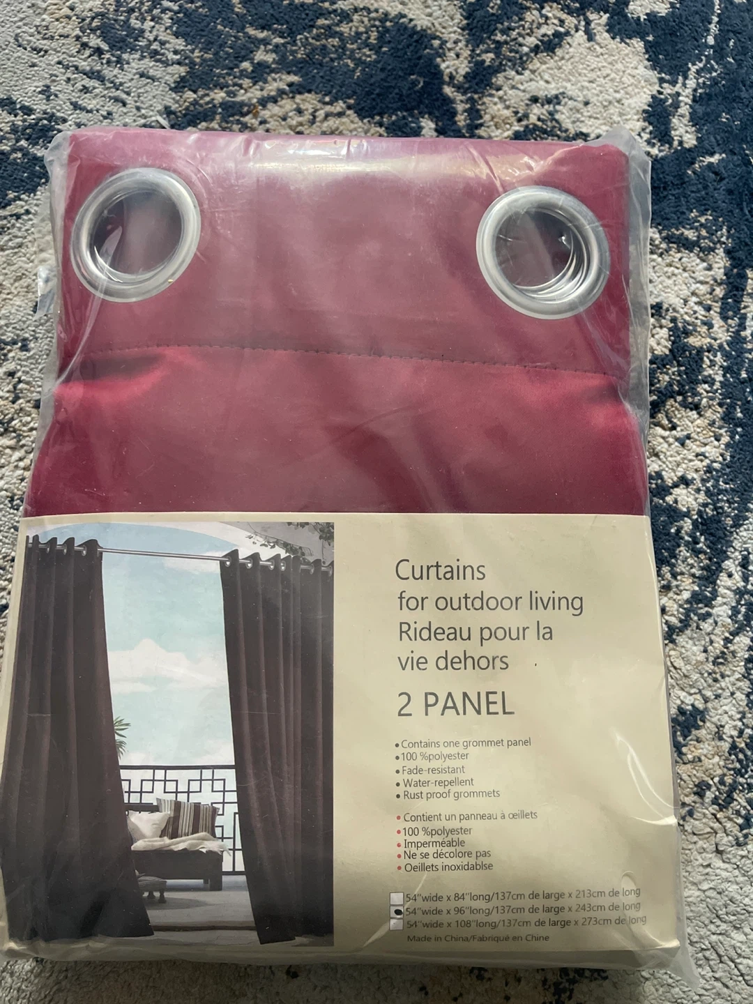 15Selling a set of curtains for outdoor living! These are brand new in the packaging. It includes two panels, each with grommets. - 100% polyester - Fade-resistant - Water-repellent - Rust proof grommets - 54" wide x 96" long (137cm x 243cm)