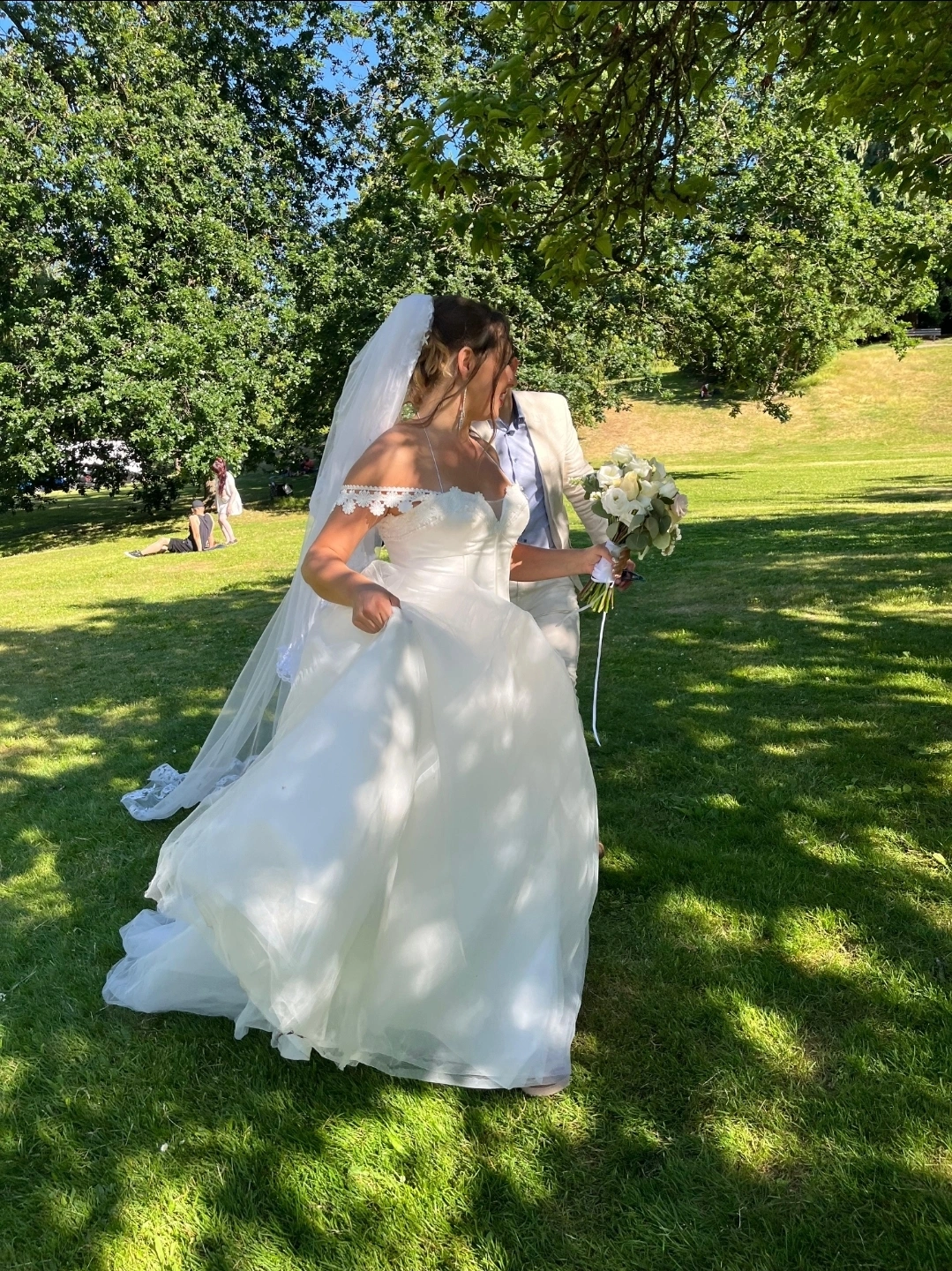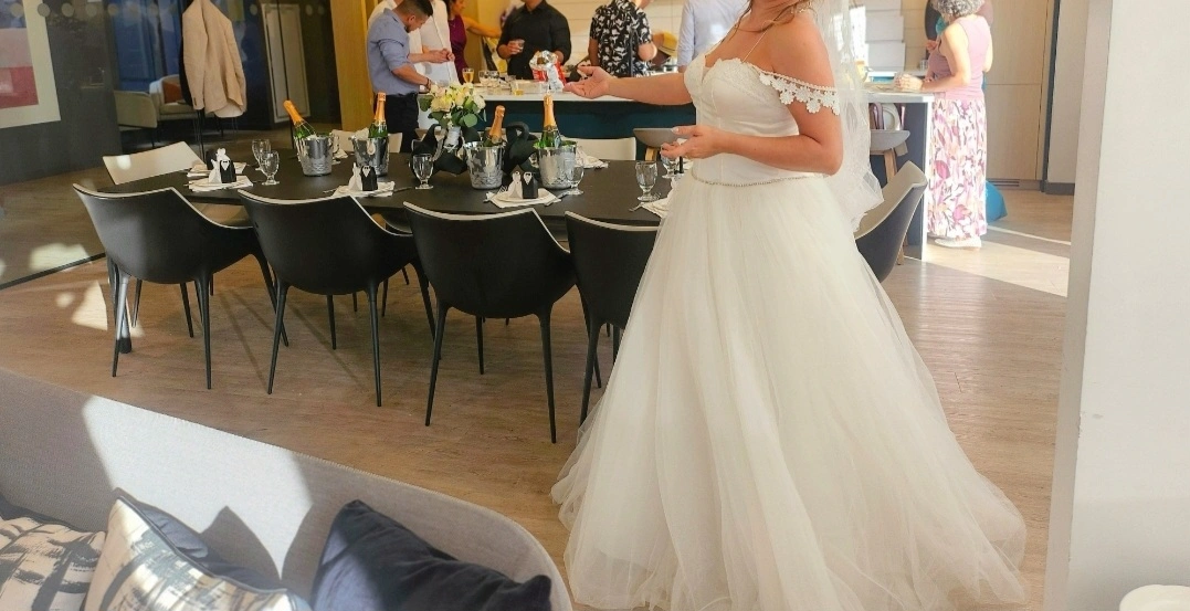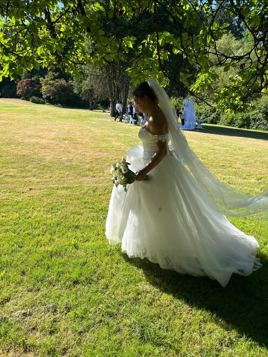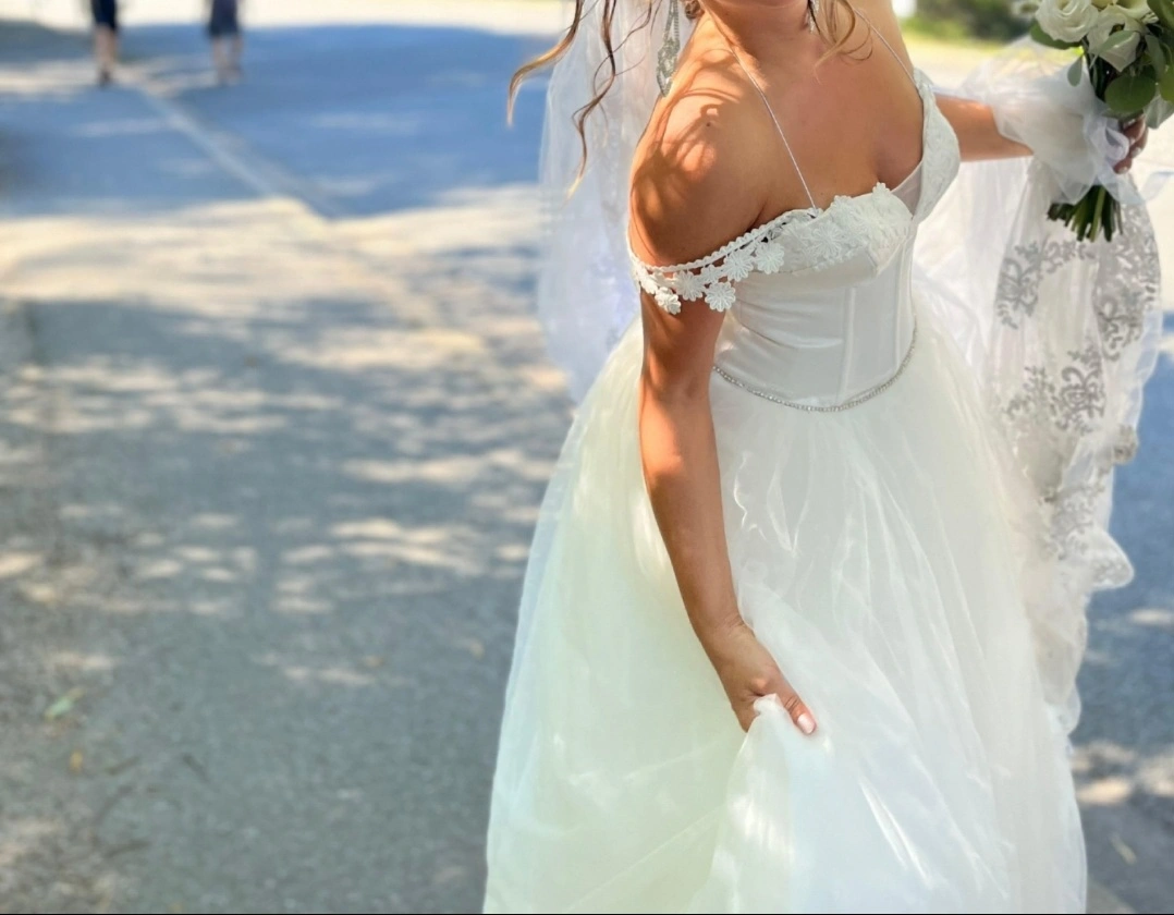 Make your wedding day unforgettable in this stunning off-shoulder gown from Jewel by David’s Bridal, custom redesigned for a flattering curvy fit (size 4–6). Originally purchased in New Westminster, this dress has been thoughtfully enhanced with elegant shoulder detailing, a romantic corset back, and a sparkling custom-made belt ($100 value) that adds just the right touch of glamour. 👗 Dress Features: - Off-shoulder neckline with floral embellishments - Sculpted corset back for a tailored silhouette - Flowing skirt with graceful movement - Sparkling custom belt for added elegance - Worn once 🕊️ Bonus: Includes a custom-ordered veil ($50 value) that perfectly complements the gown’s romantic aesthetic. 💫 Whether you're planning a garden ceremony, a chic city celebration, or a dreamy destination wedding, this ensemble offers timeless beauty with modern enhancements—ready to make another bride feel radiant and unforgettable. 💸 Includes veil + belt 📍 Local pickup in Vancouver or could bring it to you This isn’t just a dress—it’s a moment waiting to happen.