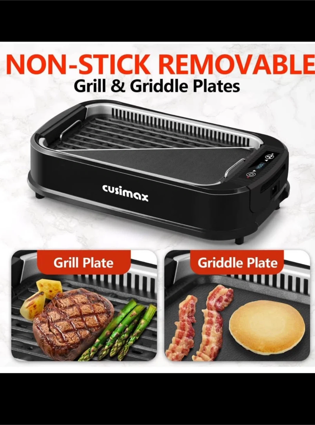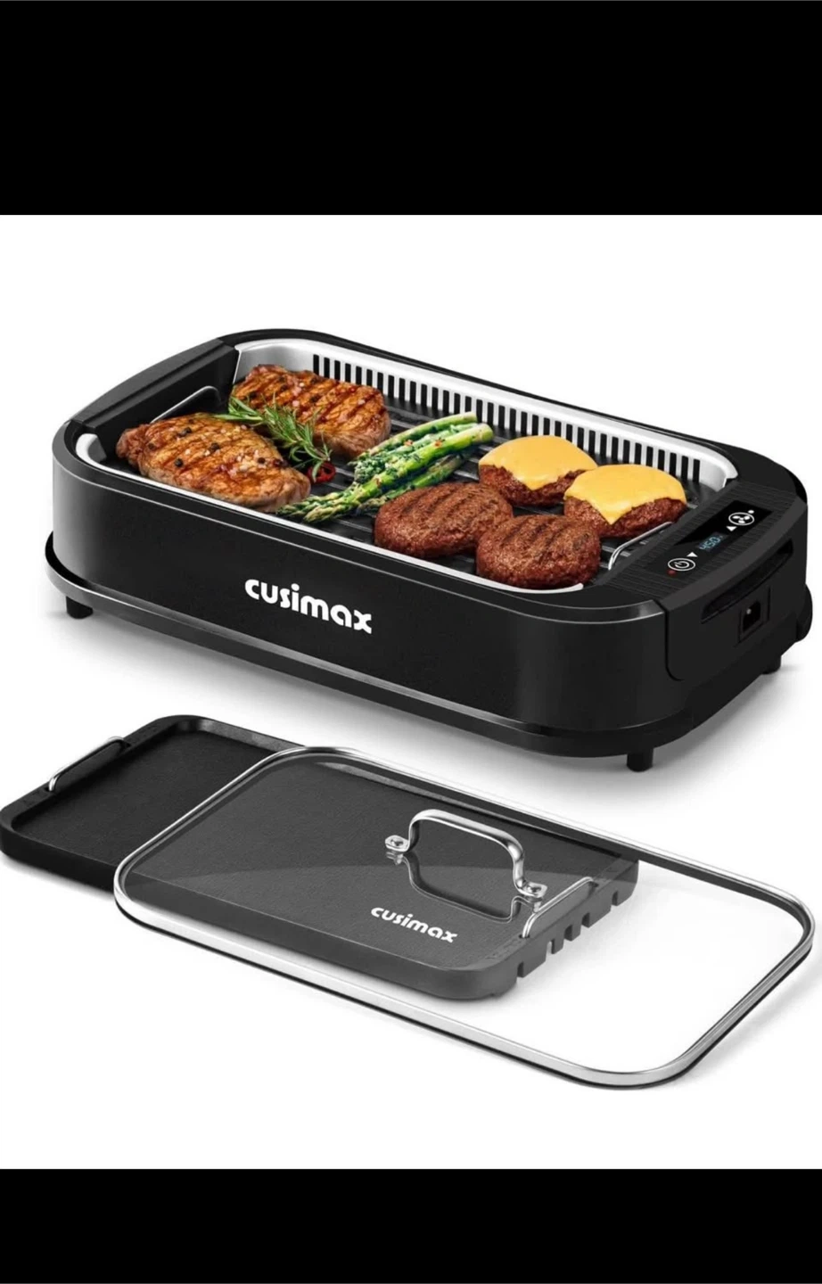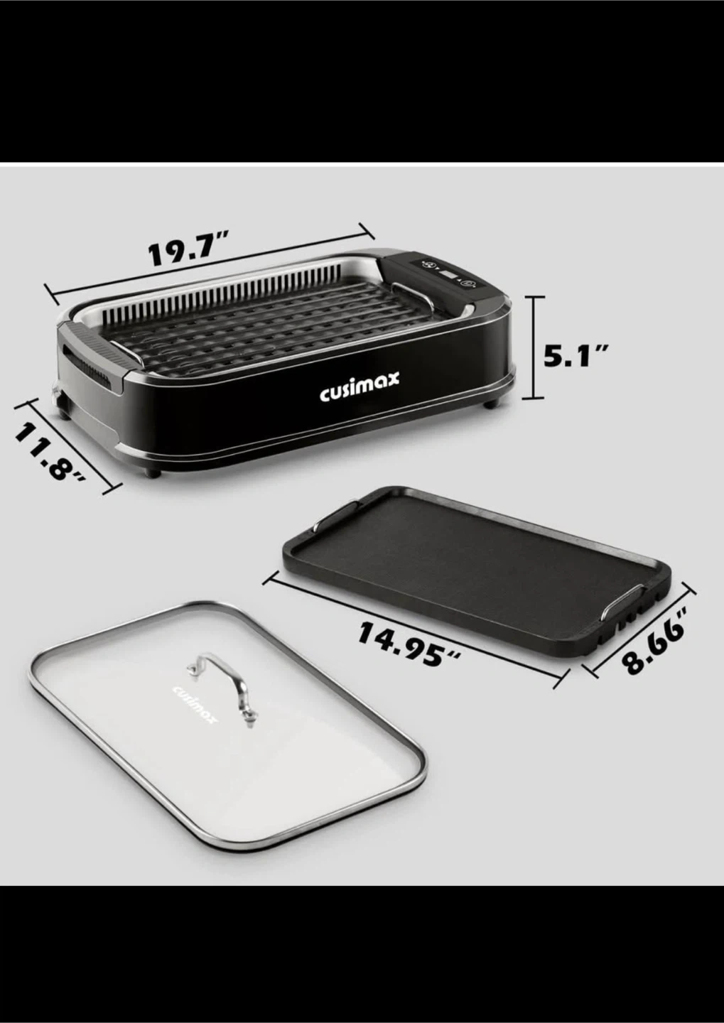 23Selling a new Cusimax indoor smokeless grill! It's black and features a non-stick removable grill and griddle plates. It also has an ultra-clear LED smart display to easily adjust the temperature. Dimensions are 19.7" x 11.8" x 5.1"