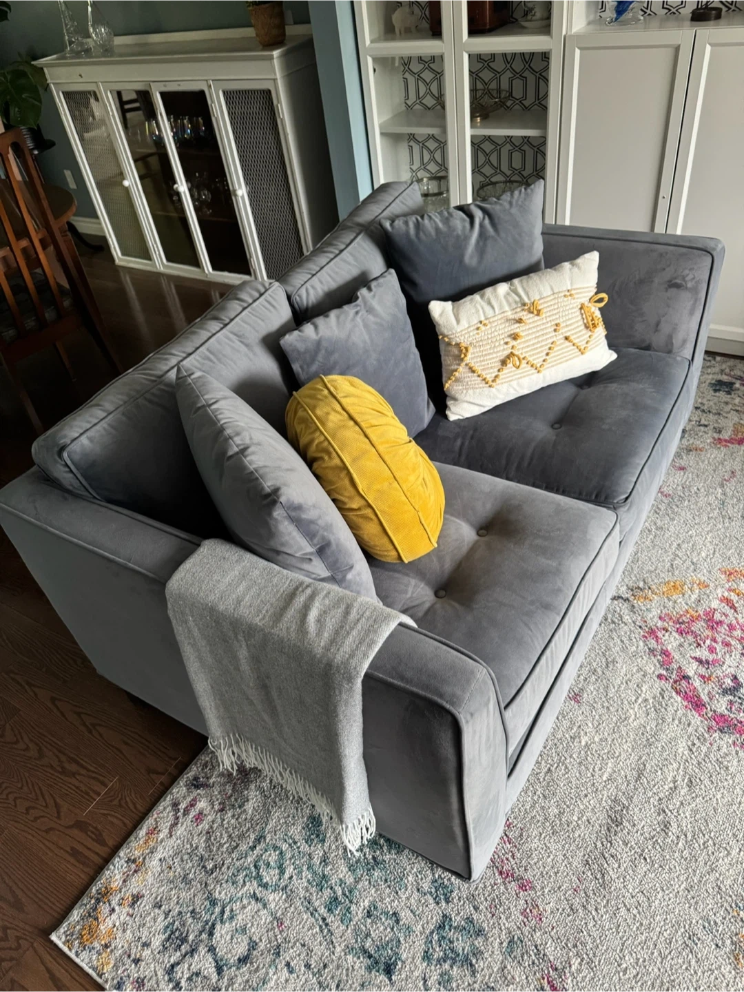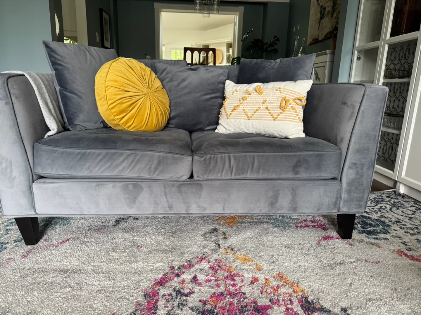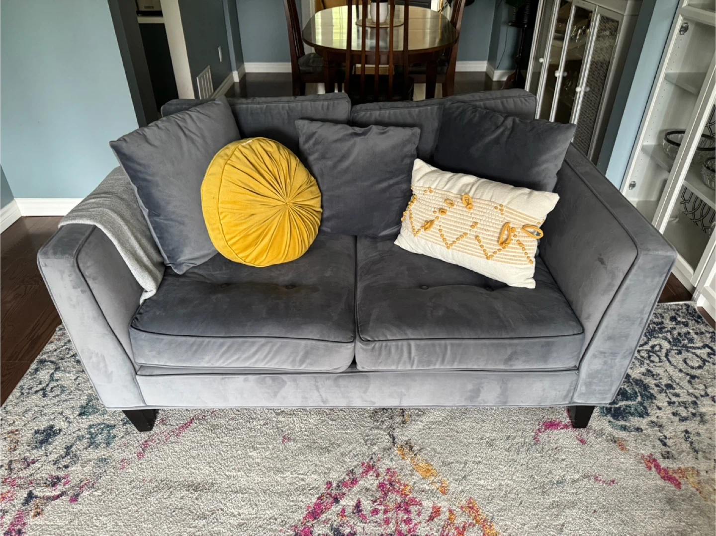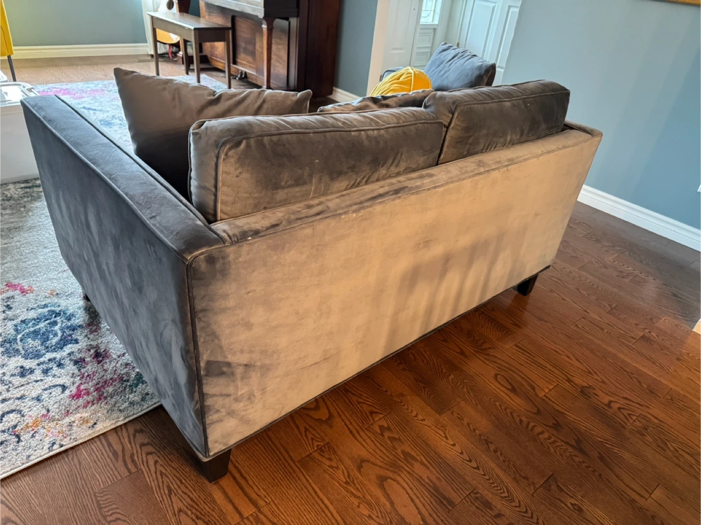 Custom Blue Velvet Sofa – Stylish & Comfortable Add a pop of luxury and comfort to your living room with this beautiful custom blue velvet sofa! Fabric: Rich, soft blue velvet Size: Loveseat (seats 2–3 people comfortably) Condition: Excellent, gently used in a smoke-free home Design: Modern and elegant, with wide arms and plush cushions Origin: Believed to be from Elte MKT, Toronto — renowned for quality furnishings (not 100% confirmed, but comparable in design and quality) Sturdy wood frame and legs Comes with original matching cushions—decor pillows not included unless requested This piece is perfect for any contemporary home, condo, or apartment. Must see in person to appreciate the texture and deep blue tone.