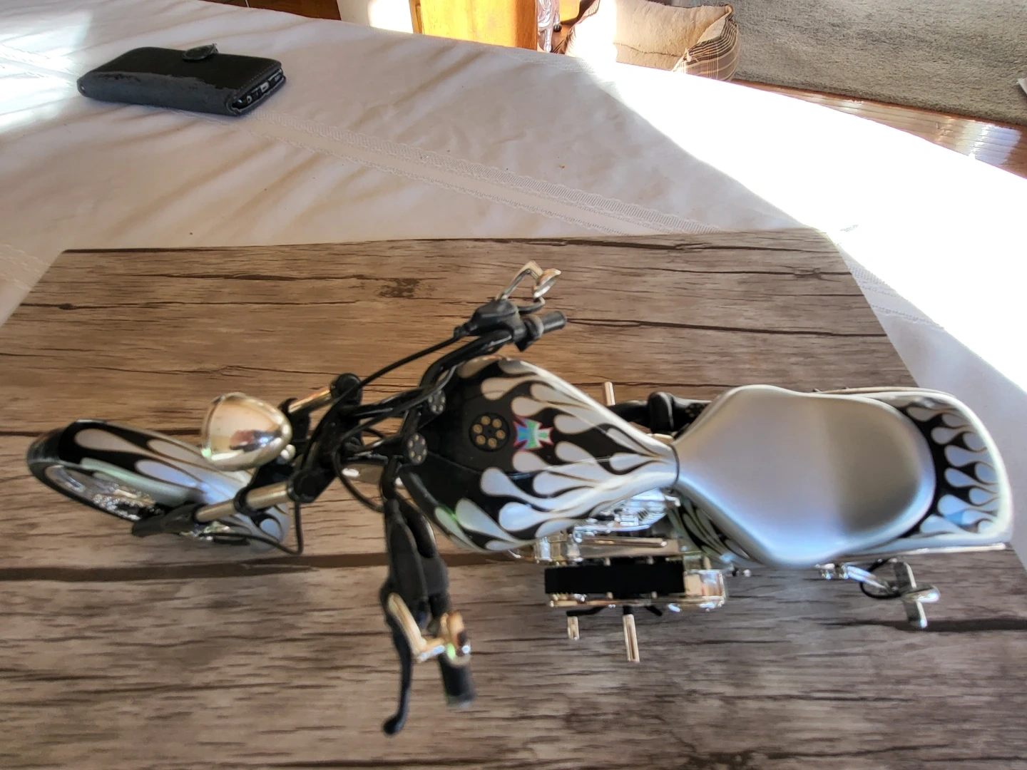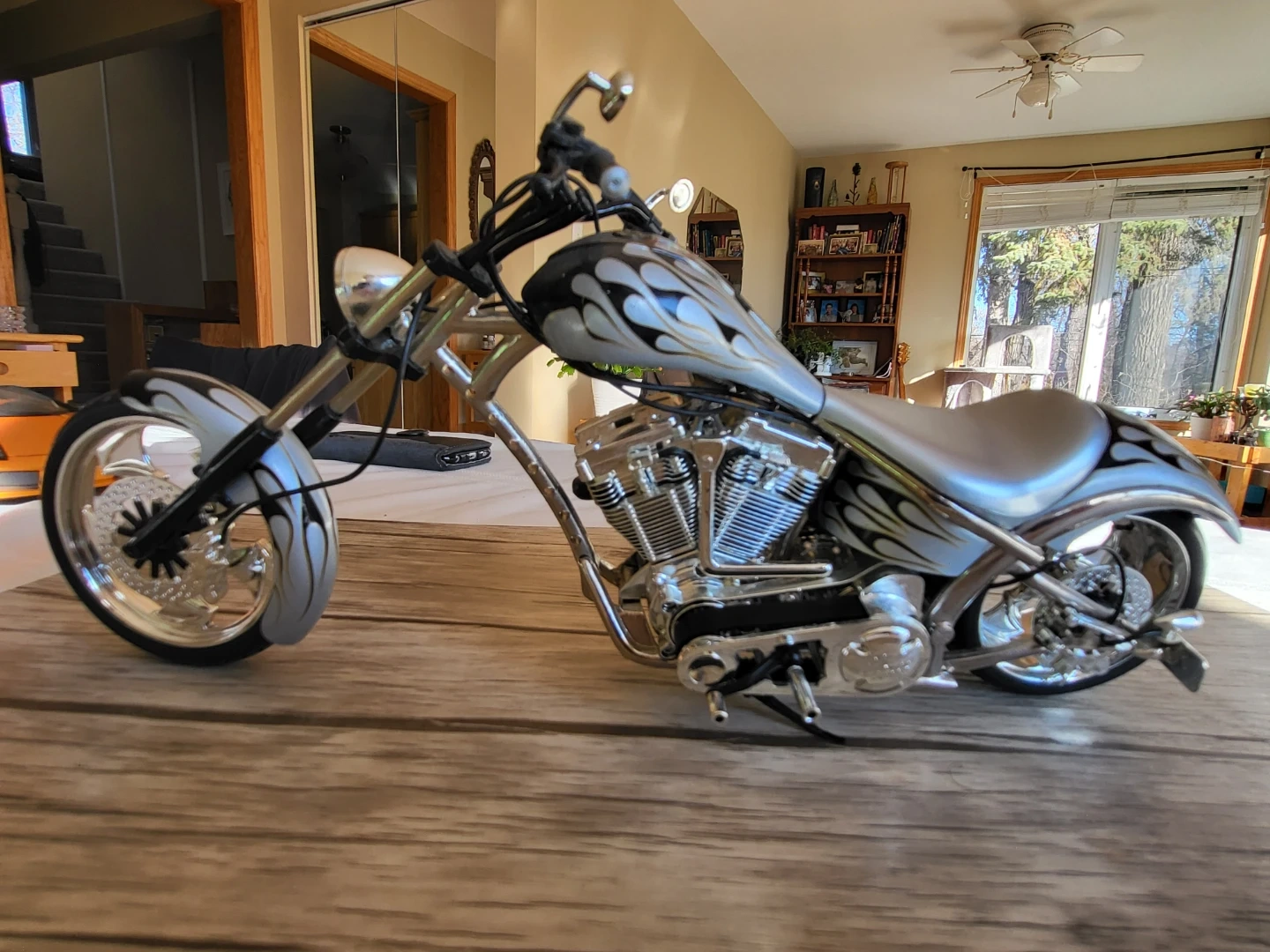 134Selling a cool custom chopper motorcycle diecast. It has a detailed design with a silver and black flame pattern. Great for collectors or as a unique decor piece!