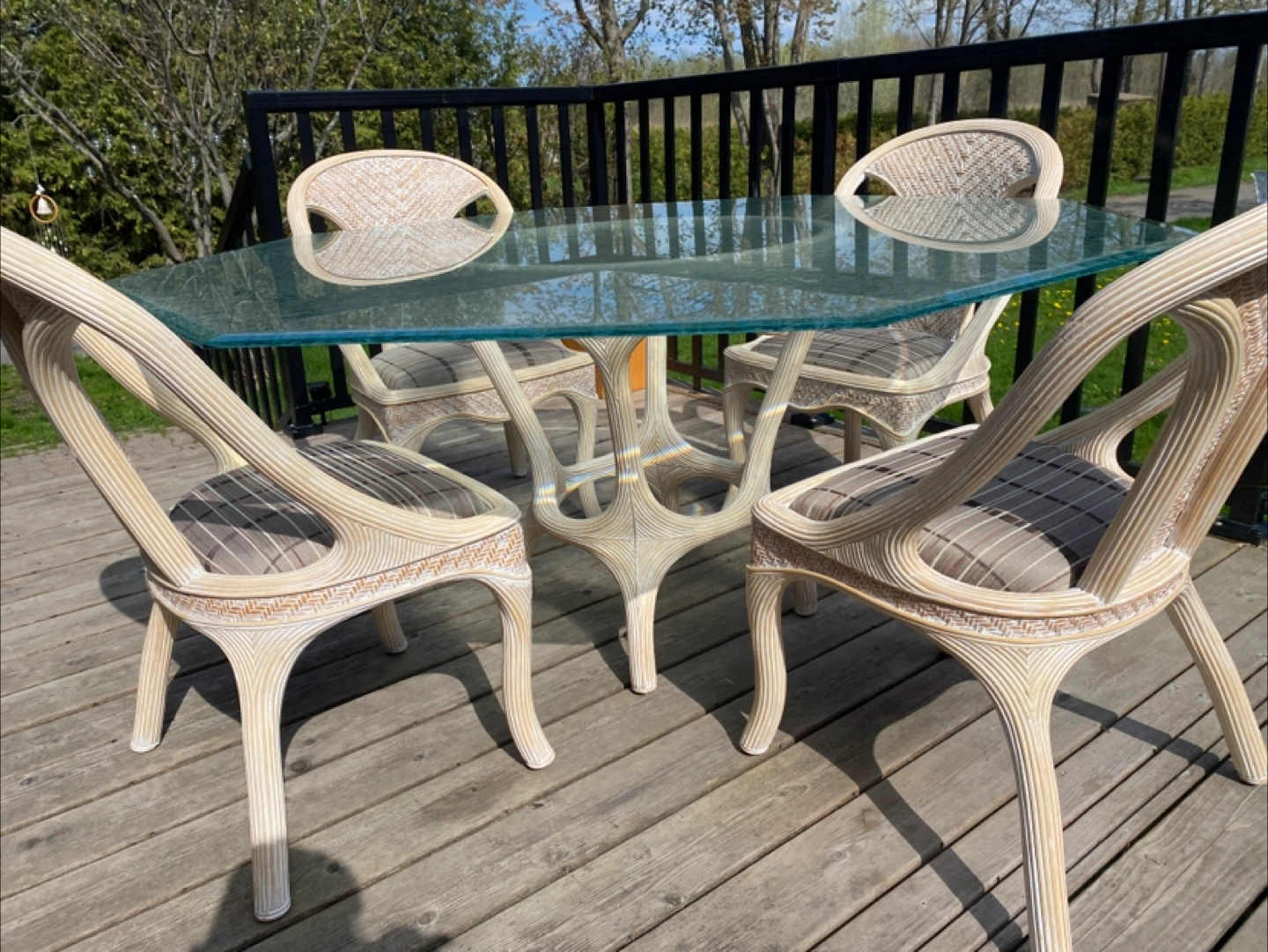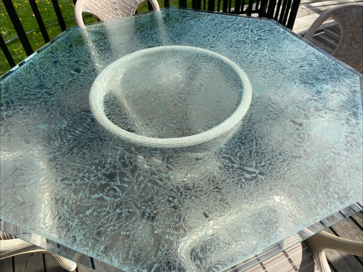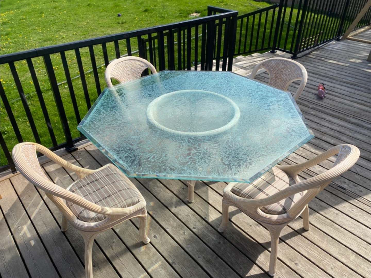 This stunning custom-made glass dining set is the perfect centerpiece! Featuring a large glass top with intricate floral designs, this one-of-a-kind table brings elegance and charm to any room. Glass Top alone was Over $1,000 New! 🌟CAN DELIVER FOR SMALL FEE🌟 PRICE: $350 OBO • Dimensions: L64” x W64” x H28.5” • Includes 4 light-colored upholstered chairs • Heavy, high-quality glass with etched floral detailing – truly unique! Pick up Barrhaven