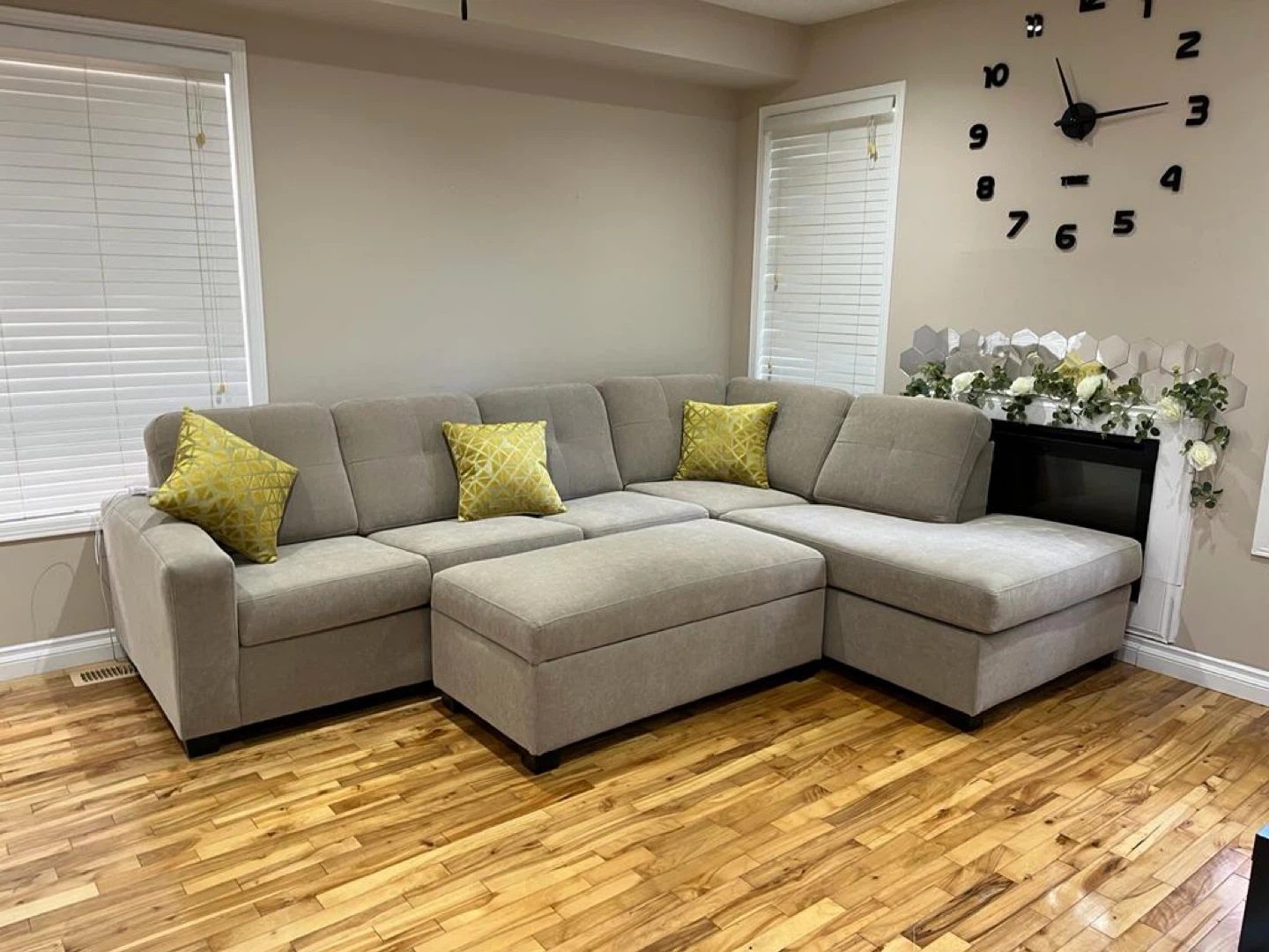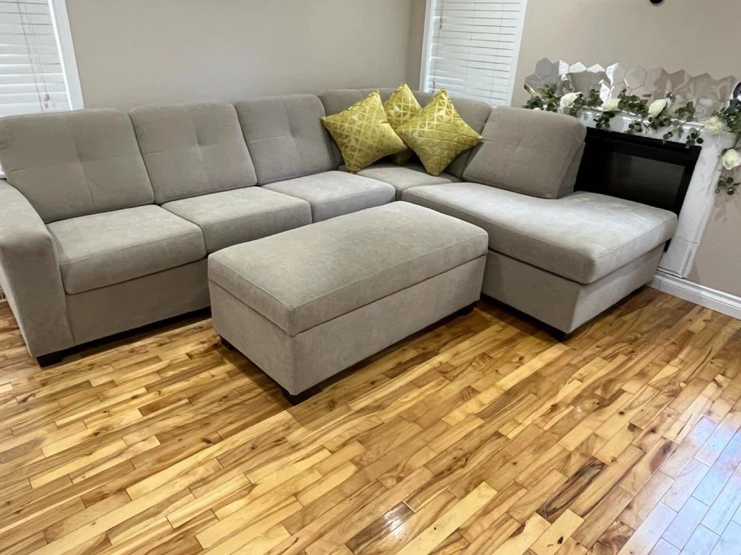 62Custom-made. Strong build. Selling a comfy beige sectional sofa with a matching ottoman! It's in great shape and would be a perfect addition to any living room. The ottoman also provides extra storage space. It's a great spot to relax and unwind after a long day