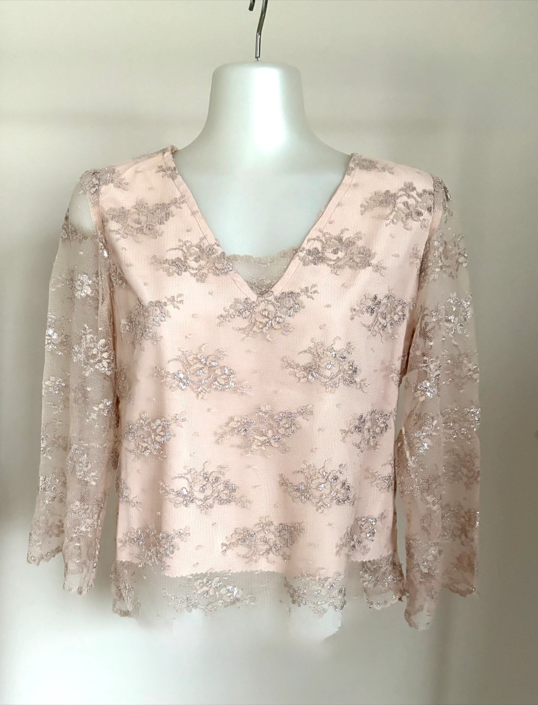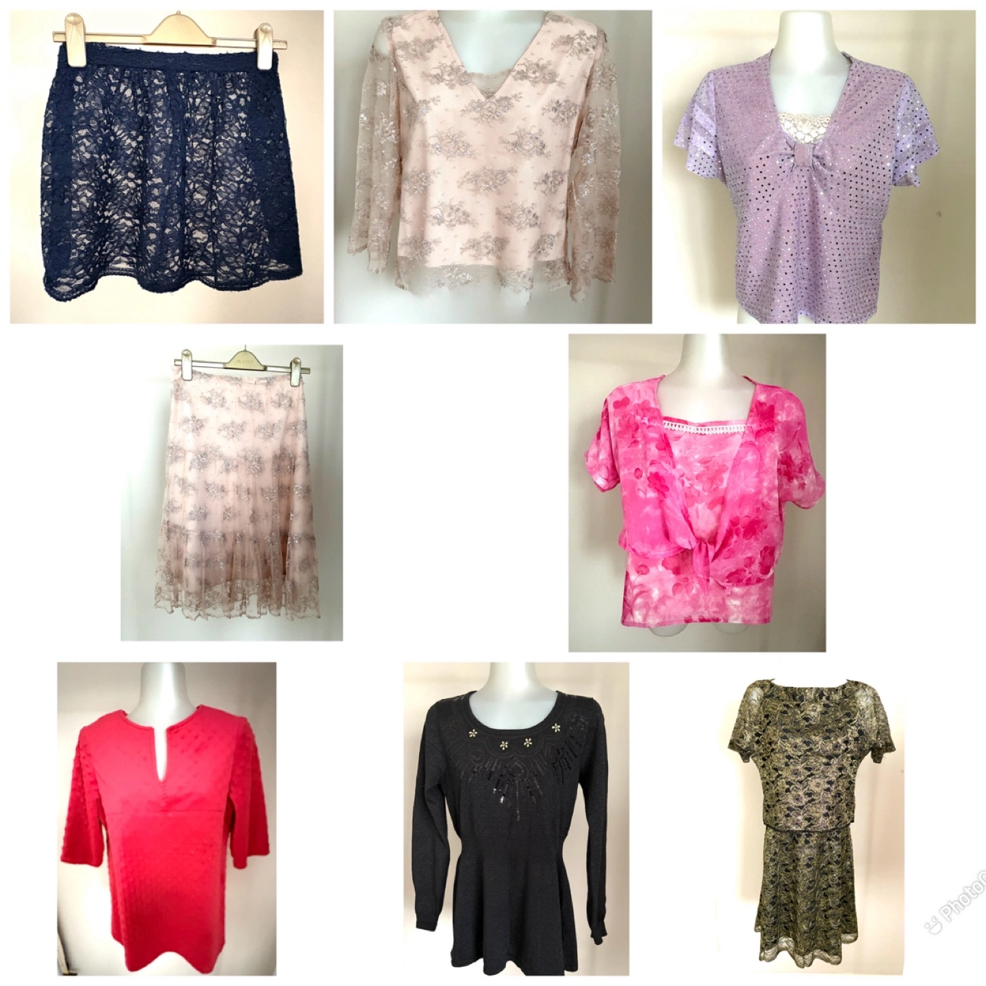 60Size Small A collection of assorted women's tops and a skirt. These items feature a variety of styles and embellishments, including lace, sequins, and floral patterns. Perfect for adding some flair to your wardrobe! All handmade for dancing class.