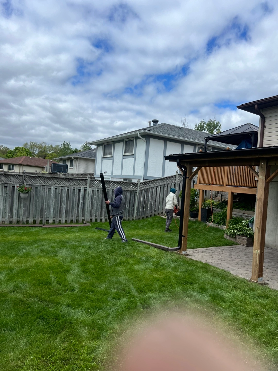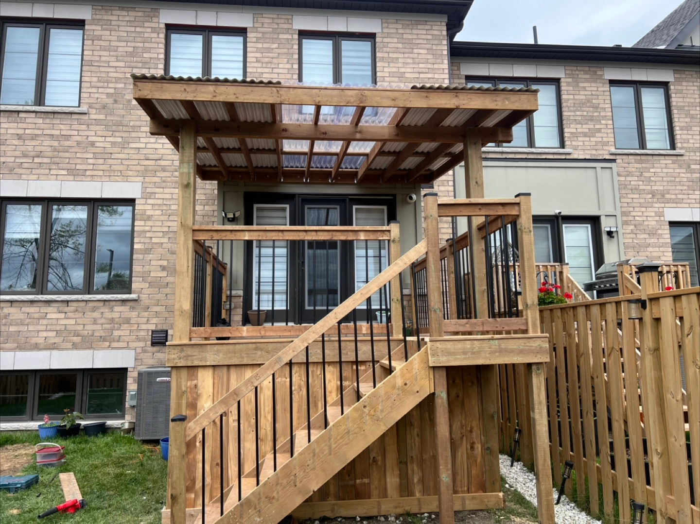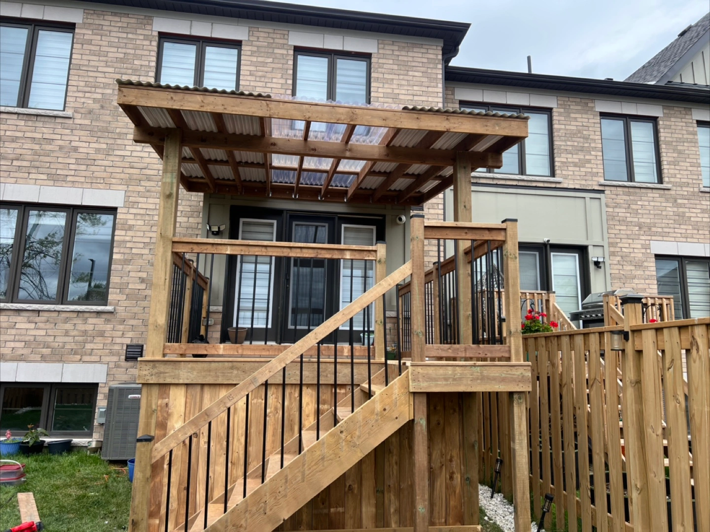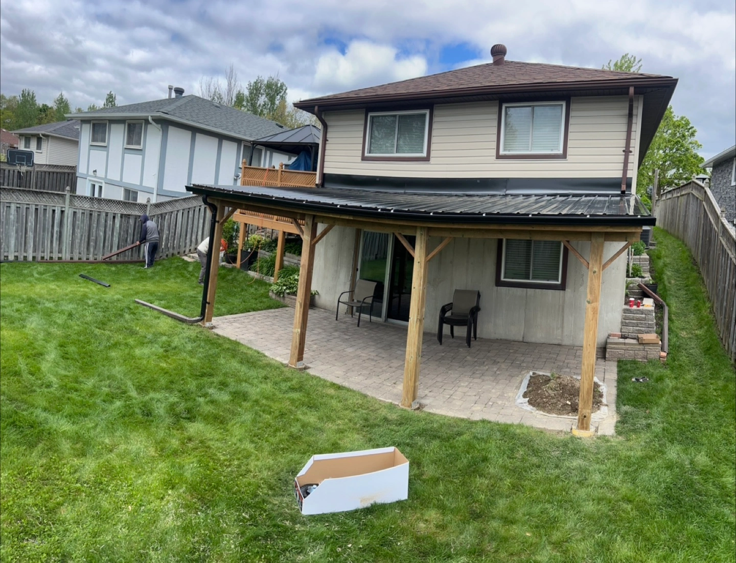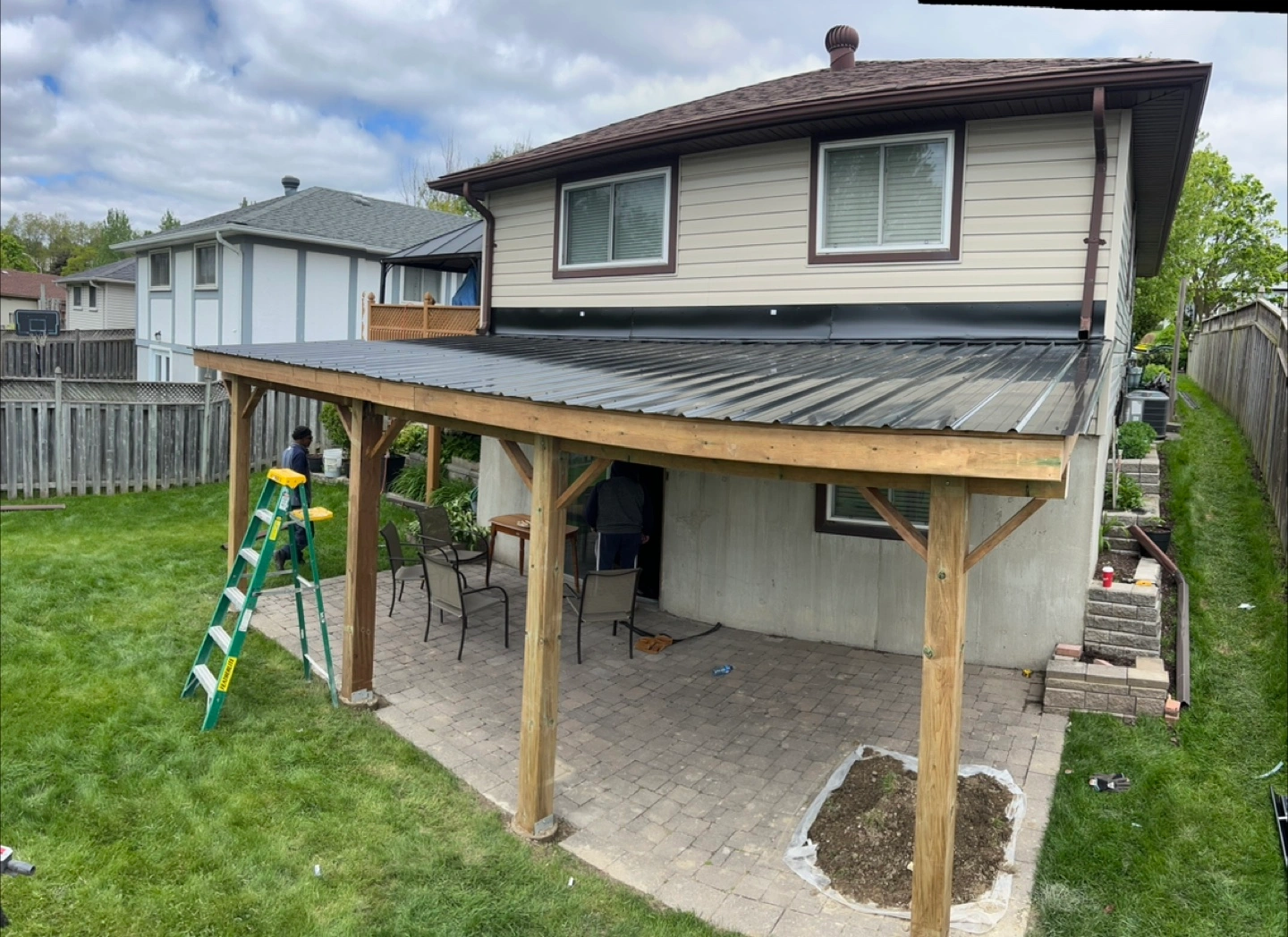 20Offering a custom-built pergola, perfect for relaxing and enjoying the outdoors. Featuring a wooden structure with a corrugated metal roof. The pergola provides shade and shelter from the elements, suitable for a patio.