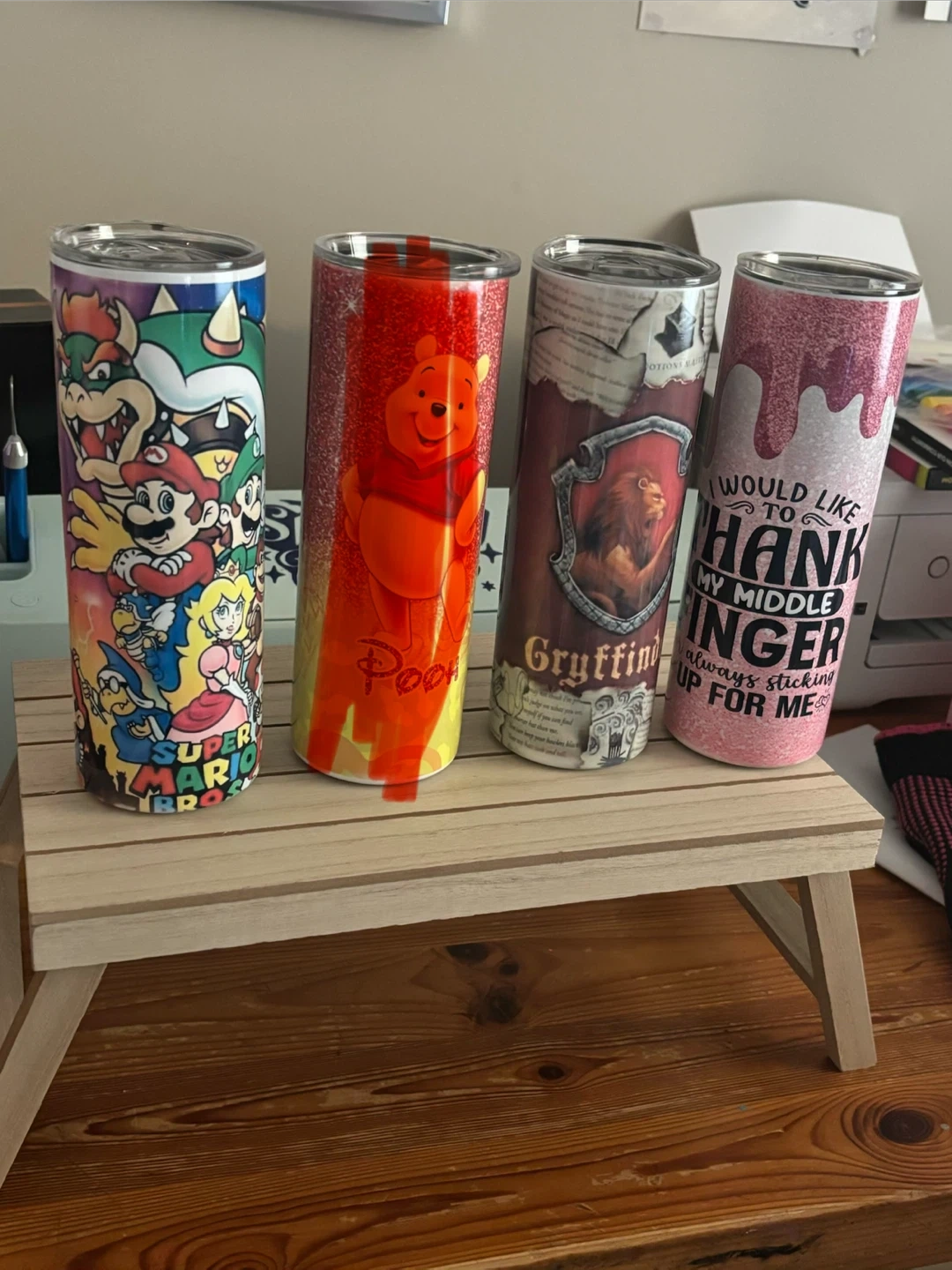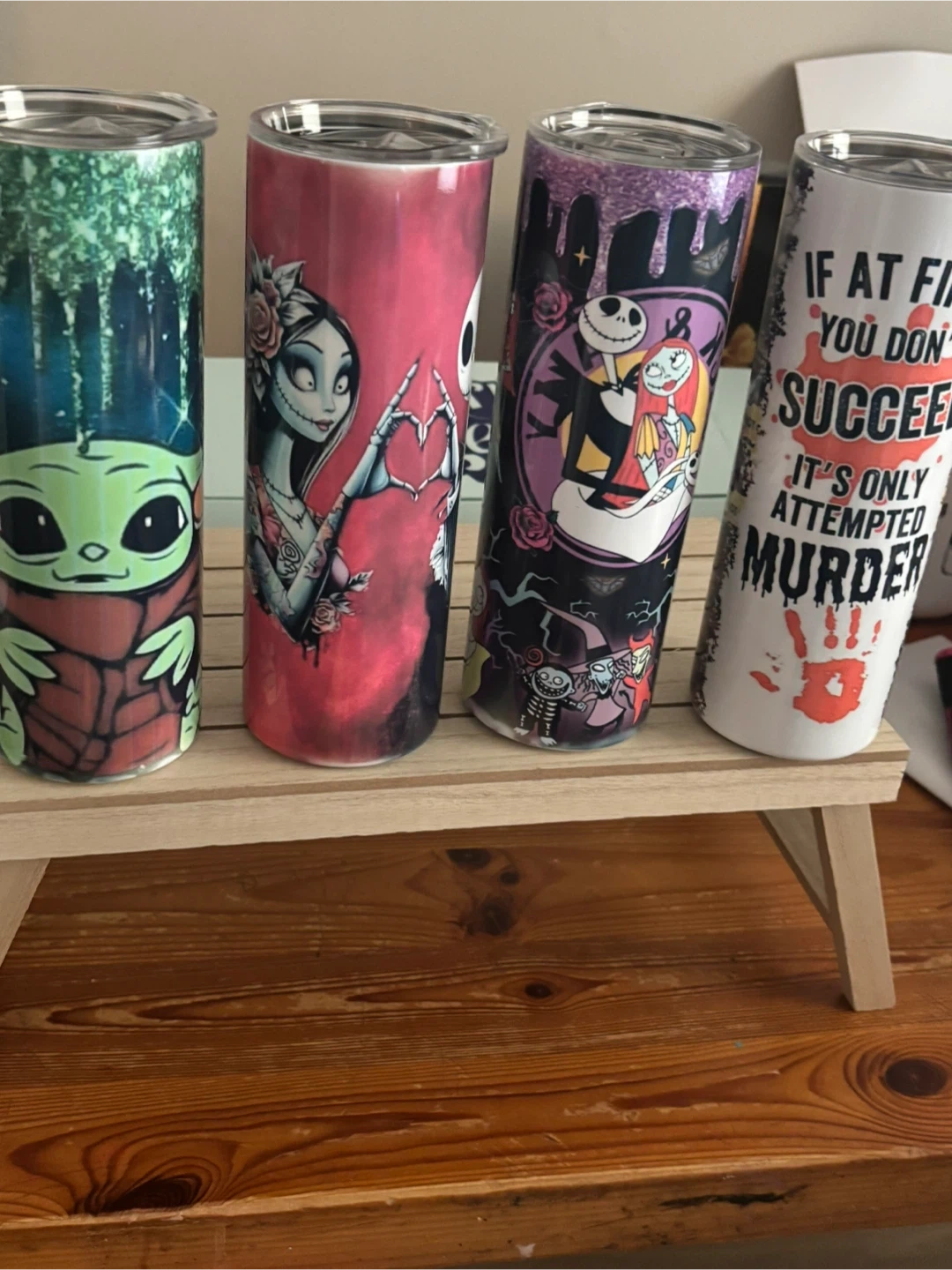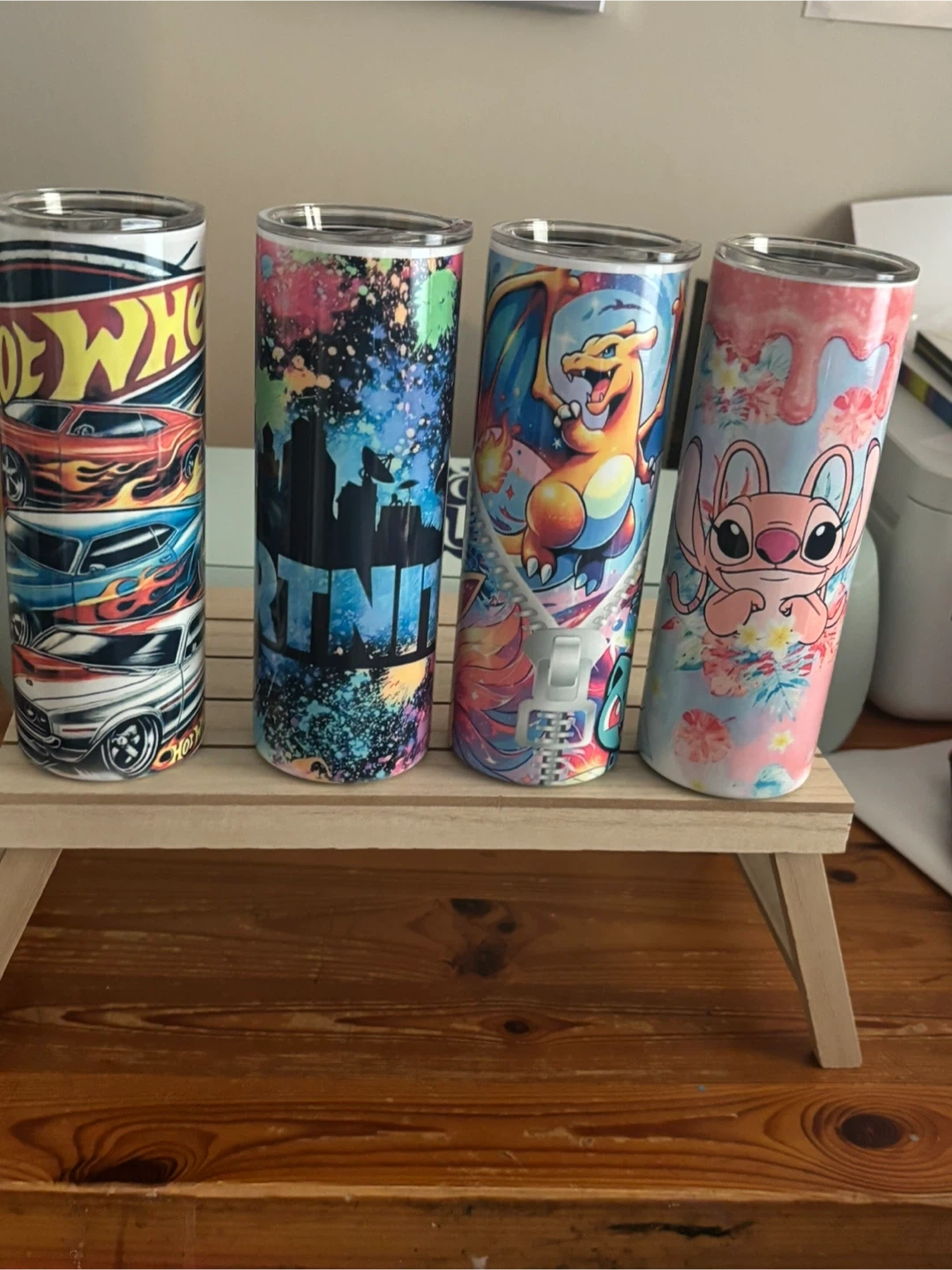 I have a variety of custom printed tumblers for sale. They feature fun designs like characters from movies, TV shows, and more! Great for keeping your drinks hot or cold on the go. Perfect for fans of all ages!