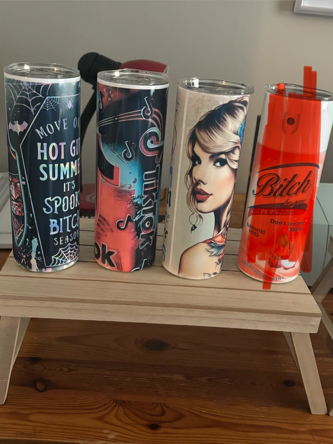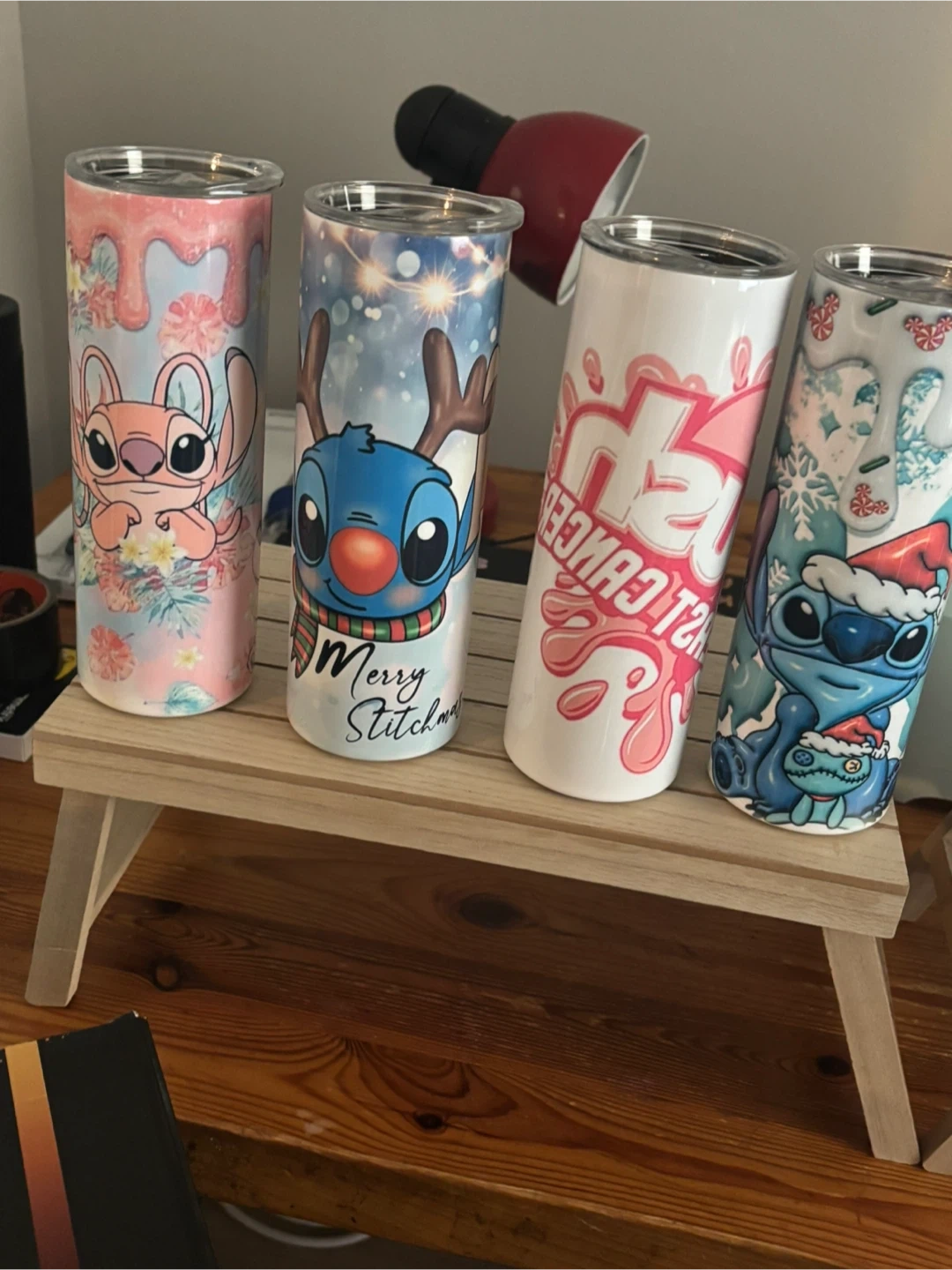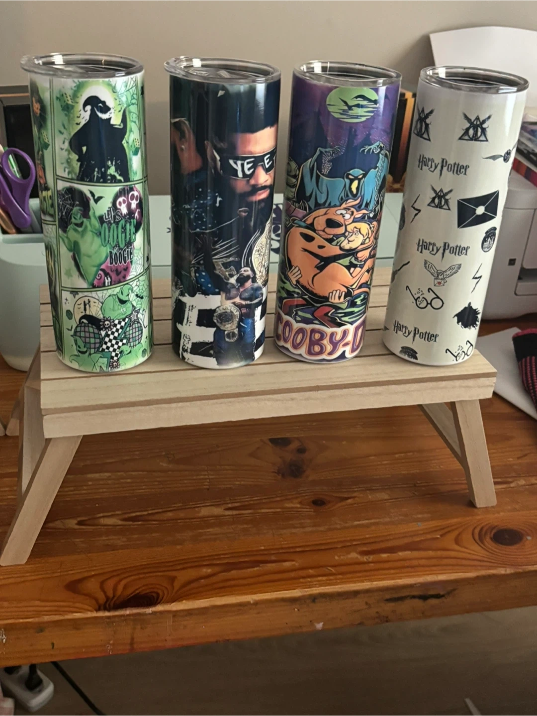 I have a variety of custom printed tumblers for sale. They feature fun designs like characters from movies, TV shows, and more! Great for keeping your drinks hot or cold on the go. Perfect for fans of all ages!