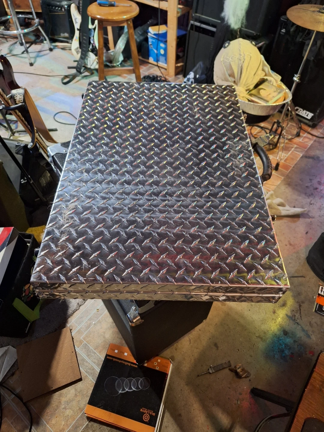 15Selling a custom-built road case with a diamond plate top. It measures approximately 30 inches by 20 inches and stands about 3 inches thick. Perfect for storing and transporting your gear!